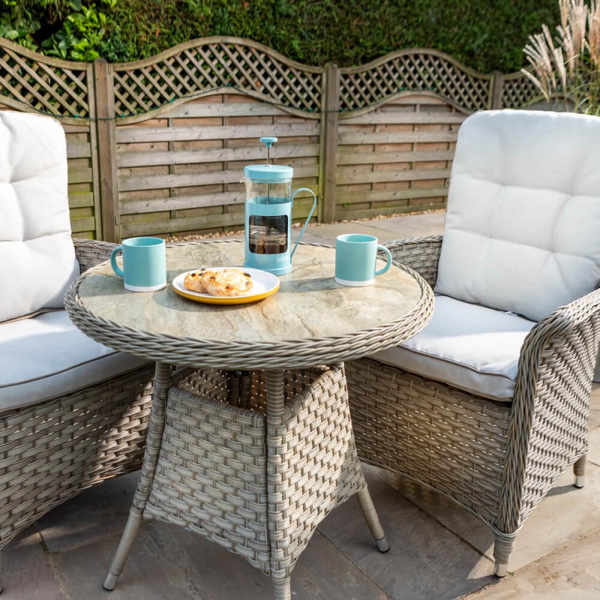 Set consists of:. About:. Perfect for enjoying the sun while sitting on a patio or porch, the 2021 Hartman Heritage Garden Bistro Set includes a round bistro table with a durable attractive recessed Tuscan ceramic glass table top, two outdoor dining chairs and 2 Weatherready® light shower resistant cushions. While the chairs are delivered fully assembled, the table does require some simple top and base assembly. Made from a hand-woven resin weave over an aluminium frame, this patio bistro set is incredibly hardwearing and remarkably durable. The same can be said of the Weatherready® cushions which repel light showers and allow heavier deluges to pass completely through it’s permeable layers over time, conveniently naturally drying in line with local conditions, however we recommend that they are kept indoors over winter or during prolonged periods of non use. Protect your Hartman furniture further with the specific fitting weather-resistant polyester protective cover, visit the link below to see this, purchased separately:.