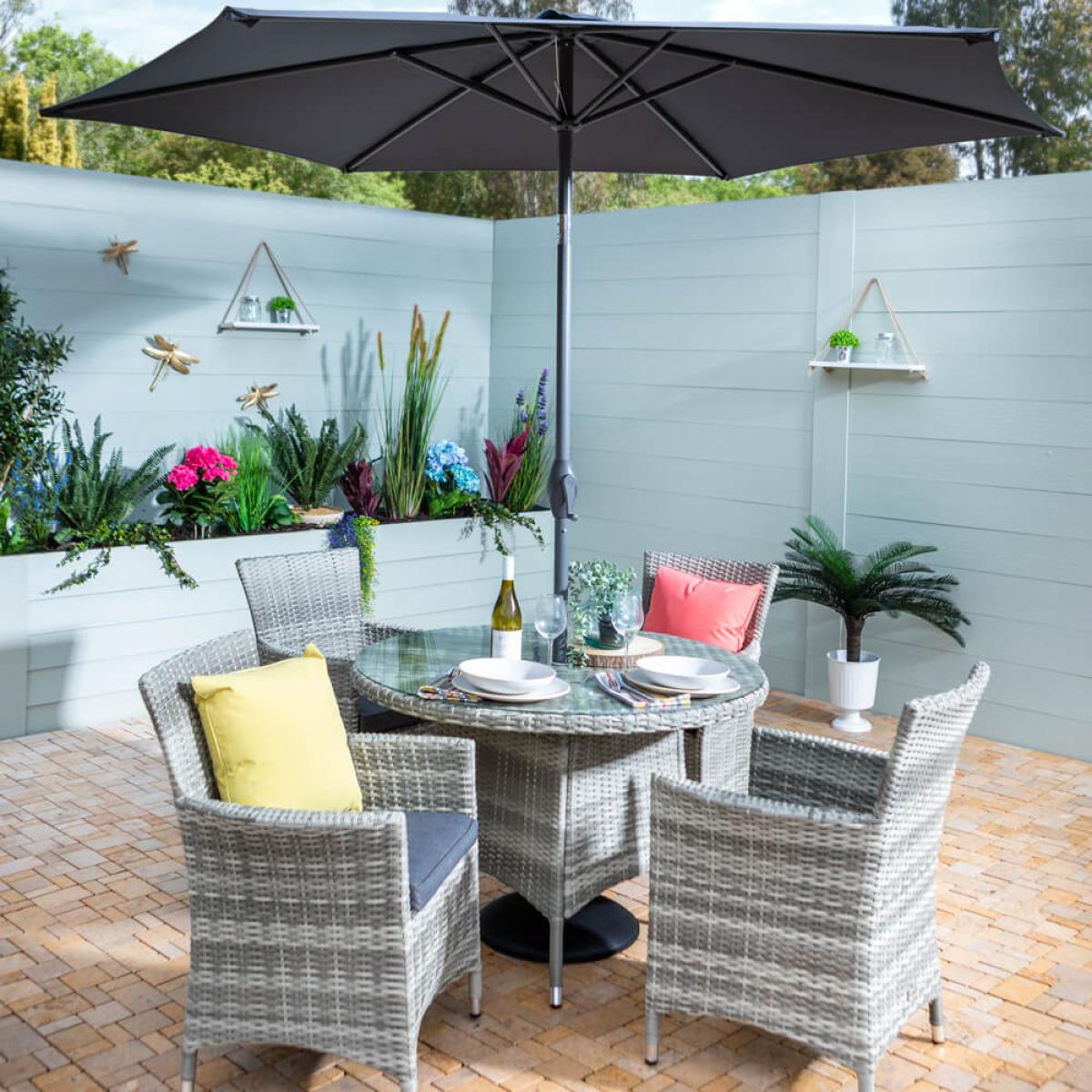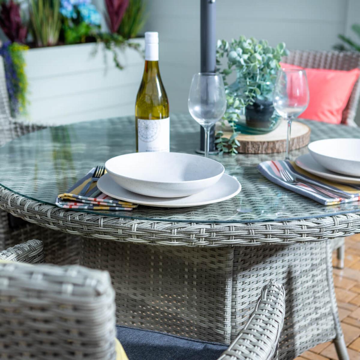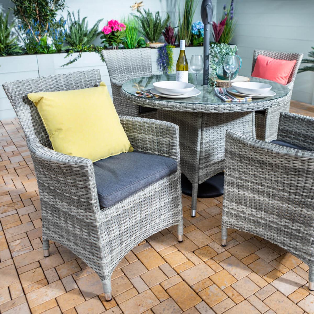Set consists of:. About:. Garden hosting will come easy this year with the Hartman Westbury range, an elegant collection of garden classics with touches of modern garden design in abundance. The Westbury 4 seat Garden Dining patio garden furniture set comes with a handy 2. 5m wide parasol, that will deflect harmful UV rays but also light showers. 4 diners will spend hours enjoying food drink and company in the outdoors on the deep high back Westbury arm chairs. This Hartman furniture, like so many of their high quality ranges, this too comes in fully wrapped synthetic rattan weave, a material that looks especially lovely in the ash grey chosen for this 4 seat garden furniture. This wicker is entirely repellent against moisture so will deal with British and Irish climate challenges. However, to best protect this set during the winter months protective covers are worth considering, see details of these beneath this description. This weave is wrapped tightly around lightweight yet sturdy aluminium frames, which means it’s incredibly easy to move this furniture around as required. These frames will remain completely rust free. This outdoor patio set comes with a sociable round table that’s topped with a sleek tempered glass surface, a material that’s been built to withstand with anti marking properties and remains incredibly easy to clean – just use a damp cloth to wipe down when the need arises. High rise garden armchairs are equipped with Hartman’s very own Weatheready® seat cushions. This spongey innovative design cushions are equipped to deal with light showers and flash downpours. Should anything more prolonged or heavier rear its head a semi-permeable membrane allows excess rain to simply pass through and drain right through the underside over time, and in line with local conditions. We do, however, still recommend storing in a cushion box when unused, and indoors come the colder winter months for best care. This garden dining furniture set will impress and become a reliant garden favourite for years to come. Protect your Hartman furniture further with the specific fitting weather-resistant polyester protective cover, visit the link below to see this, purchased separately:.