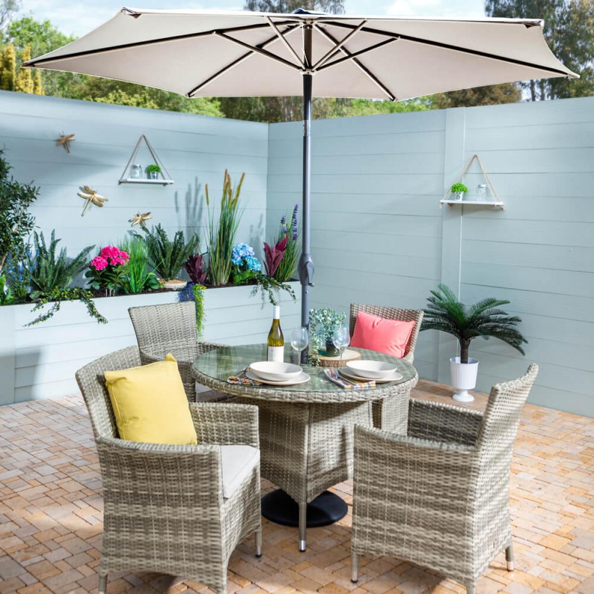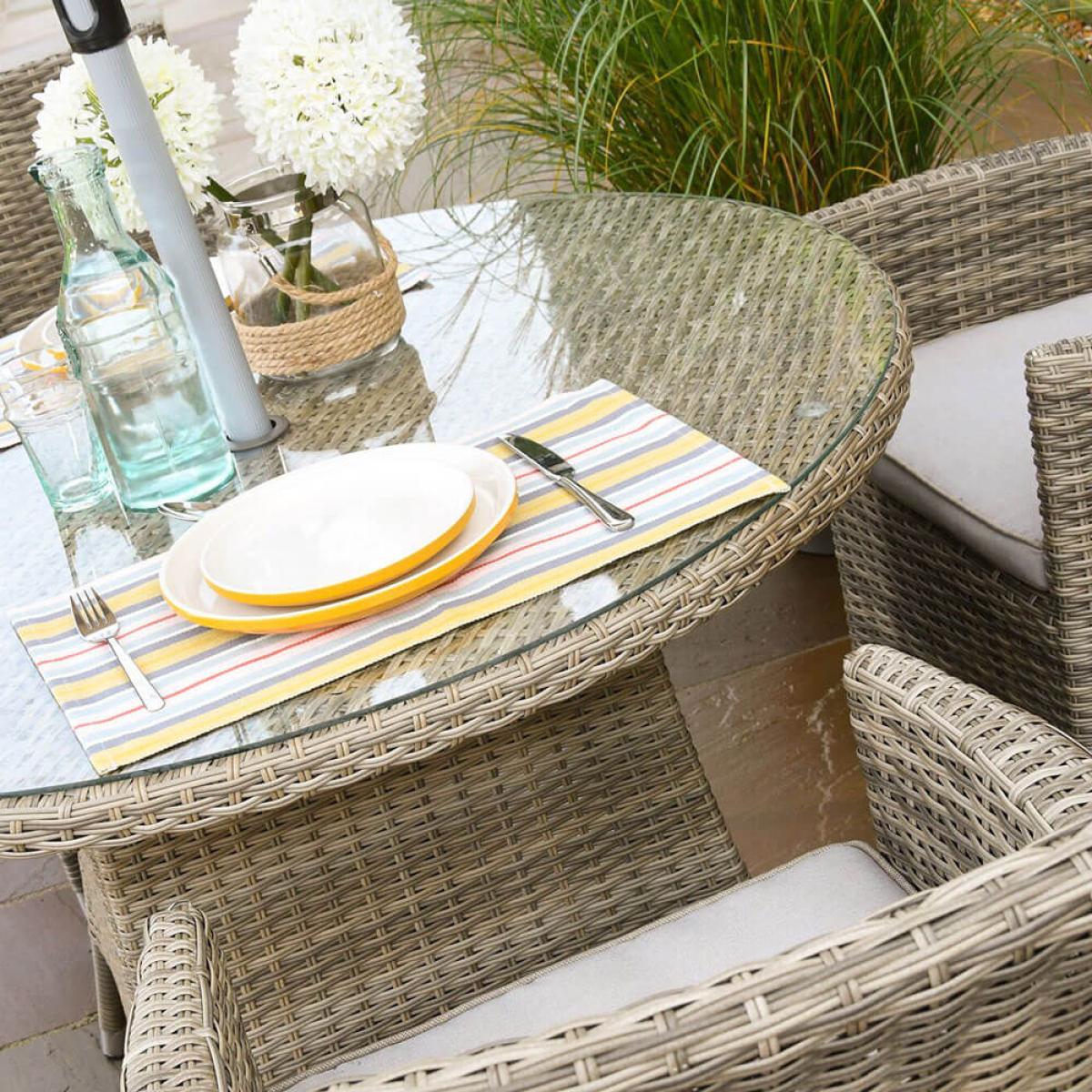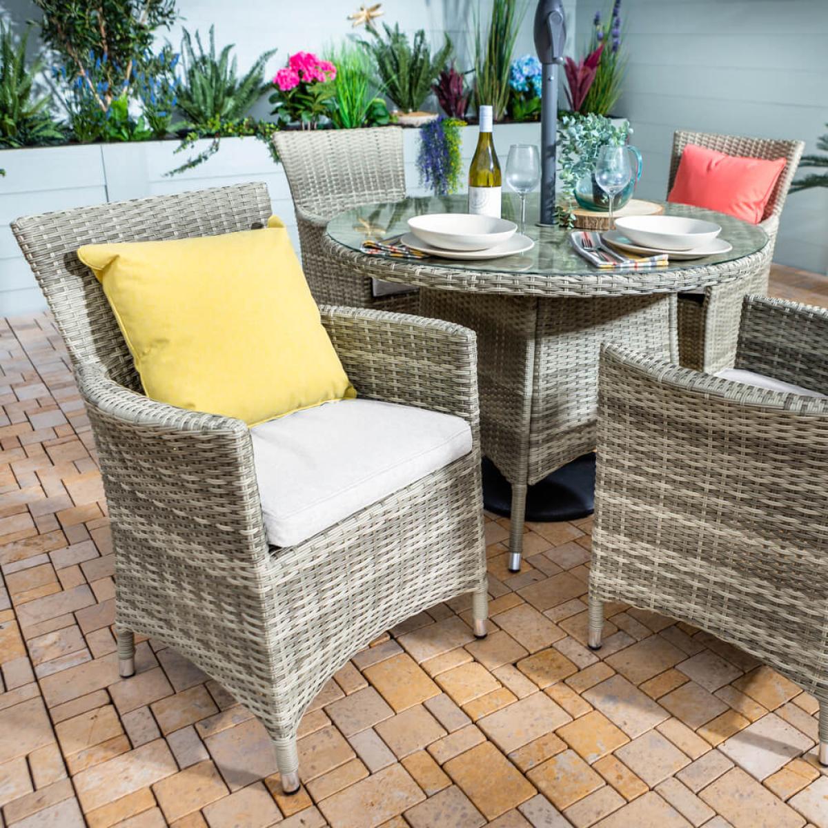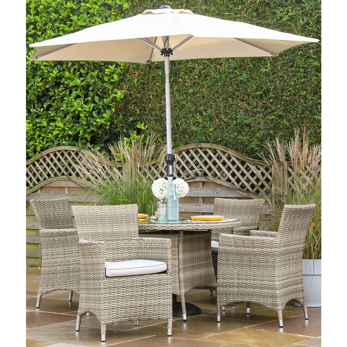 Set consists of:. About:. Serve breakfast, lunch or dinner for 4 people on this comfortable rattan dining set. This attractive garden furniture set is part of Hartman’s Westbury range and pleasingly strikes a balance with high quality and price. A Beech shade rattan weave provides not only sandy neutral looks but a hard-wearing material that means this rattan garden dining set can face the elements. The material easily copes with rain as well as sunshine with inbuilt UV stabilising properties. However, to best protect this set during the winter months protective covers are worth considering, see details of these beneath the description below. A tasteful 74cm tall table, made from the same composite is topped with a durable tempered glass surface that runs to the edges of the circular table. The centrally standing shade parasol comes with a solid concrete base, which means wind is never an issue. The sun parasol is the same dove colour found on the cushions and retains water-resistance as well as much needed UV repelling cover for your garden gatherings. A lightweight aluminium frame supports the entire 4 seat garden set, this frame ensures strong support and will remain rust-free. High rise garden armchairs are not just supportive but comfortable, accompanied by 4 plush Weatheready® cushions. These spongey innovative design cushions are equipped for wet weather with a semi-permeable membrane that deflects showers but allows heavier deluges to simply drain right through the underside over time, local conditions allowing. We still recommend storing indoors during the colder winter months. This delightful and resilient outdoor dining furniture would suit many homes and will be great for years to come. Protect your Hartman furniture further with the specific fitting weather-resistant polyester protective cover, visit the link below to see this, purchased separately:.