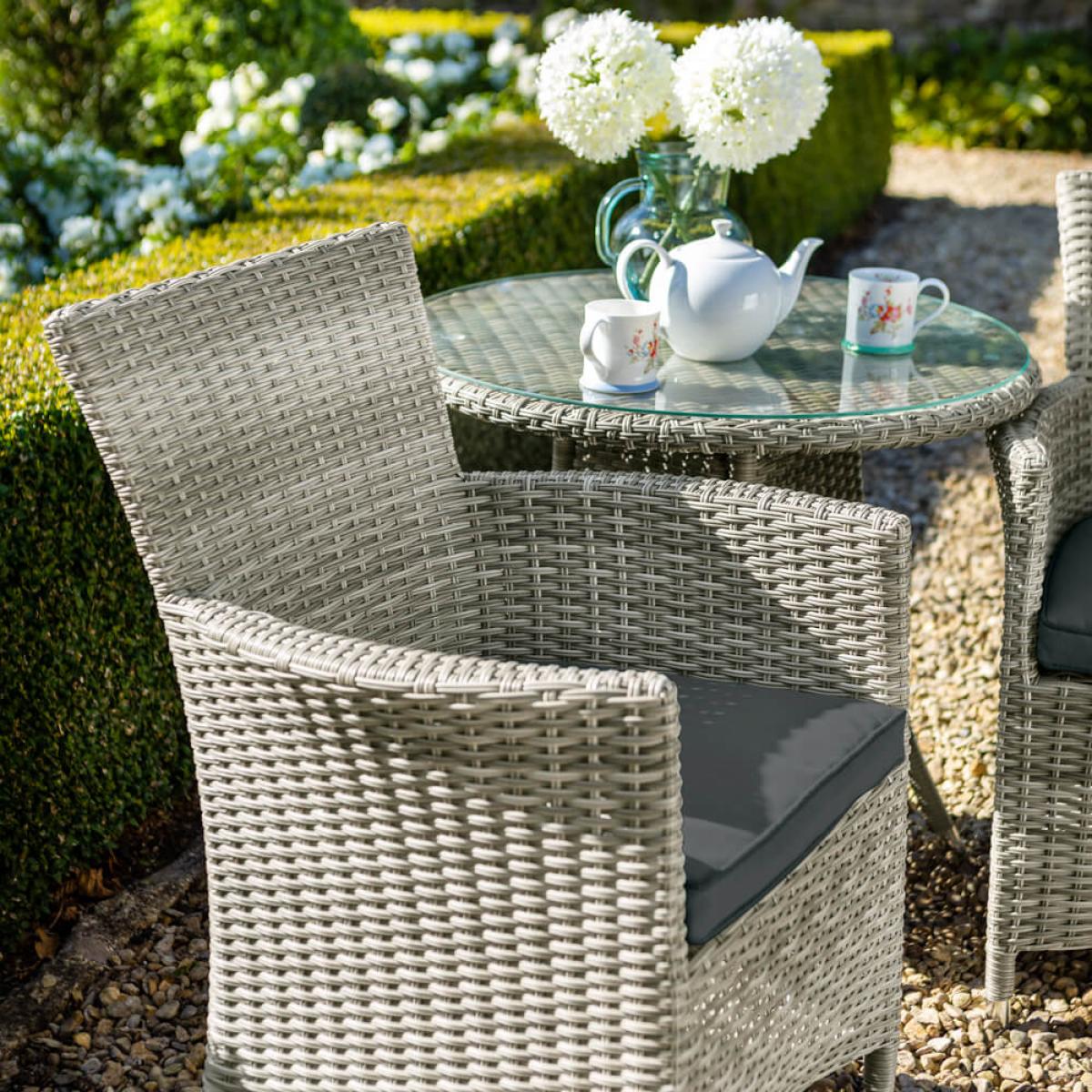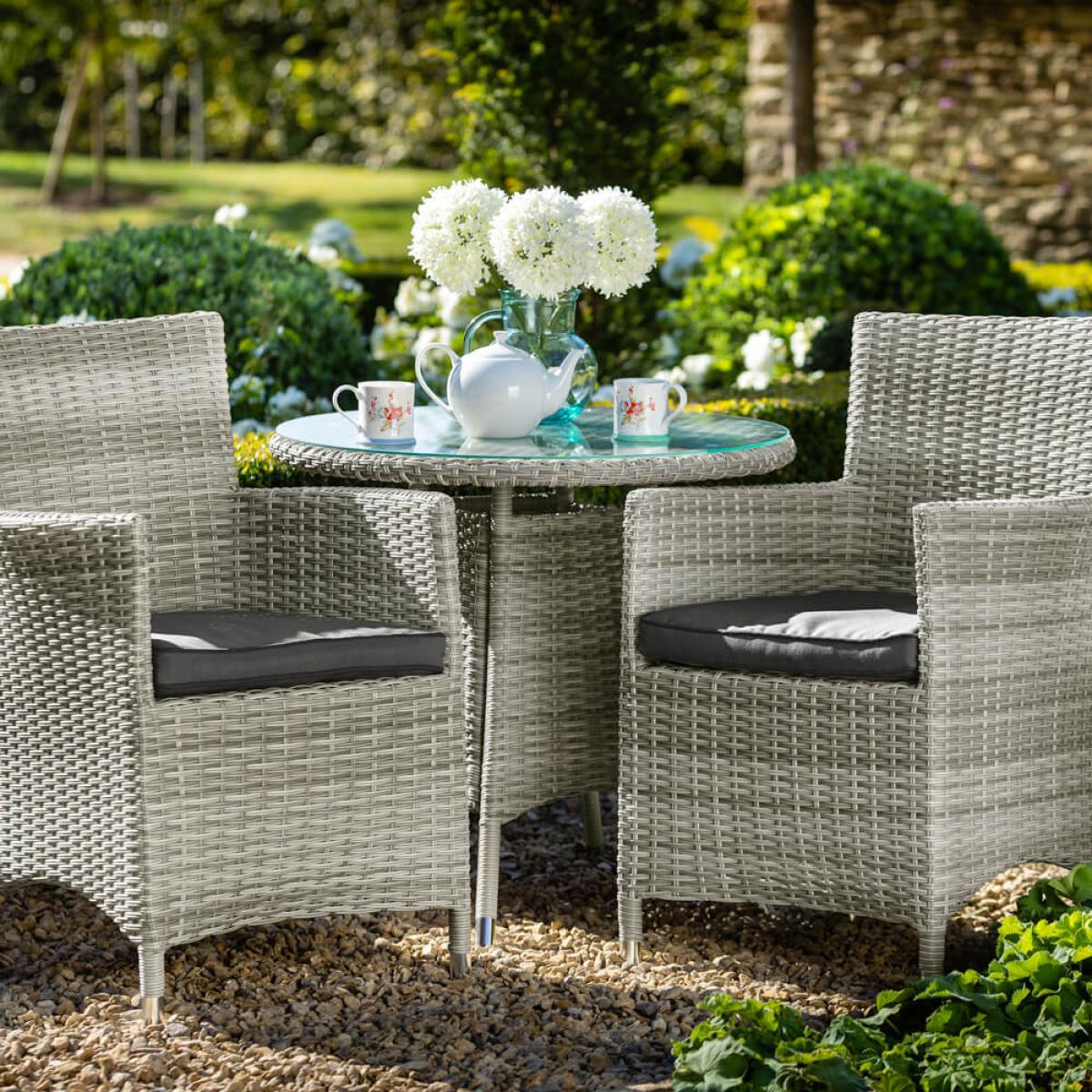 Set consists of:. About:. Two can ease away the hours on the Hartman Westbury Bistro Set, a delightful outdoor patio set constructed primarily from synthetic rattan weave. Spend time enjoying the outdoors as a duo sat on these deep seated chairs with wide weave armrests. This Hartman garden furniture will prove a lovely addition to many people’s outdoor spaces with an ash grey wicker that’s extremely versatile so will suit many patios, balconies, deckings or lawns. The weave is bound around incredibly strong aluminum frames that are also lightweight so can be moved around with ease, and completely stand up to rust. The rattan itself is entirely weather repellent meaning these chairs can be kept out year round with little maintenance needed. The Westbury represents a patio bistro set that’s as good looking as it is functional. The round table comes with a tempered glass table top which looks fabulous but also boasts anti marking properties and is very easy to wipe clean, just use a damp cloth, this too will deal with the outdoors expertly. This table is a handy 70cm in height for optimal elevation for placing drinks and snacks. This Hartman furniture has a Weatherready® technology inbuilt. This innovative fabric moisture management system means light showers will be deflected easily, whilst in heavier deluges the purposely permeable inner layers are designed to let it run through and drain, over time, through the underside and in line with local conditions. We recommend storing these cushions in the winter months for best care. This patio garden furniture will likely become a much loved setting for mornings, afternoons and everything in between well spent. Protect your Hartman furniture further with the specific fitting weather-resistant polyester protective cover, visit the link below to see this, purchased separately:.