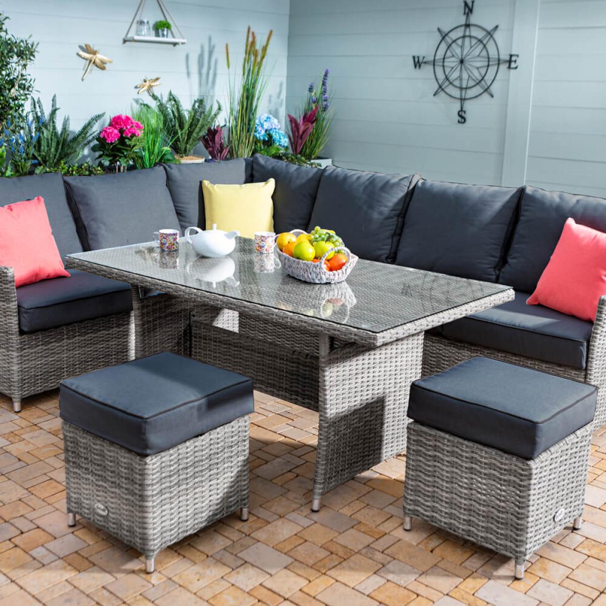 Set consists of:. About:. Hartman have long been garden furniture leaders and with the Westbury range they have made sure to fulfill all the essential lounging and dining needs of the garden, with added touches of elegance and design never far away. The Hartman Westbury Rectangular Casual Dining Set is no exception providing leading garden dining and comfort for this coming season. This is a large garden dining sofa set that’s given an enviable long right sofa configuration, meaning the sofa extends pleasingly to 242cm at its longest side, ample room for one to completely splay out should the need arise. The two seater shorter side and accompanying stools boost this impressive patio garden furniture to seat up to 7 people. Enjoyable shades of ash grey are contrasted with the chosen slate grey of the cushioning. Both offer functionality as well as looks. This rattan patio furniture benefits from the synthetic weave with an integral moisture repellency inbuilt, meaning it will stand up to unpredictable climates. However, to best protect this set during the winter months protective covers are worth considering, see details of these beneath the description below. Whereas the cushions come equipped with Weatheready® tech meaning they can repel light showers and flash downpours, whilst in heavier deluges excess rain will simply pass through the cushion’s purposely permeable inner layers and out through the cushions’ underside, drying over time and in line with local conditions. For best care, we still recommend storing these cushions during winter. The mini cube shaped stools allow a freedom of configuration so can be freely moved and placed around the generous table. This rattan dining set benefits from the 70cm tall table meaning it’s a surface that’s the perfect size to host casual garden dining, nibbles, drinks and everything in between. With the independent stools there is even room for one or two more seats to be added to this setup for additional diners if needed. A tempered glass table top is lavish and not only provides looks to this patio dining set, but also durability with an anti marking quality inbuilt, whilst it’s very easy to wipe clean. The aluminium frame is lightweight and simple enough to move about your outdoor space plus will remain completely rust free. We envisage many sunny memories shared around this outdoor patio set. This Hartman furniture set can be further protected with specific hardwearing furniture covers:.