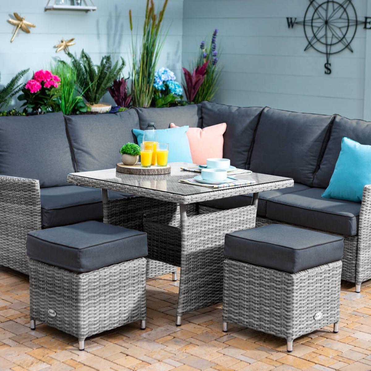 Set consists of:. About:. There will be time to dine and relax when sat on the Hartman Westbury Square Corner Lounge Set. An outdoor sofa set with versatility and appeal of use at its core. The attractive ash shade rattan weave will allow this Hartman furniture to slide into many spaces favouring patios, decking and even conservatories. A compact shape is deceptively spacious, allowing 6 to sit around this rattan patio furniture. Whether casual nibbles or a evening sit downs are the occasion this adorable corner sofa set meets the demands. A 68cm tall table represents a new addition to this set giving that crucial versatility to dine when needed. This table is topped with a luxe feeling sleek anti marking tempered glass, it’s also very easy to clean – simply use a wet cloth to wipe clean. Two stools give an extra lease of freedom to this patio outdoor furniture, meaning these can be placed as preferred. These are topped with the same plump cushions found on the corner sofa, Hatman’s Weatherready® system is found with all the padding which is a system that actively repels light showers and flash downpours. If these cushions are caught in heavier deluges any water that makes it through will simply pass through purposely permeable inner layers and drain straight through the underside over time and in line with local conditions. Store these cushions indoors for the harsher, colder months. The weather proofing is even stronger when it comes to the rattan weave construction of this Hartman furniture, its synthetic fibres a totally resistant against moisture meaning it can deal with temperamental climates. However, to best protect this set during the winter months protective covers are worth considering, see details of these beneath the key features below. The lightweight yet strong aluminium frame will remain completely rust free. The nifty shape of this right angled square set means it will nicely slot into courtyards, nooks and patios where space is valued. This set can be further protected with specifically fitting hardwearing furniture covers found below:.