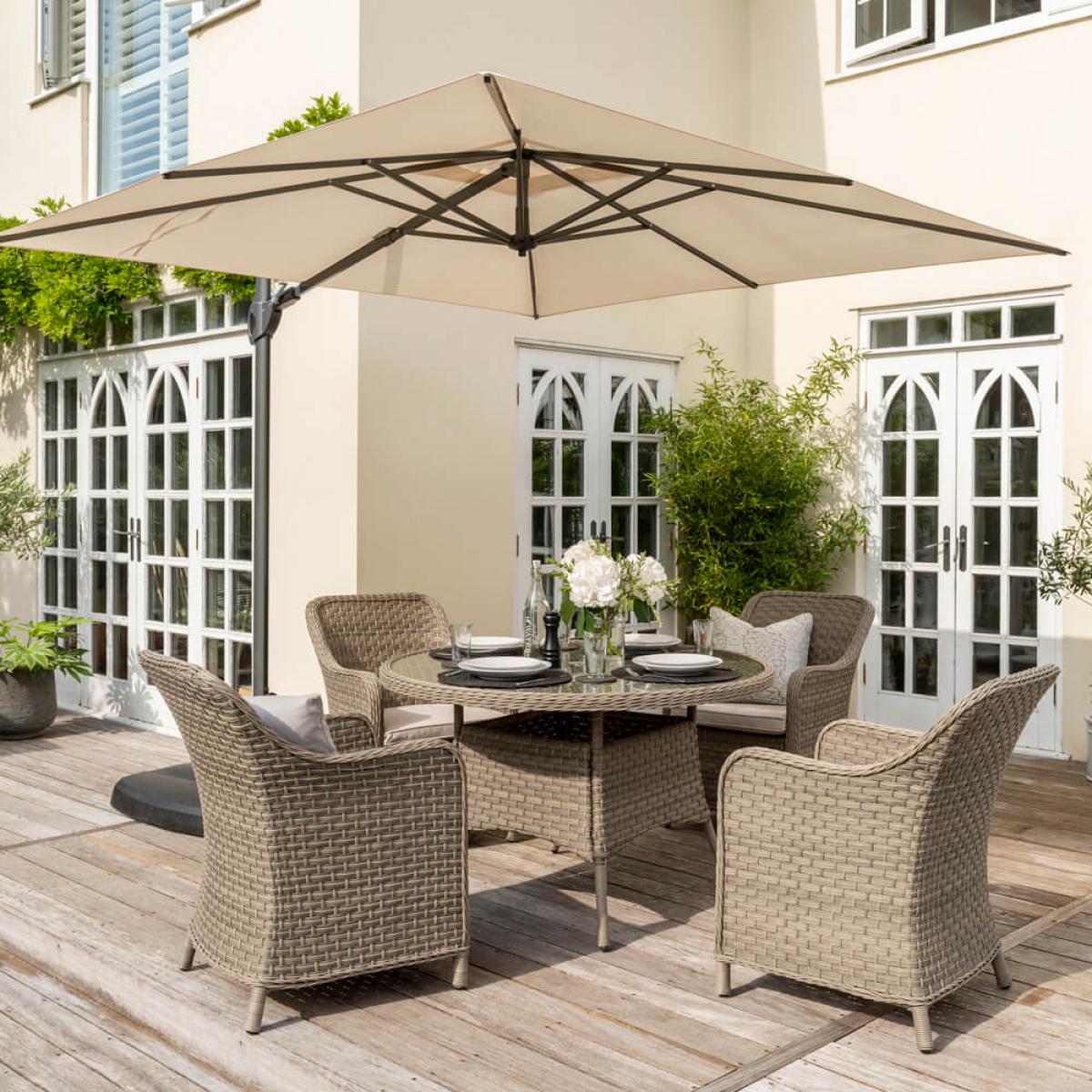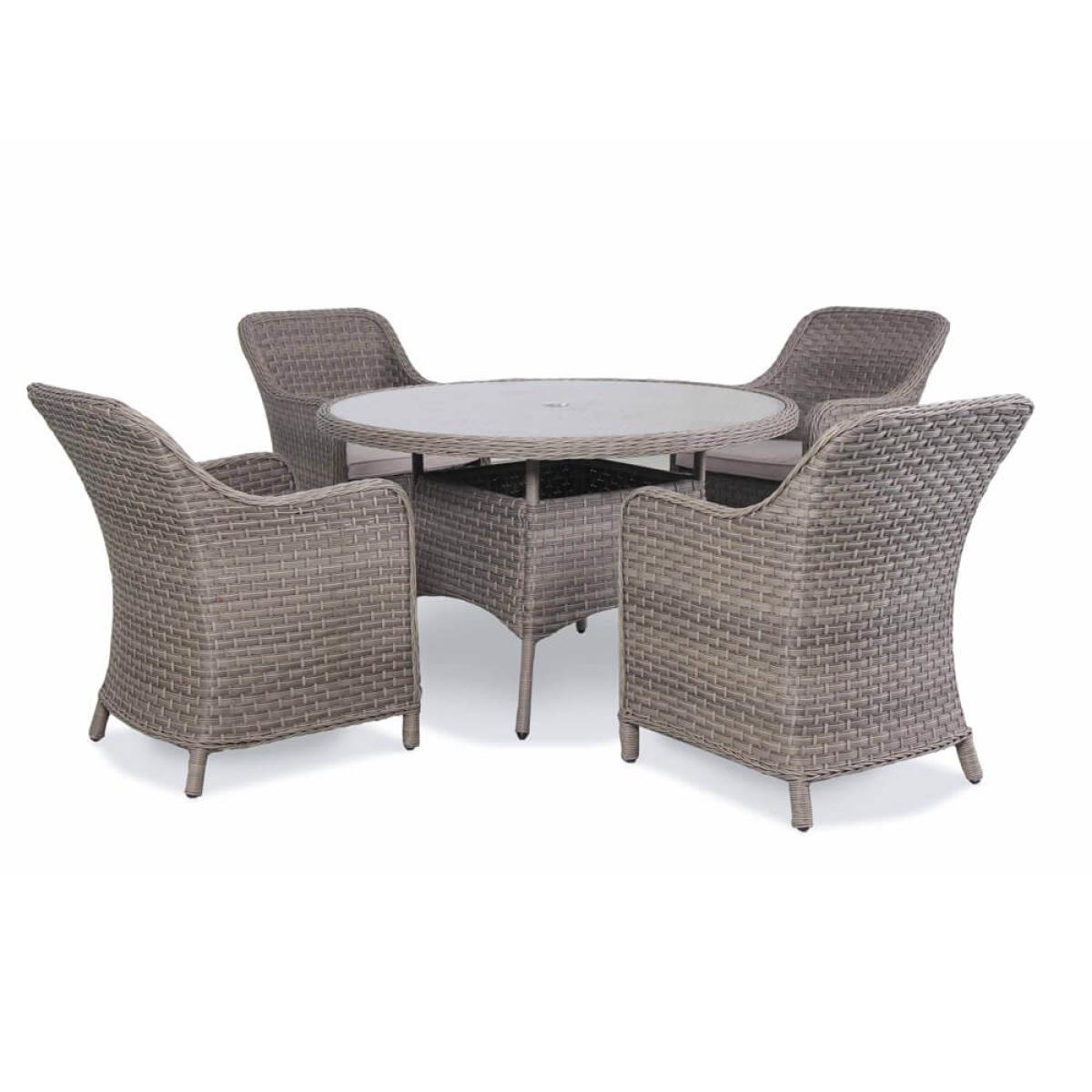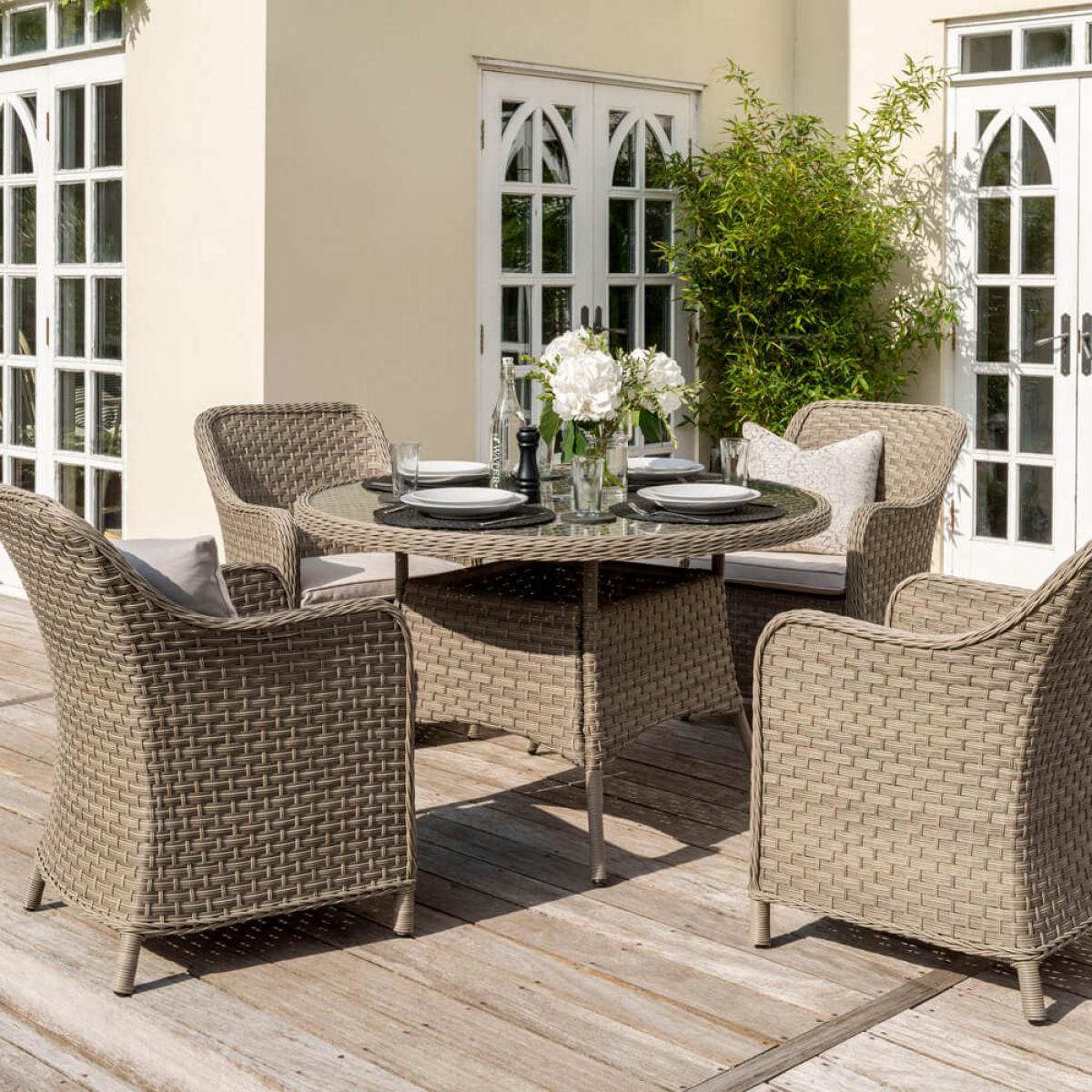 Set consists of:. *Please note parasol not included. *. About:. Introduce some classic-meets-modern garden dining with the attractive Kettler Charlbury 4 seat round dining table set, rattan patio furniture that will last for years and will doubtless become the setting for many great garden memories made. A lavish tempered glass 120cm round table top is elegantly sunken into the rattan constructed table, with a thicker band of the weave bordering the surface. This surface is easy to wipe clean and extremely durable. The oat shade synthetic rattan is completely repellent against moisture so this furniture will deal handily with poor weather days, store or cover in the winter months to guard against frost. The comfortable cream Charlbury cushions are able to fend off light showers and flash downpours, for the winter months we recommend storing these indoors. This rattan patio furniture seats 4 with the sizeable Charlbury armchairs, which are finished with thick band rattan bordering, which doesn’t just give a splendid look but gives a sizeable armrest to each chair. The armchair cushions will deal handily with light rain and flash downpours, but for best care these are to be stored indoors. This whole Kettler furniture range is built upon sturdy yet lightweight aluminium frames. Tasteful oat shade rattan means this delightful patio garden furniture will suit patios, decking and lawns. Kettler Charlbury 4 Seat Round Dining Set key features:.