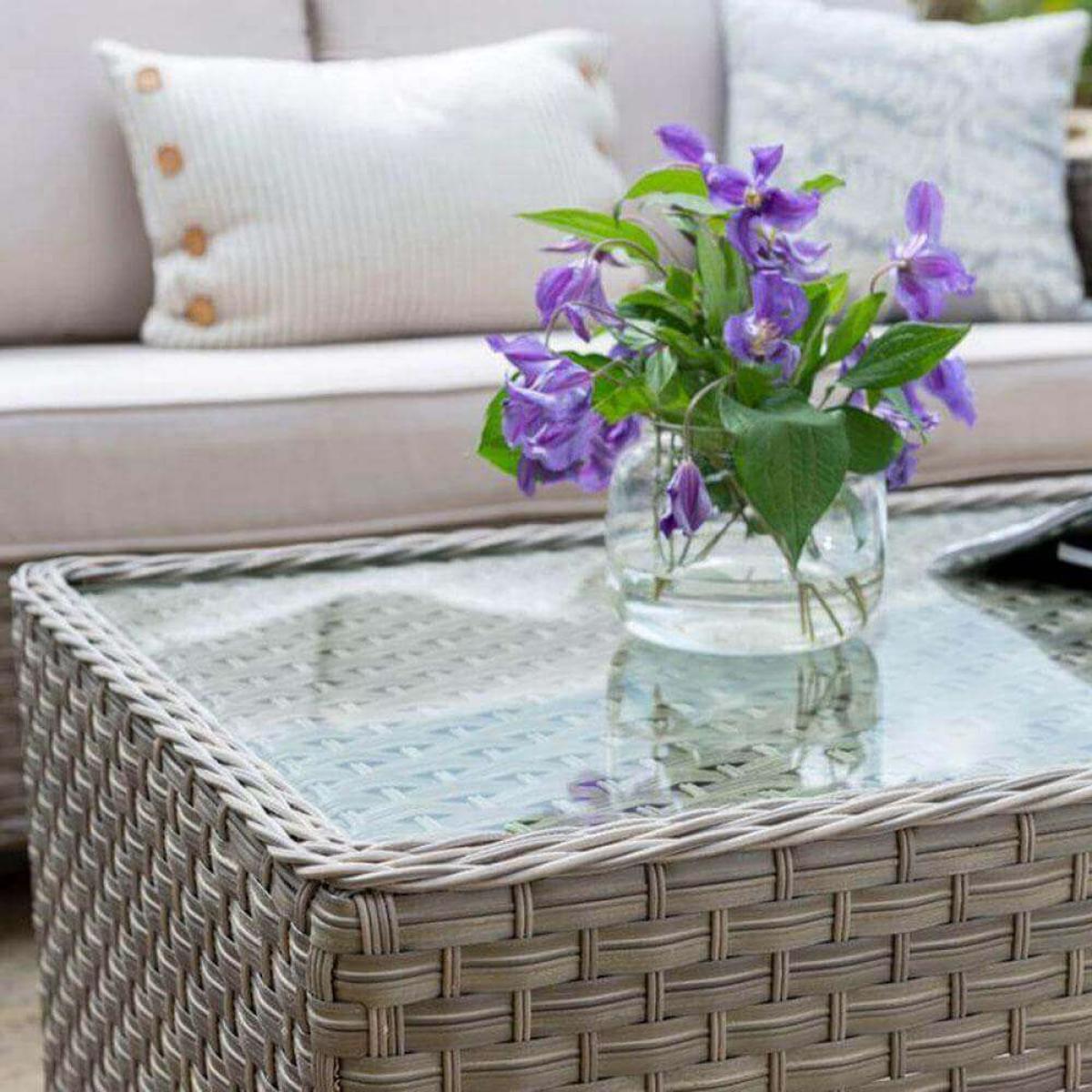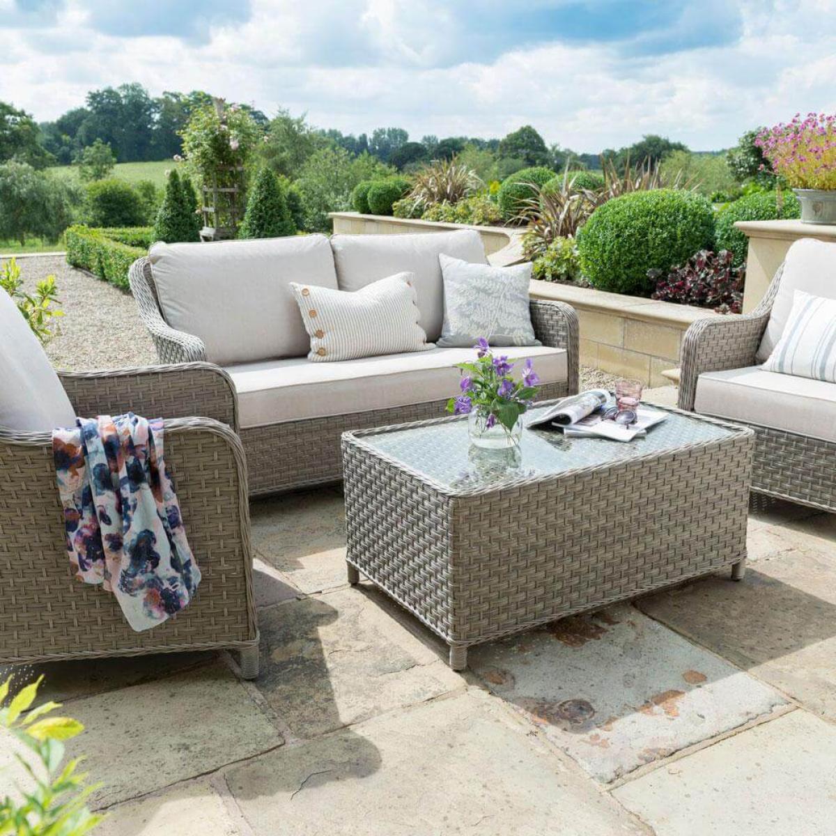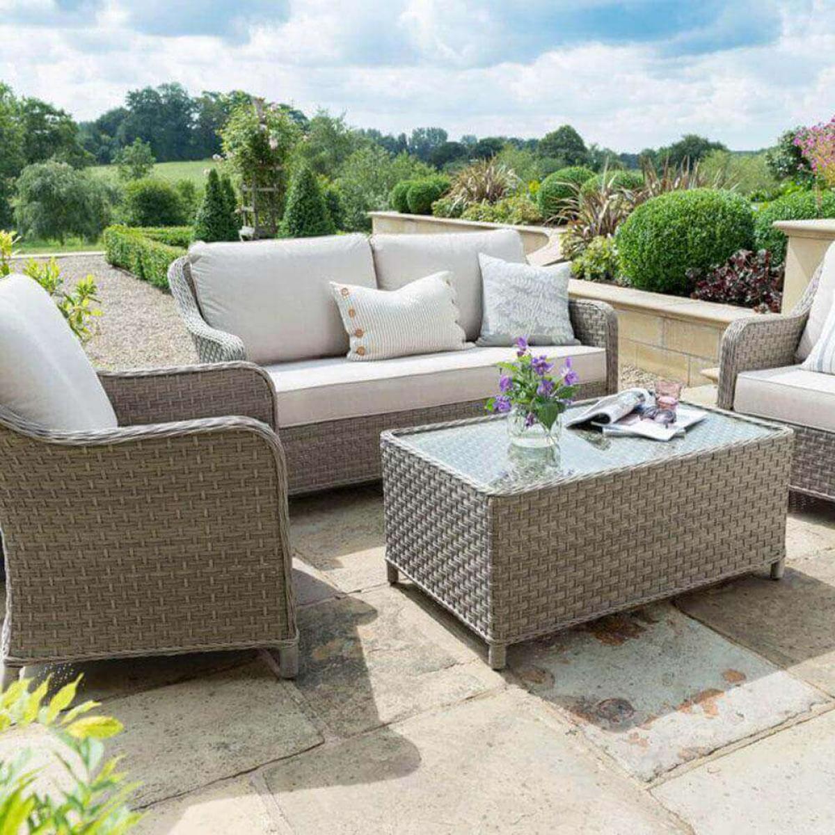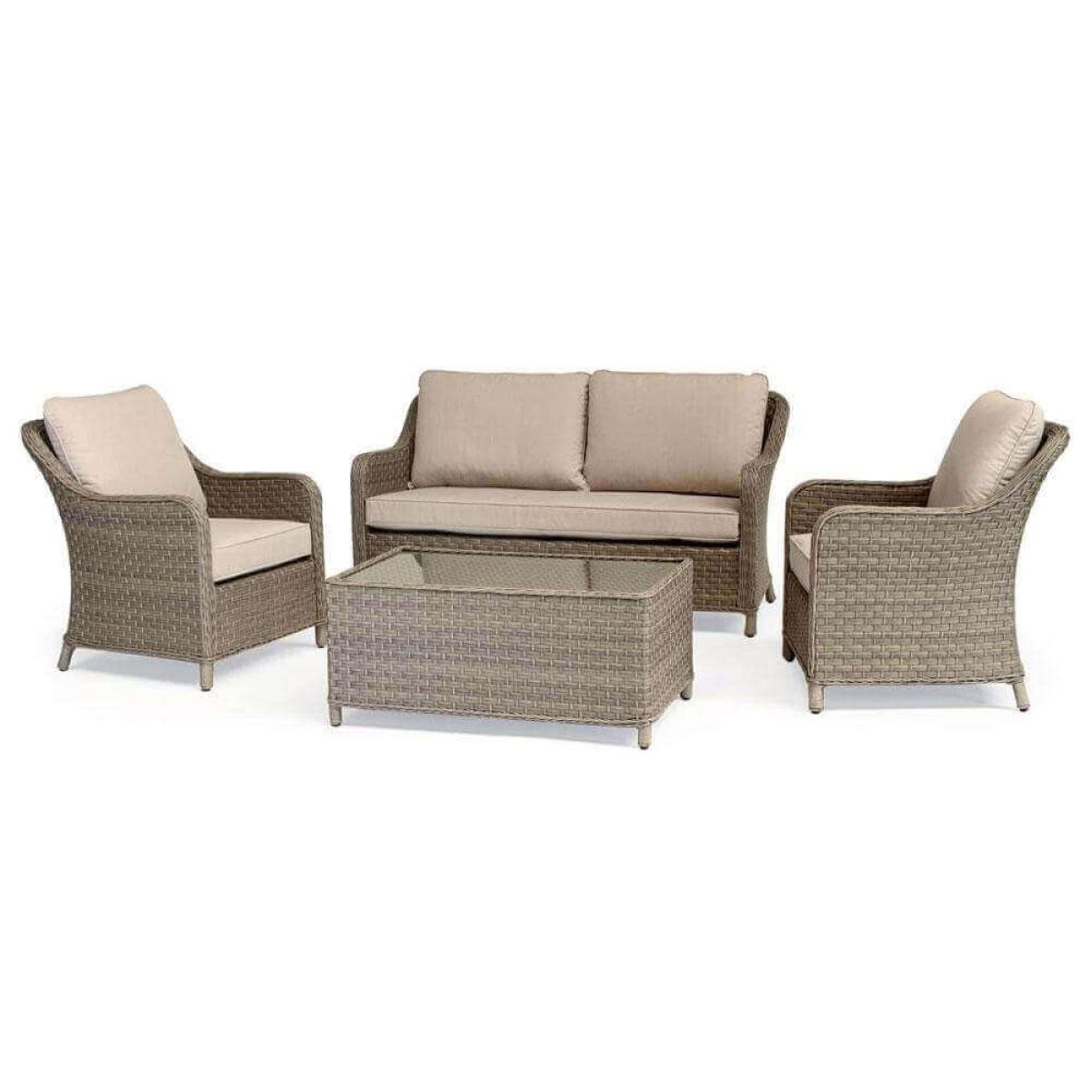 Set consists of:. About:. The Kettler Charlbury Garden Lounge Set is designed for hours of sunshine, it’s built to repel the damaging qualities of sun exposure. It is constructed from tough rattan wicker which is UV resistant, it won’t fade any time soon. Impressively it will stand up to wet weather thanks to the integrally moisture resistant synthetic fibres of rattan. However, to best protect this set during the winter months protective covers are worth considering, see details of these beneath this descriptions. Just bring your cushions inside when the weather turns, for best care. It comfortably seats 4 people, the sofa allows 2 people to cosily sink into the deep fill foam cushions, the same as included for the 2 armchairs. Kettler has designed this set for conservatory use as much as a patio. It will cater to your lounging needs, a great choice for guests, any time of the year. The sunken glass tabletop is firmly set running sleekly to the edges, providing a finished look, whilst ensuring it is easy cleaning. The rim of the table consists of thicker band wicker showcasing a subtle contrast in texture and style, the same is used on the sofa arms and armchairs. Its aluminium frame is hardy and rustproof, guaranteeing stability and ensuring that this garden lounge set is a truly ideal addition to any home or garden. Add further protection with the use of specific fitting Kettler protective covers that are both durable and easy on the eye. Click below to be taken to the relevant cover, sold separately.