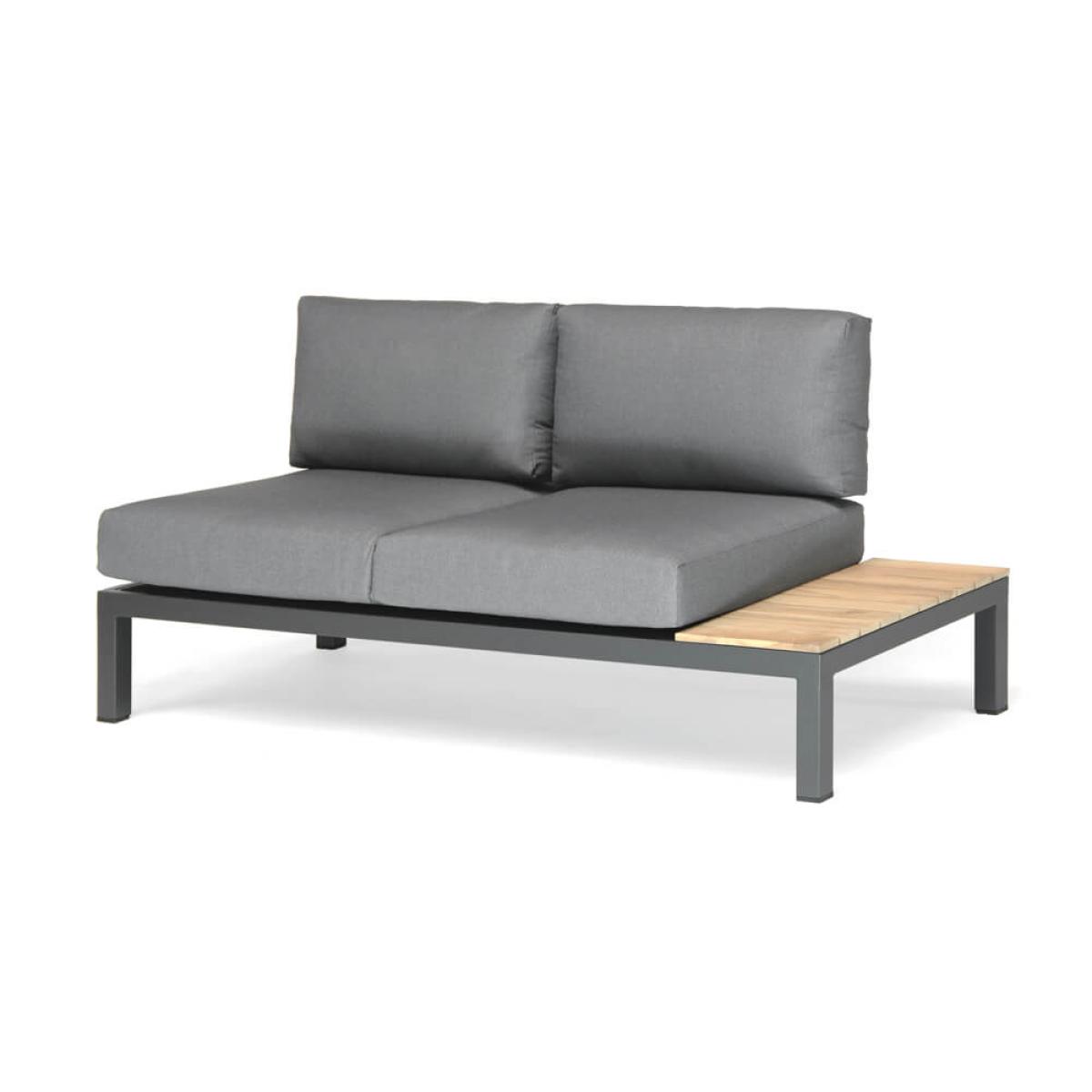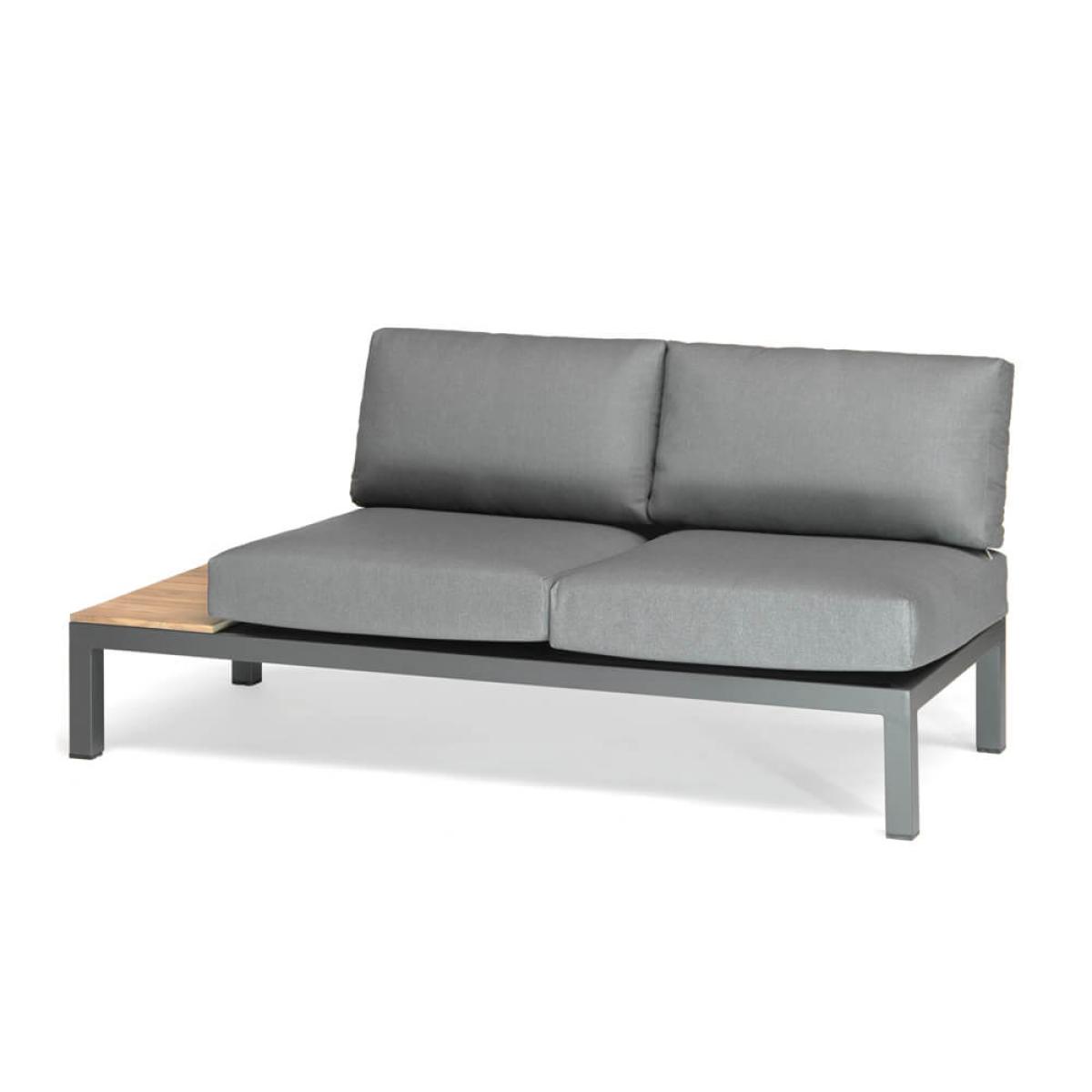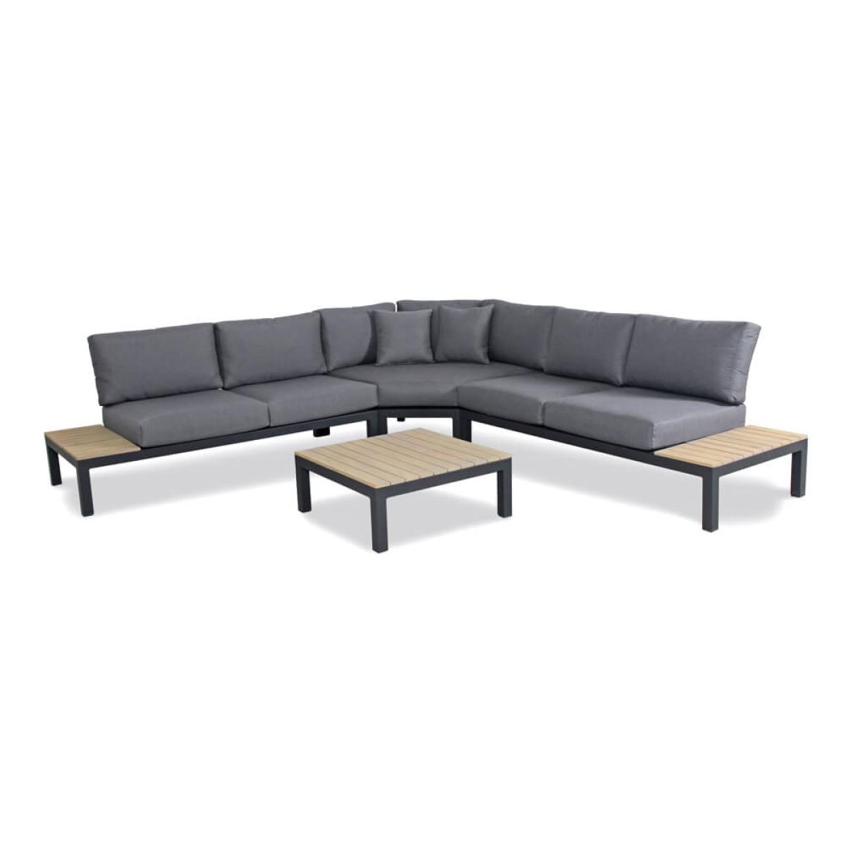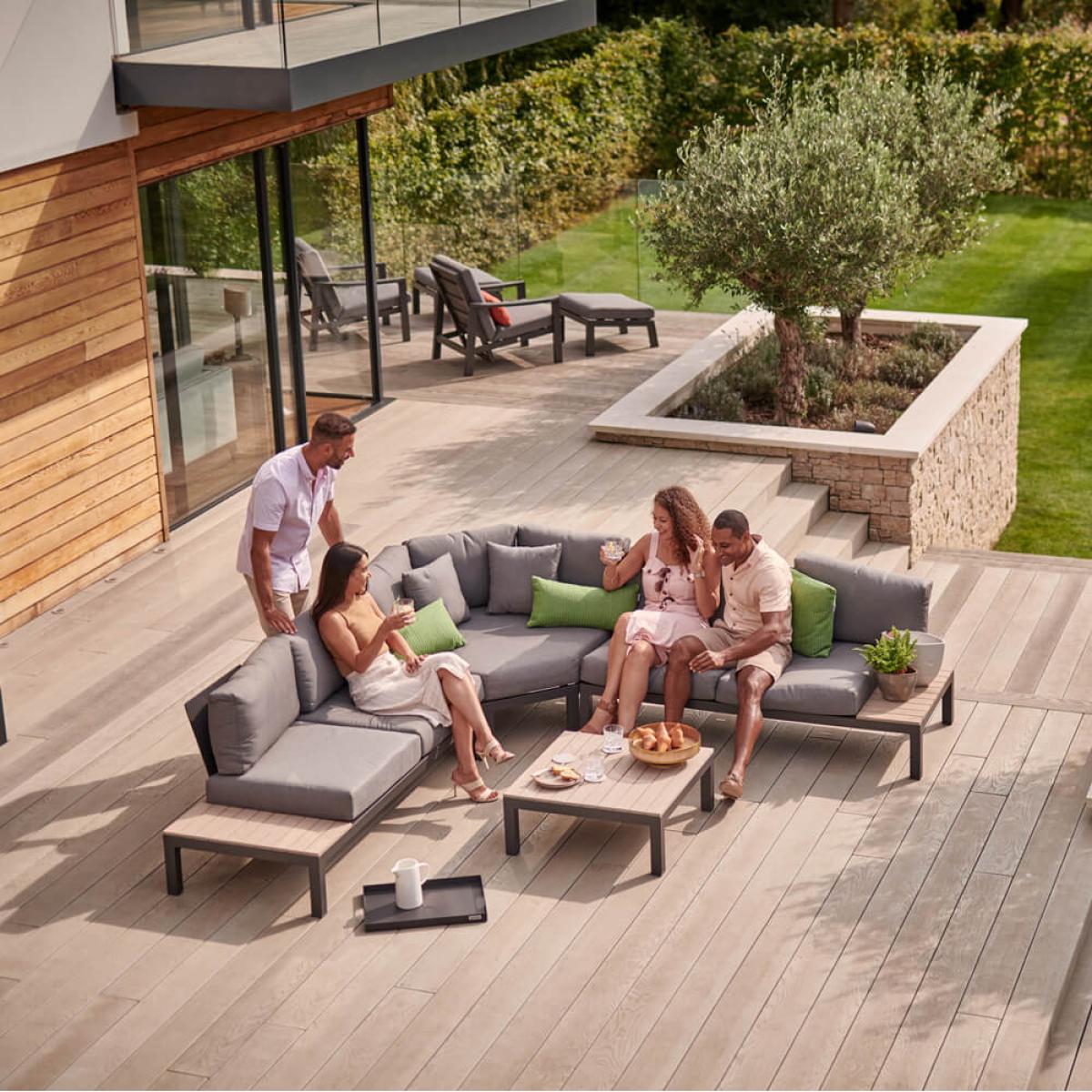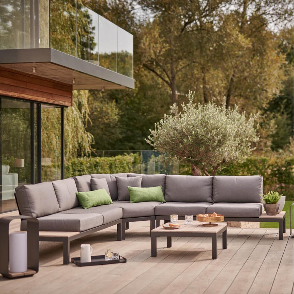 Set consists of:. 1 x Kettler Elba Left Hand Sofa with Teak Side Table. 1 x Kettler Elba Right Hand Sofa with Teak Side Table. 1 x Kettler Elba Large Lounge Corner Modular Sofa Unit. 1 x Kettler Elba Teak Coffee Table. About:. Bring some cool, calm and contemporary style into the garden with levels of comfort that will become the envy of your friends with this Kettler Elba corner set. The larger sibling of the. Kettler Elba Low Lounge Set. , it boasts a wider and higher capacity corner bend so that this aluminum garden sofa will comfortably fit 6 people. Thick 5 cm core deep fill cushions are sure to keep everybody lounge-happy for hours at a time. The cushions are secured with a sling base that’s part of the base of the seating structure adding comfort and convenience. This Kettler outdoor furniture is completely ready for the outdoors with a pewter grey cast aluminium finish that stands up to rust completely. We just recommend bringing the cushions indoors when not in use and certainly over the winter months. Accompanied by two teak wood topped side tables that are handily built into the sofa ends, this set is ready to entertain. With the addition of the teak topped coffee table there’s plenty of opportunity to truly relish relaxed drinks and nibbles in the garden this year. The modern design of this cast aluminium garden furniture will suit patios, decking and verandas. Add more seating with the. Kettler Elba side chair. , which easily slots into this sofa configuration and allows for a freedom of placement wherever preferred.