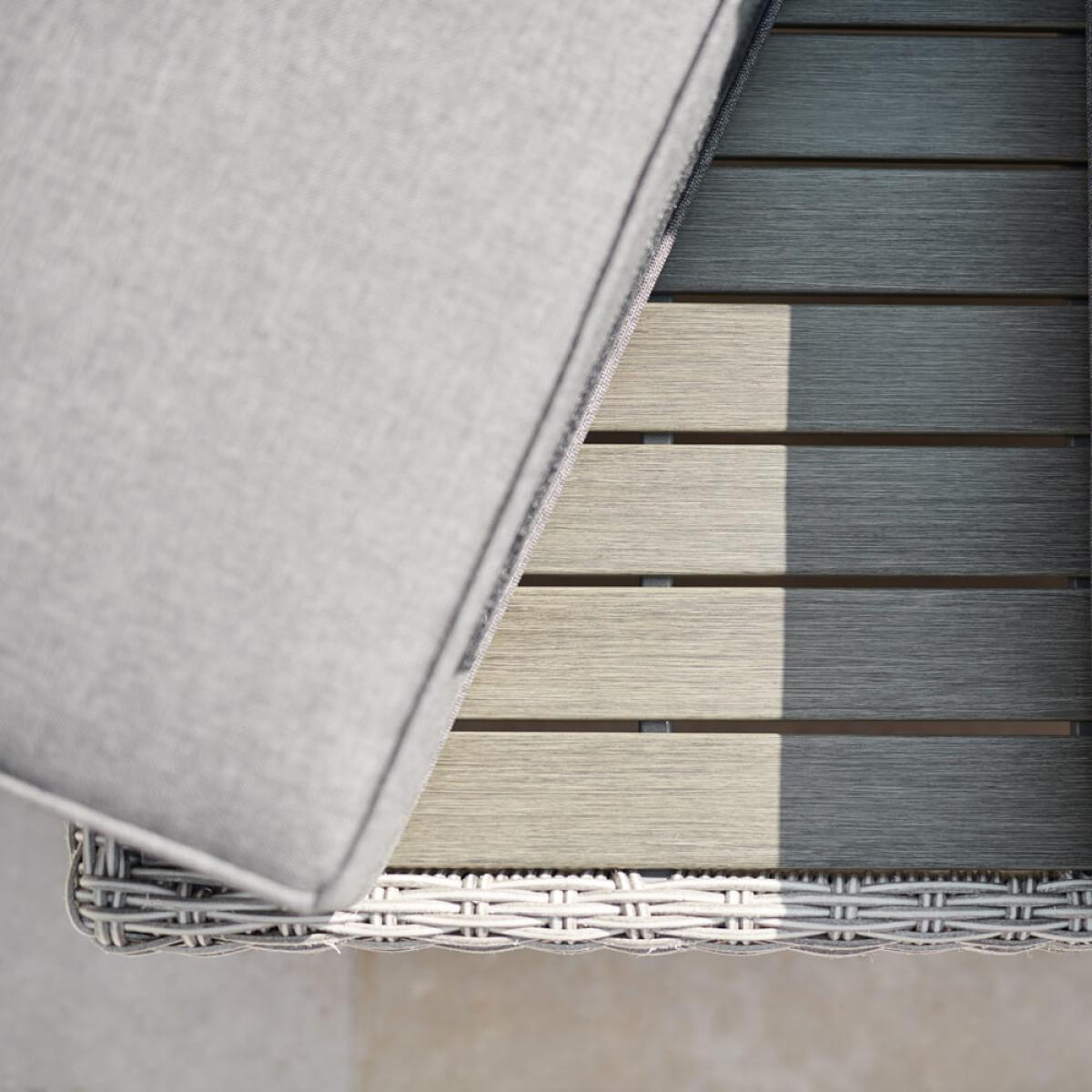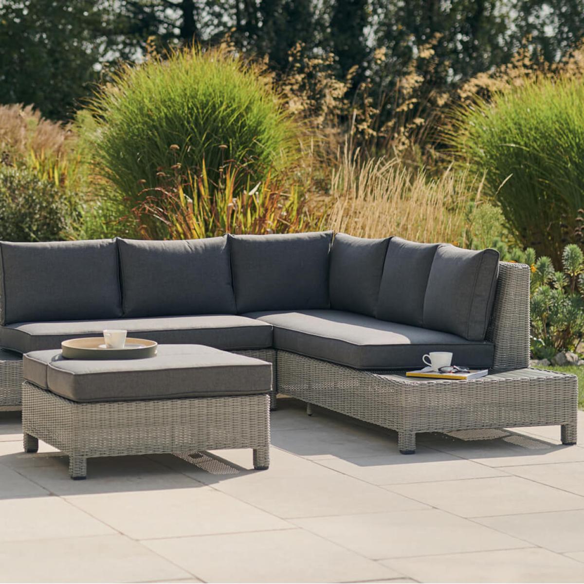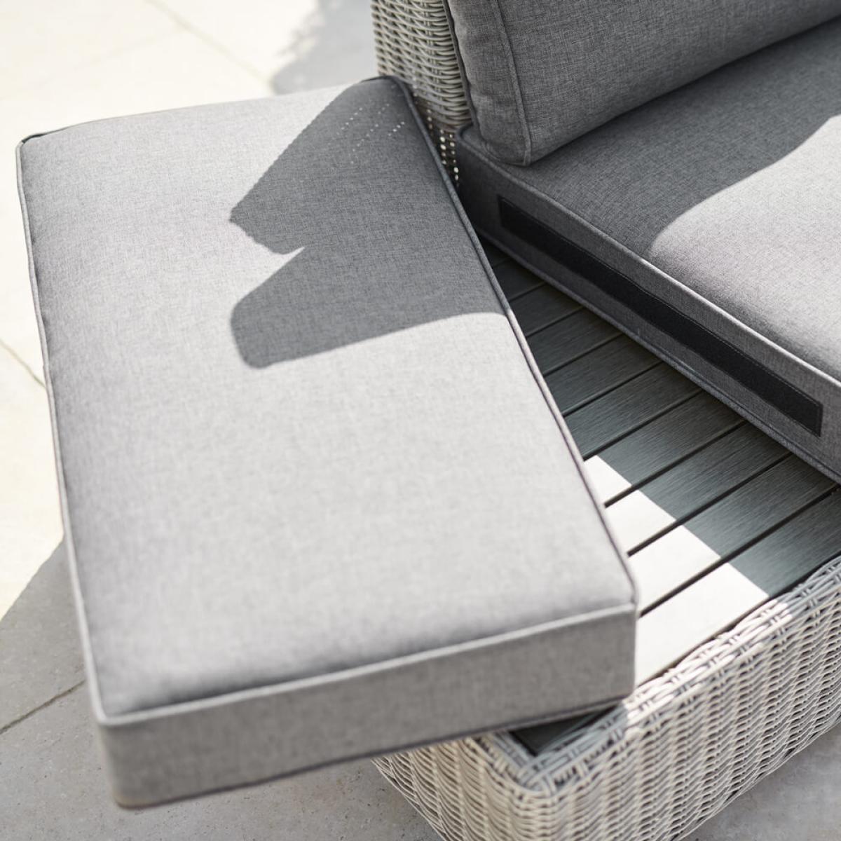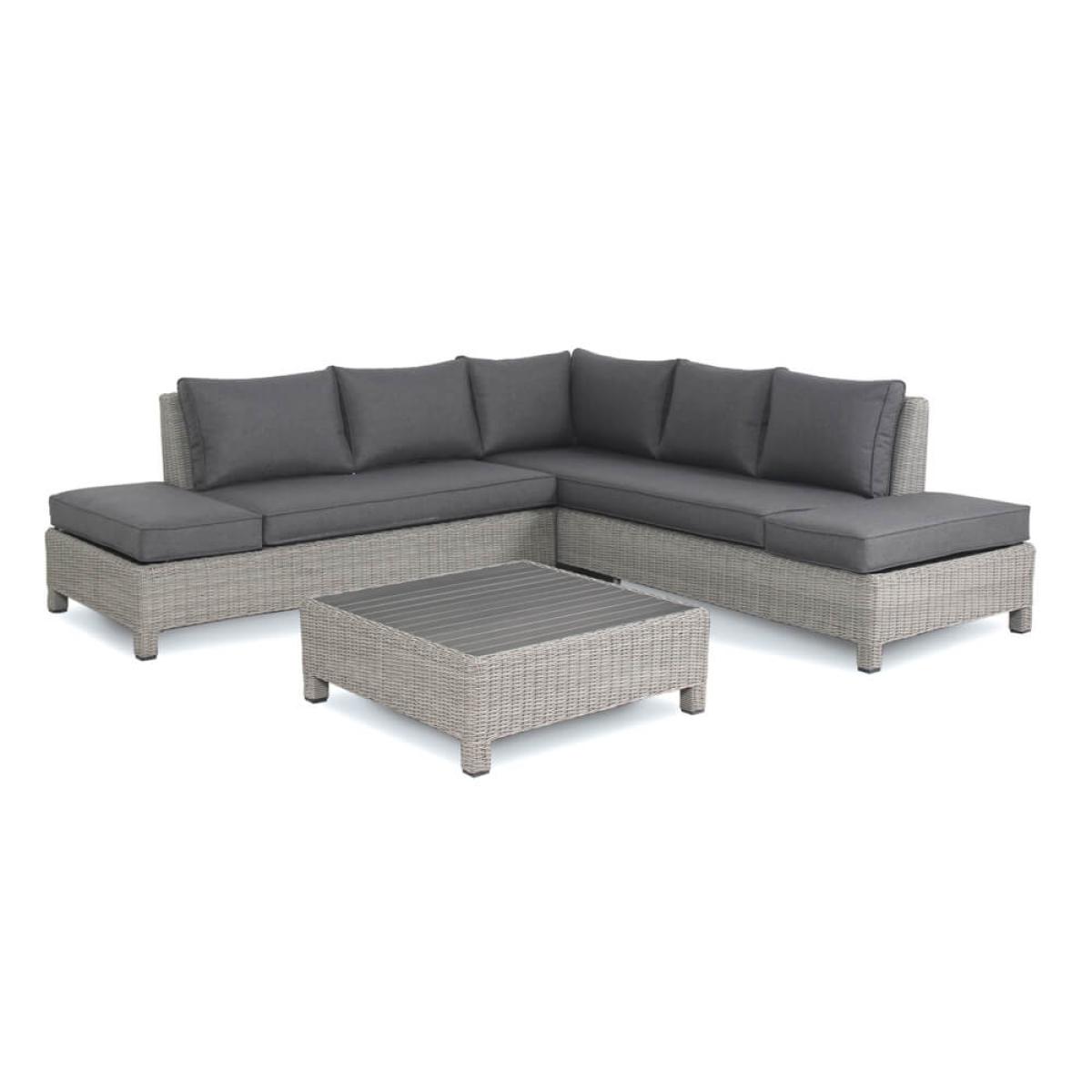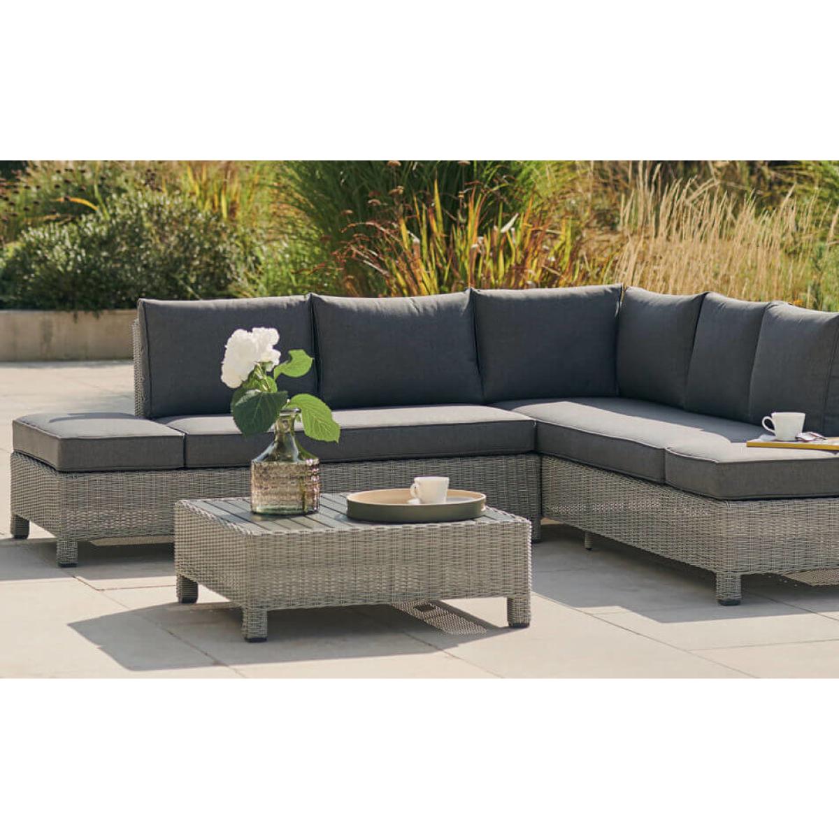 Set consists of: 1 x 2021 Kettler Palma Low Lounge Corner Sofa with Cushions – Whitewash 1 x 2021 Kettler Palma Low Slat Square Coffee Table/Footstool - WhitewashAbout:. This inventive new garden sofa set configuration by Kettler will become the setting for many laid back afternoons enjoying fine weather with good company. This is rattan patio furniture set that prioritises ease of use for a truly blissful lounging experience. Purposely lowered seating is given a deep width and padded with the Palma Soft Taupe cushions. The two cushions situated at the ends of this lawn/patio garden furniture can be removed to reveal the same slat surface found on the coffee table meaning table surface can triple for nibbles and drinks. These cushions can also handily be fitted exactly to the dimension of the coffee table meaning you can convert to a footstool or additional free standing seat. These cushions will do fine in braving the outdoors standing up to light showers and flash downpours easily simply store in winter months for best care. The mini square coffee table benefits from a sturdy yet lightweight aluminium frame as does the sofa unit itself meaning this garden lounge set is easy to move around. This outdoor sofa set is made from rattan wicker so will hold up to the ravages of bad weather plus is UV resistant so won’t fade at all either. Although to best protect this set during the winter months protective covers are worth considering see details of these beneath the key features below. Kettler furniture remains a glorious addition to any garden with several innovative setups through either their Palma or Charlbury ranges now available. Kettler Palma Lounge Set Benefits: Versatile colour 'whitewash' rattan is highly weatherproof Low profile seating for relaxed lounging Slat finishes on low coffee table is both tactile and durable Cushions can be removed at the ends to reveal more slat table surface Use cushions when removed to add to coffee table to convert to footstool or another seat Mini square coffee table befitting of set and easy to clean slat design Aluminium frame design strong yet lightweight. Further protect your Palma Low Lounge Corner Sofa Set from the harsher weather months bird droppings or tree debris with the following specific fitting protective covers: Kettler Palma Low Lounge Corner Sofa Protective Cover Kettler Palma Low Lounge Coffee Table/Footstool Protective Cover