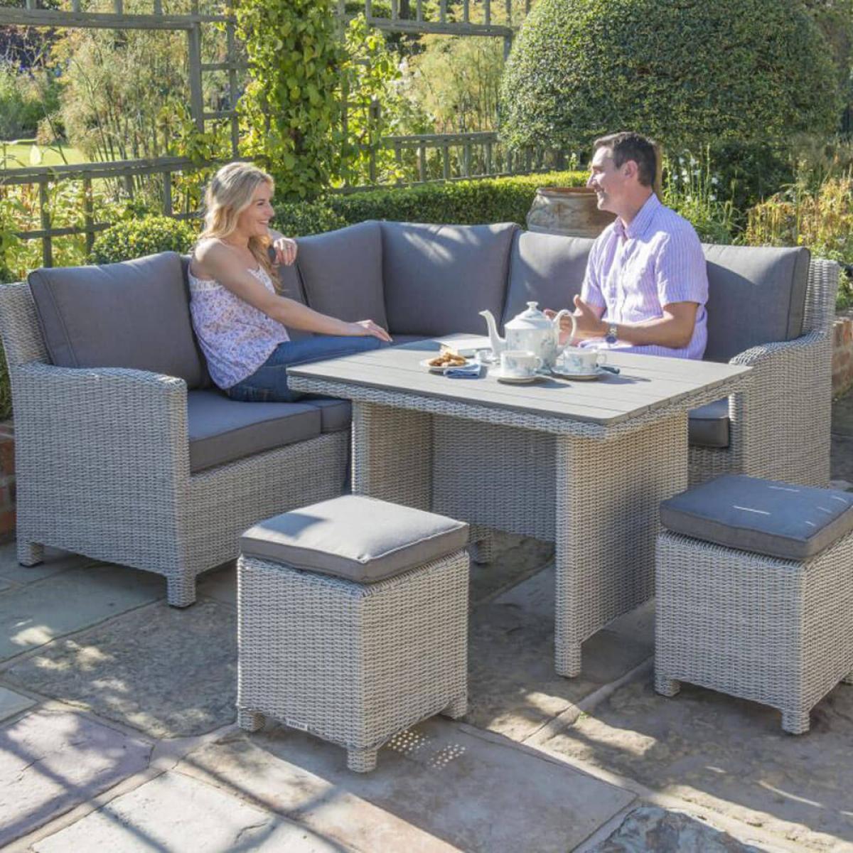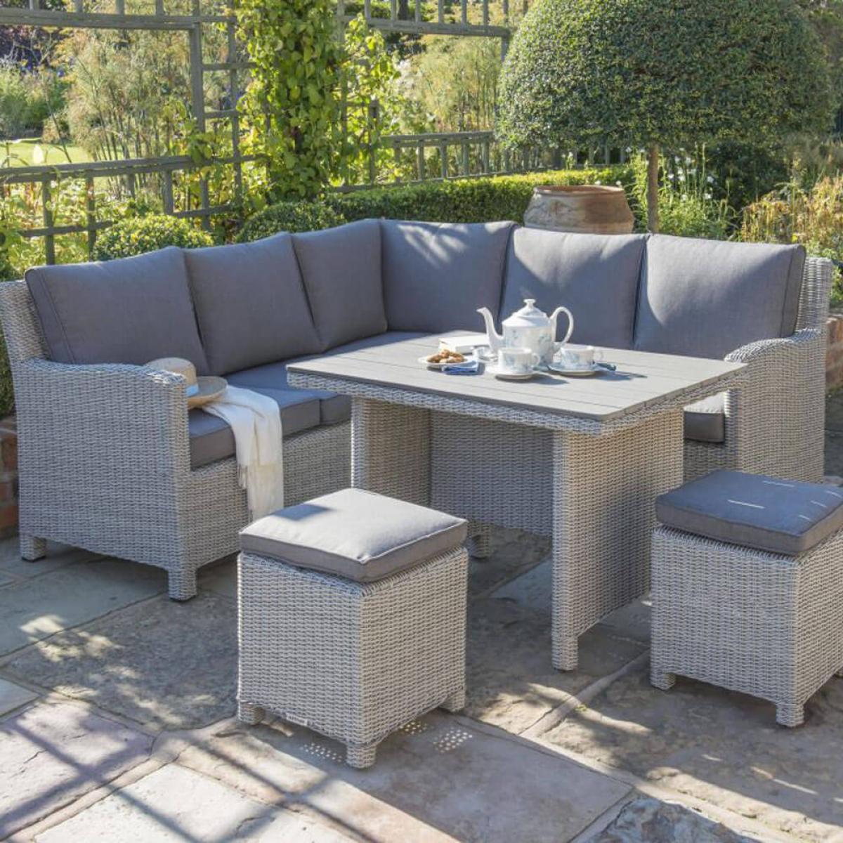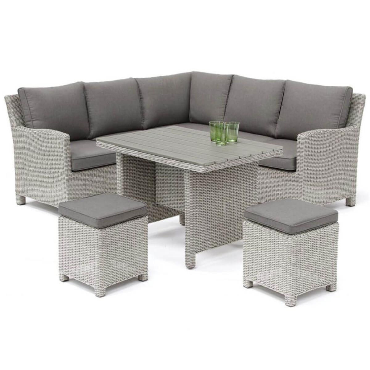 Set consists of:. About:. This Kettler Palma Mini Dining Corner Set will be a fantastic addition to an urban garden or smaller areas of decking or patio, the mini slat table and compact modular sofa arrangement means it packs a great deal into a smaller space. This is rattan garden furniture with styling and substance at its heart. The smooth weave wicker retains exceptional levels of durability allowing it to be left out to face the elements, whilst the whitewash tone of this weave is pleasingly neutral meaning it will complement much garden decor. To best protect this set during the winter months protective covers are worth considering, see details of these beneath the key features below. The rattan sofas come as two separate modular units that adjoin, whilst the two stools remain independent resulting in being able to seat 6 people. This mini garden dining set contains an elegant slat topped table, constructed from a wood-free composite but with the pleasing finish a wood provides. As with the rattan sofa, this tabletop is low maintenance, effortlessly standing up to the elements and easy-cleaning – just wipe with a damp cloth! Another benefit to this garden dining set generally, but especially the tabletop, is how it can absorb heat from direct sunshine more evenly compared to a glass finish, which can sometimes simply reflect it, plus it won’t fade any time soon! Simply put; this small rattan dining set is the ideal option for enjoying the outdoors in more compact spaces. Kettler Palma Casual 6 Seater Mini Corner Garden Set:. Add further protection with the use of specific fitting Kettler protective covers. Click below to be taken to the relevant cover, sold separately.