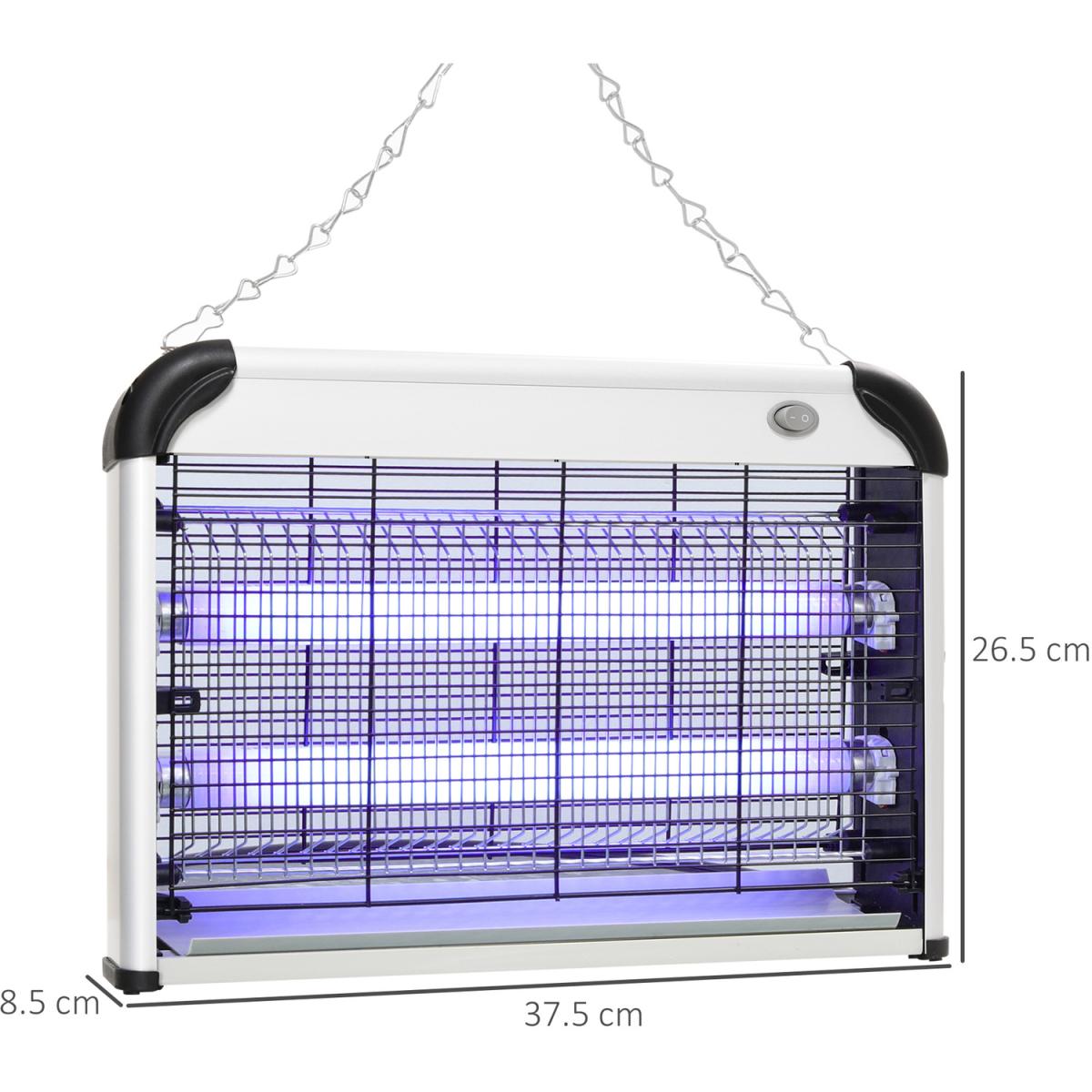 The portable mosquito killer lamp from Outsunny is energy-efficient, non-radiative, noiseless and odourless, effectively protecting you against mosquitoes, flies and other pests. The fully enclosed protective screening avoids accidental electric shocks, and the removable collection tray slot is easy to clean. With 20 W high efficiency and 60m2 effective room coverage, it helps create a more effectively protected space by being mounted on the wall or ceiling with the hanging chain. The functional mosquito killer lamp is an ideal addition to your patios, decks, balconies and more.