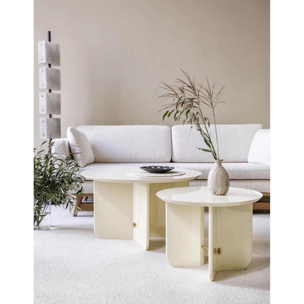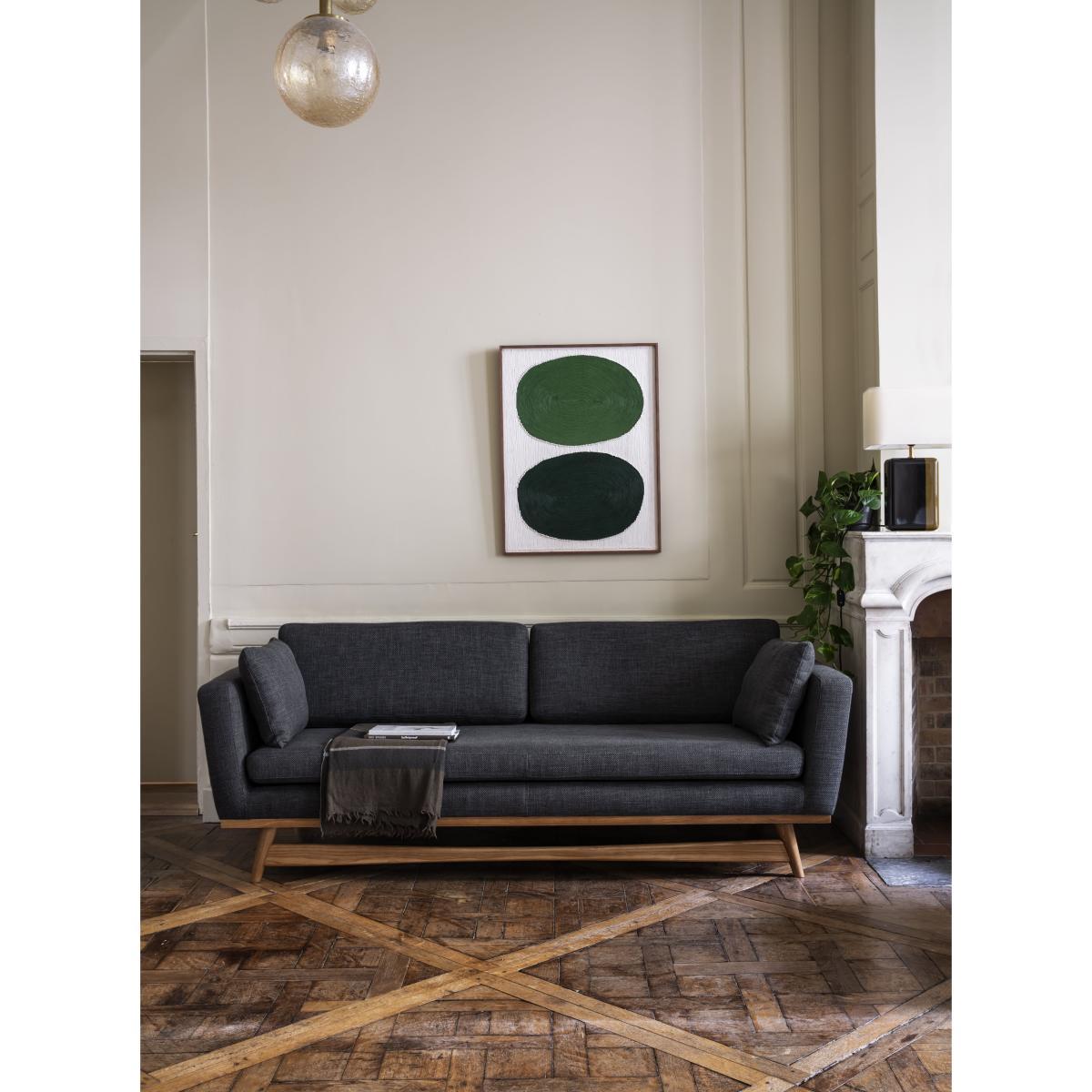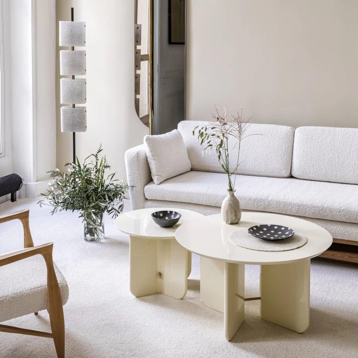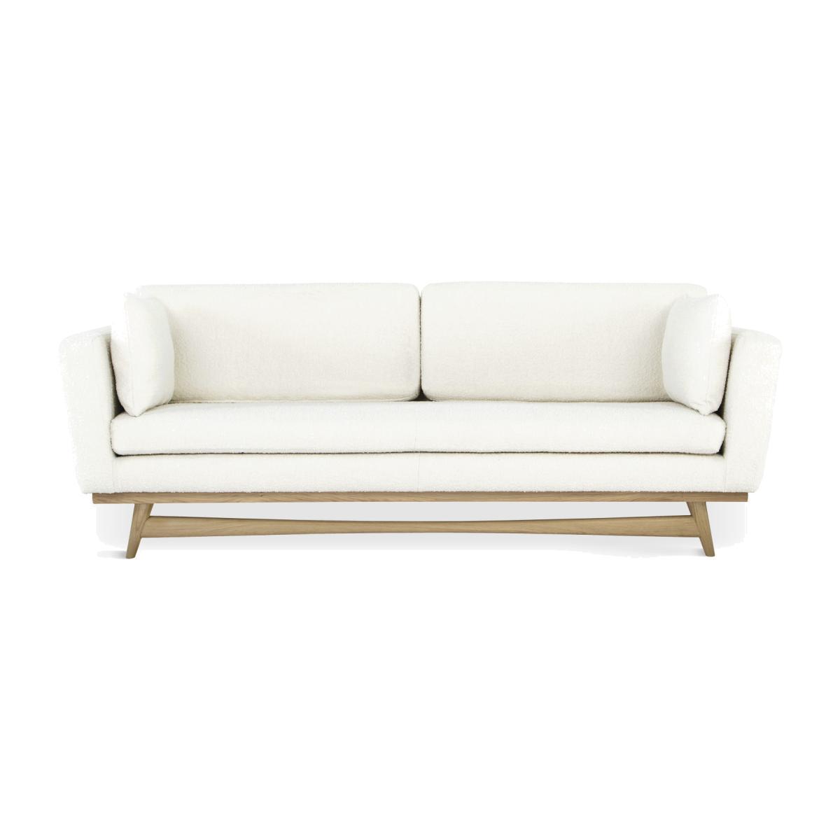 Fifties inspiration! An inspired mix of retro lines and a contemporary design for this wonderful sofa. The clean lines and use of light wood give this sofa a natural Scandinavian look. The simple silhouette is enhanced by a soft seat covered with quality cotton. Made of solid oak, the sofa’s compass legs are highlighted by a line of soft wood which gives this piece of furniture a contemporary line. This sofa is as gorgeous in front as behind: its upholstered back lets you position it in the middle of a room or against a wall. The considerable seat depth makes this sofa extremely comfortable. It can comfortably accommodate 3 people. This sofa will add a very trendy neo-vintage touch to your interior design. This timeless piece will become the centrepiece of your living room. In this version, the cushions are covered with a beautiful bouclé fabric. This downy, comforting, warm material has a style that’s both cocooning and elegant. A timeless piece!.