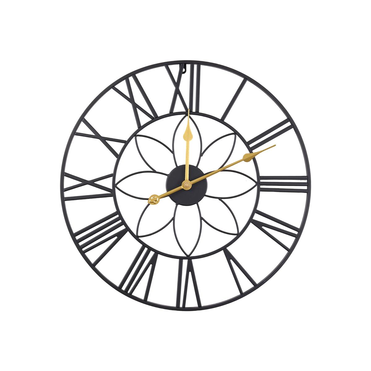 Add a touch of timeless elegance to your space with our exquisite wall clock. Classic Roman numerals lend a sophisticated air, while the sleek iron frame and minimalist design exude professional style with an artistic touch. The hollow flower pattern in the centre adds visual interest, complemented by the striking contrast of the gold hands against the black frame. Crafted from durable iron, it is corrosion-resistant and has long service life. Perfect for offices, meeting rooms, or reception areas, it enhances any professional setting with understated style and reliability.