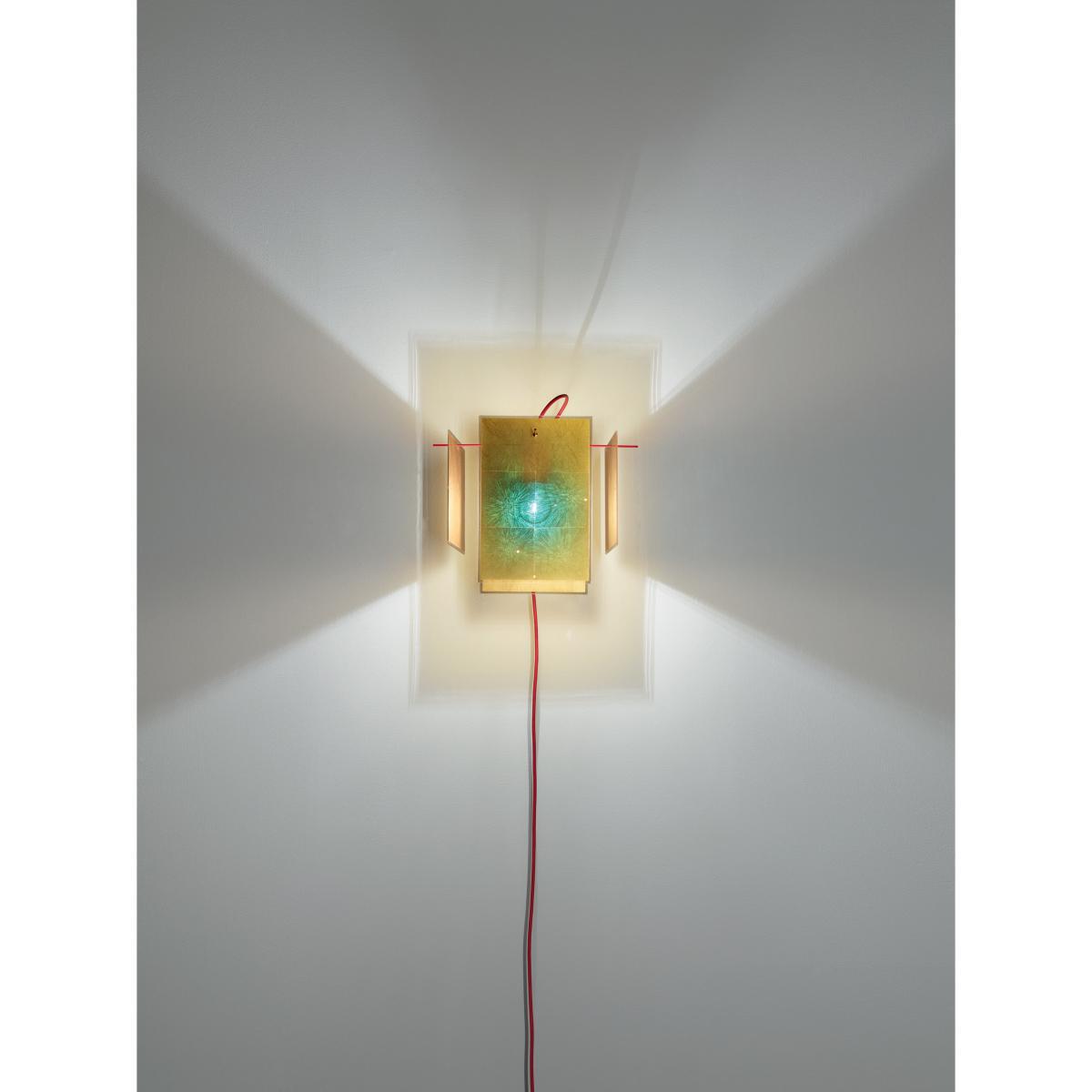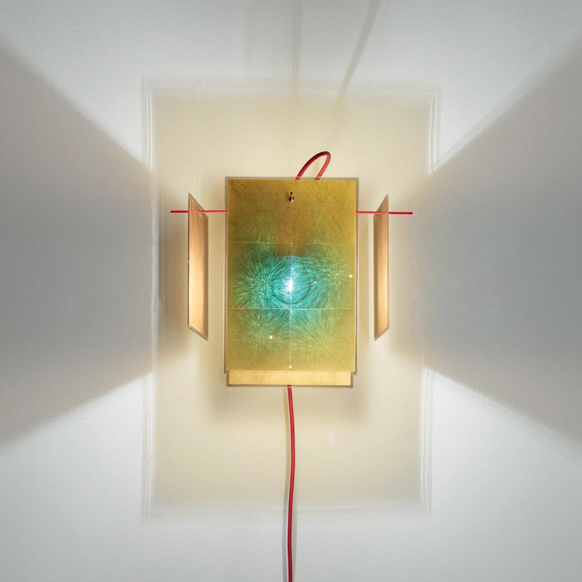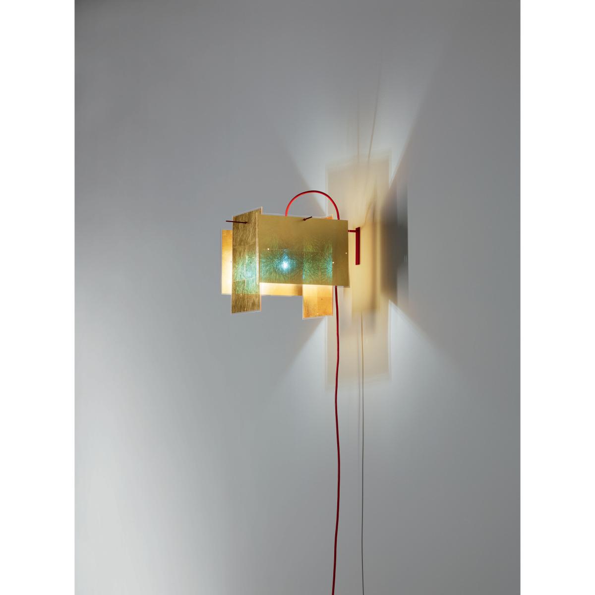 This wall light smacks of fragmented geometry. It consists of 4 golden panels suspended from a fine red metal structure. Each panel is crafted from real gold leaf inserted inside a transparent Plexiglas screen. The panels simply slot together on the structure using the holes (4 holes on each panel). Each panel can be positioned in different ways: vertically, horizontally, at an angle or upright. So you can change the shape of your pendant as you see fit. The panels are layered, allowing the light to come and go, creating a particularly warm atmosphere. The gold’s reflective qualities combined with the position of the strips allow an excellent emission of light. Light bounces off the various screens and is reflected in all directions. The gold leaf has an original effect because its molecules absorb all colours except blue. So the bulb’s silhouette, visible through the transparent panels, takes on a bluish hue. This wall light has a cable with a mains plug.