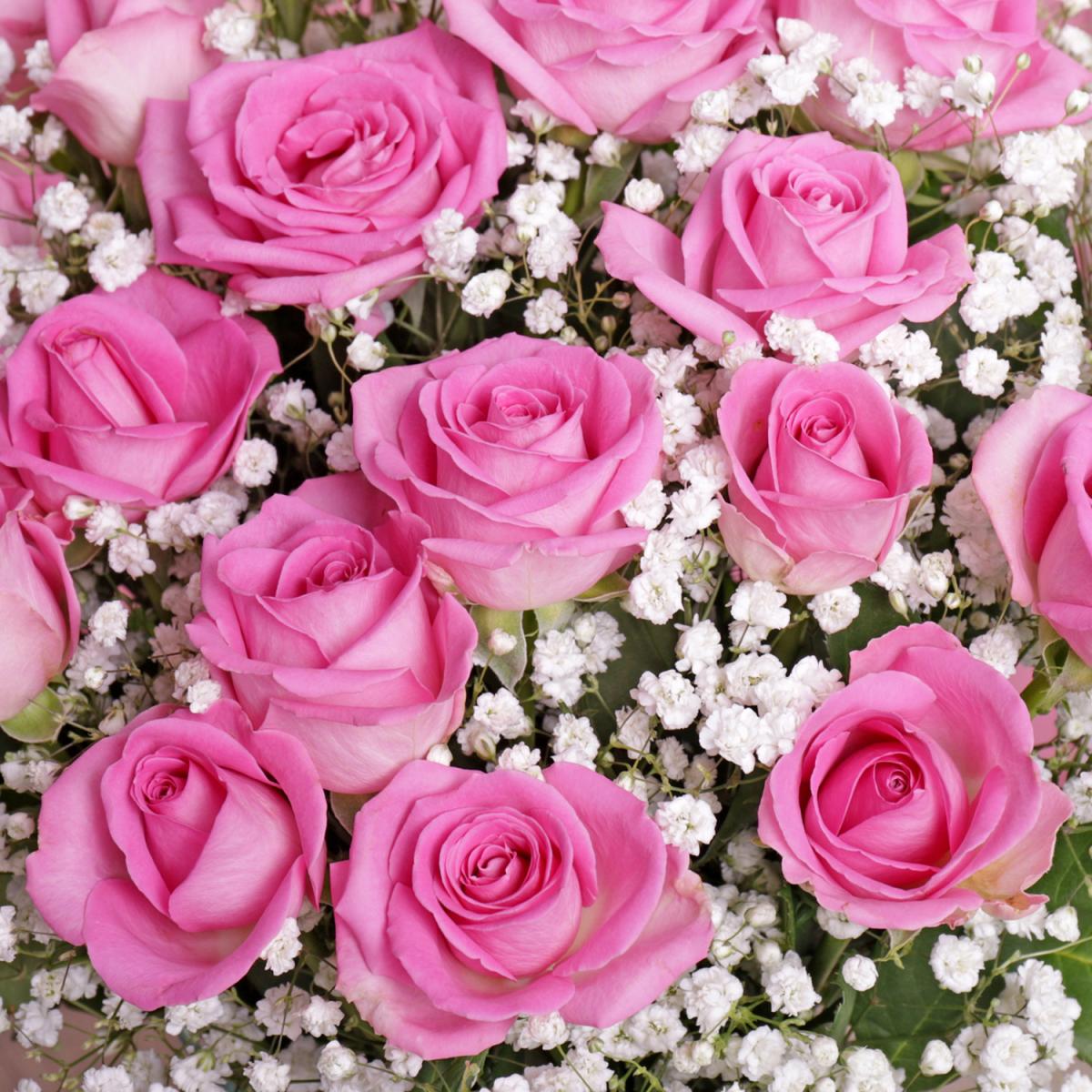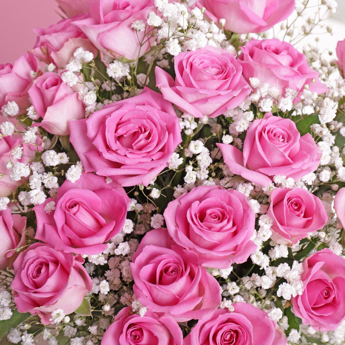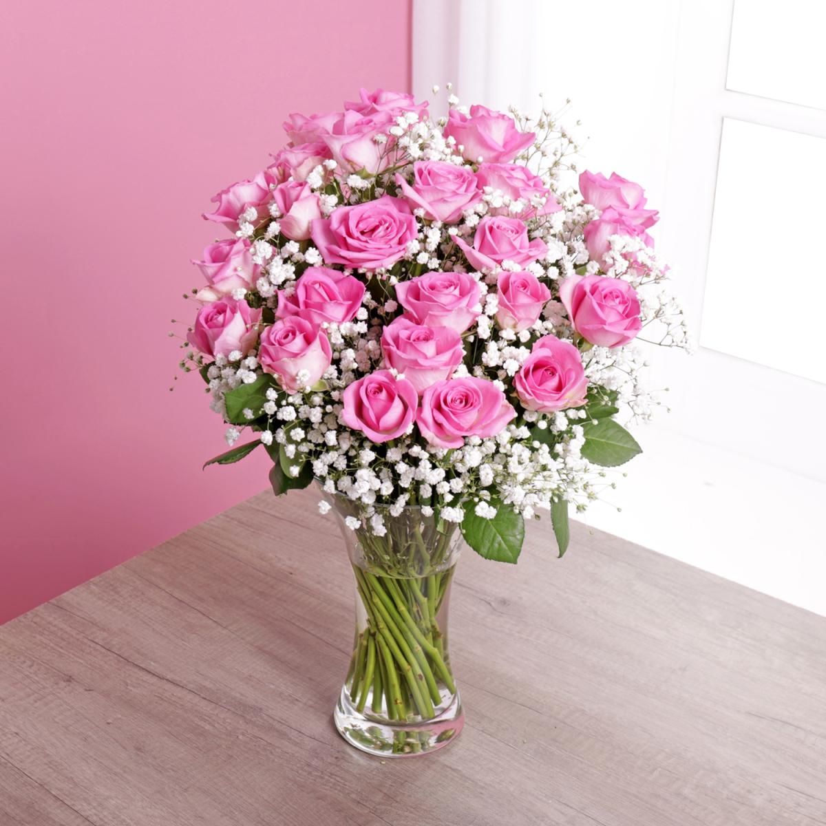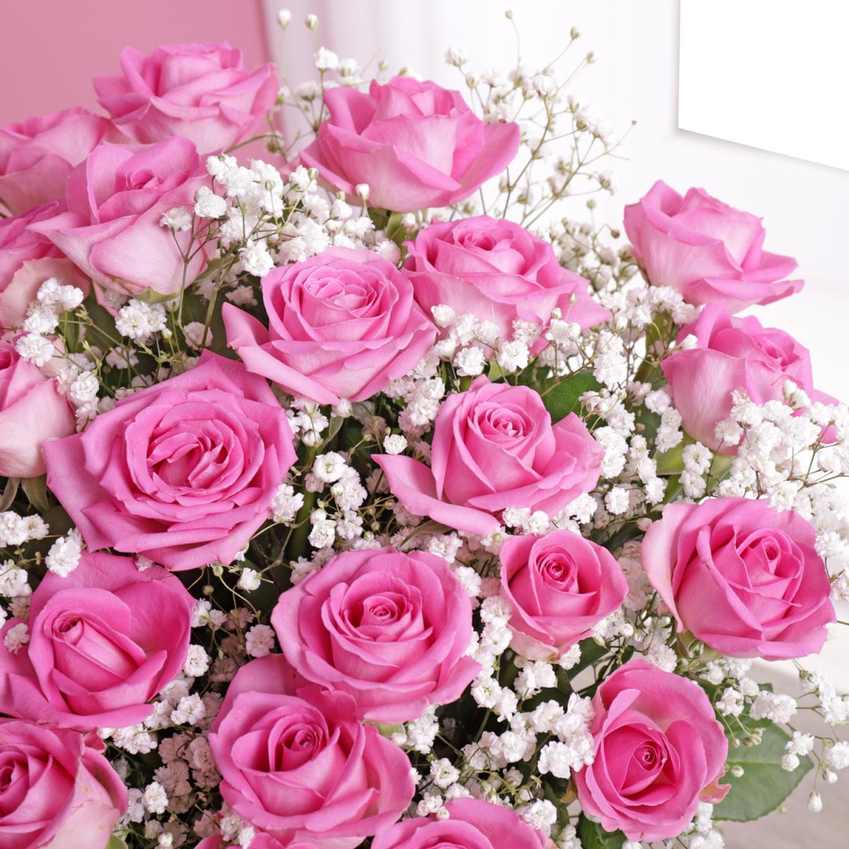 Two dozen stems of luxurious pink Roses are tied together with white Gypsophila to create a wonderful rose gift bouquet. Each bouquet is made to order, wrapped in a luxurious floral wrapping and sent with flower food, care instructions and your own personal gift message.