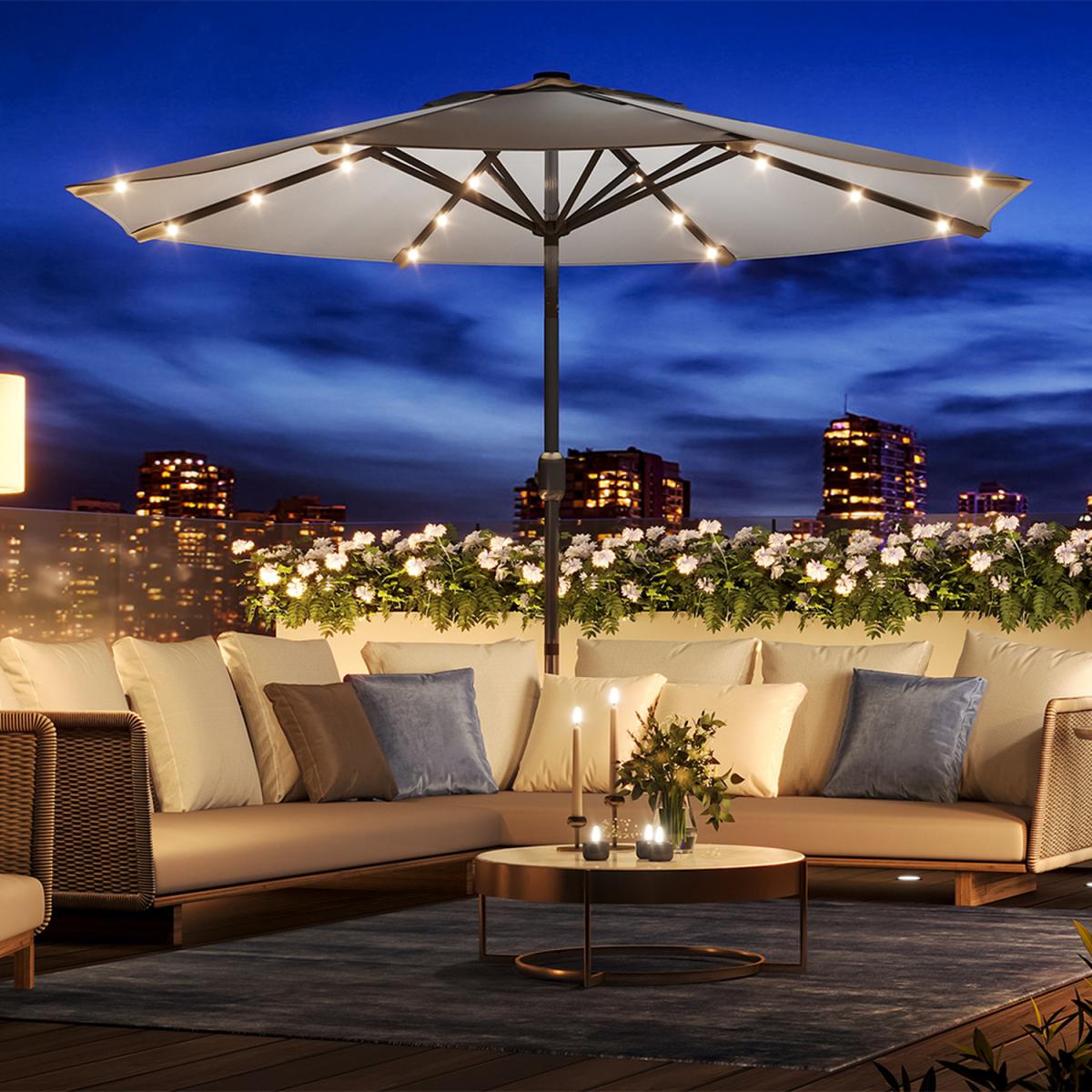 I love this solar-powered garden umbrella for its practical yet sleek design, ideal for adding some functional style to outdoor spaces. The light grey fabric works well in contemporary or minimalist gardens, pairing effortlessly with neutral palettes or vibrant furniture for a balanced look. It’s particularly useful in relaxing outdoor areas where subtle illumination is needed after sunset. To style it effectively, consider pairing with rattan or metal outdoor furniture, and perhaps some outdoor cushions in complementary tones to create a cohesive, inviting space. The resin base adds stability, making it practical for various garden layouts, and the solar lights mean you can enjoy ambient lighting without fussing over wiring or power sources.