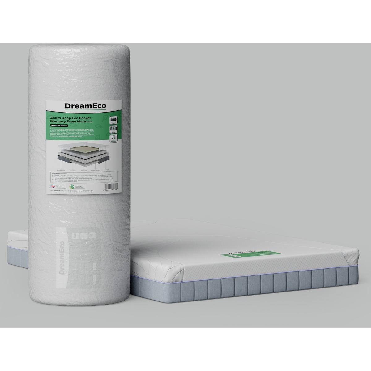 This luxury 25cm Depth Mattress is part of our Dream Eco collection and offers the ultimate comfort. 1000 pocket springs combined with a super-comfy, 100% recycled Eco Foam base and Memory Foam top layer, results in a not-too-soft, not too firm base. This pocket-sprung mattress will not sag over time like a traditional open coil mattress. The pocket springs move independently to support your body, and the Memory Foam removes pressure from your joints. The cover is anti-allergy and anti-dust mite. Save pounds when compared to branded or high-street, pocket spring mattresses. Made in the UK, this sustainable mattress has a lower carbon footprint.