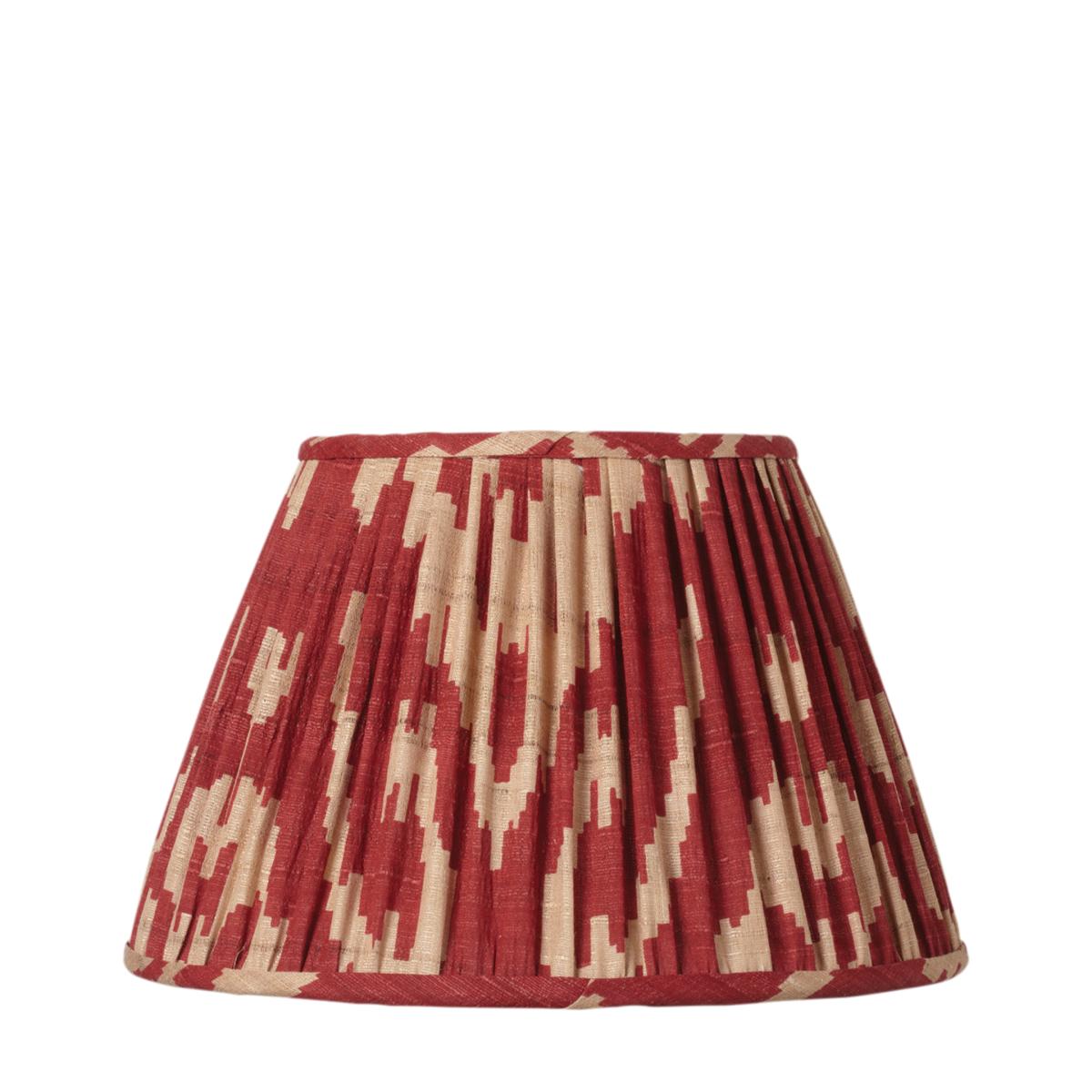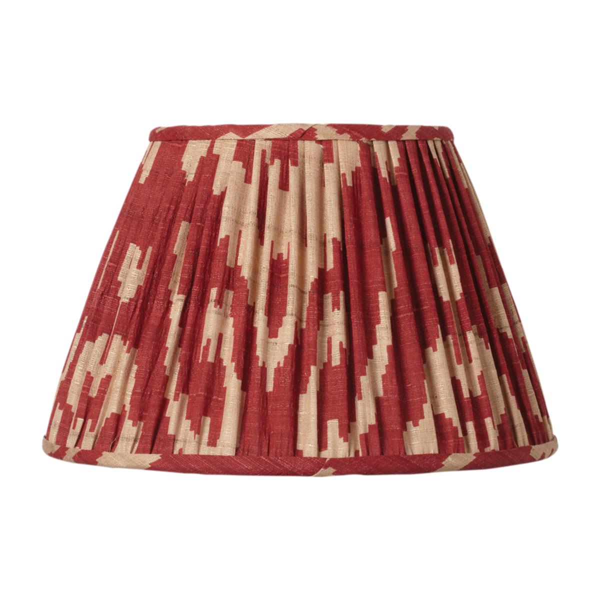 Make a feature of even the plainest lamp with a stylish, pleated Empire shade, featuring our Ikat-inspired silk print on wild tussah silk. Please note that slubs, inclusions and small ladders are characteristic of raw silk and part of its natural beauty. Additionally, the fabric is hand-printed so there may be differences in shading and occasional pattern skew, which is part of the charm of a handmade product and is not considered a flaw. 25cm Pleated Palau Silk Empire Lampshade - Red
