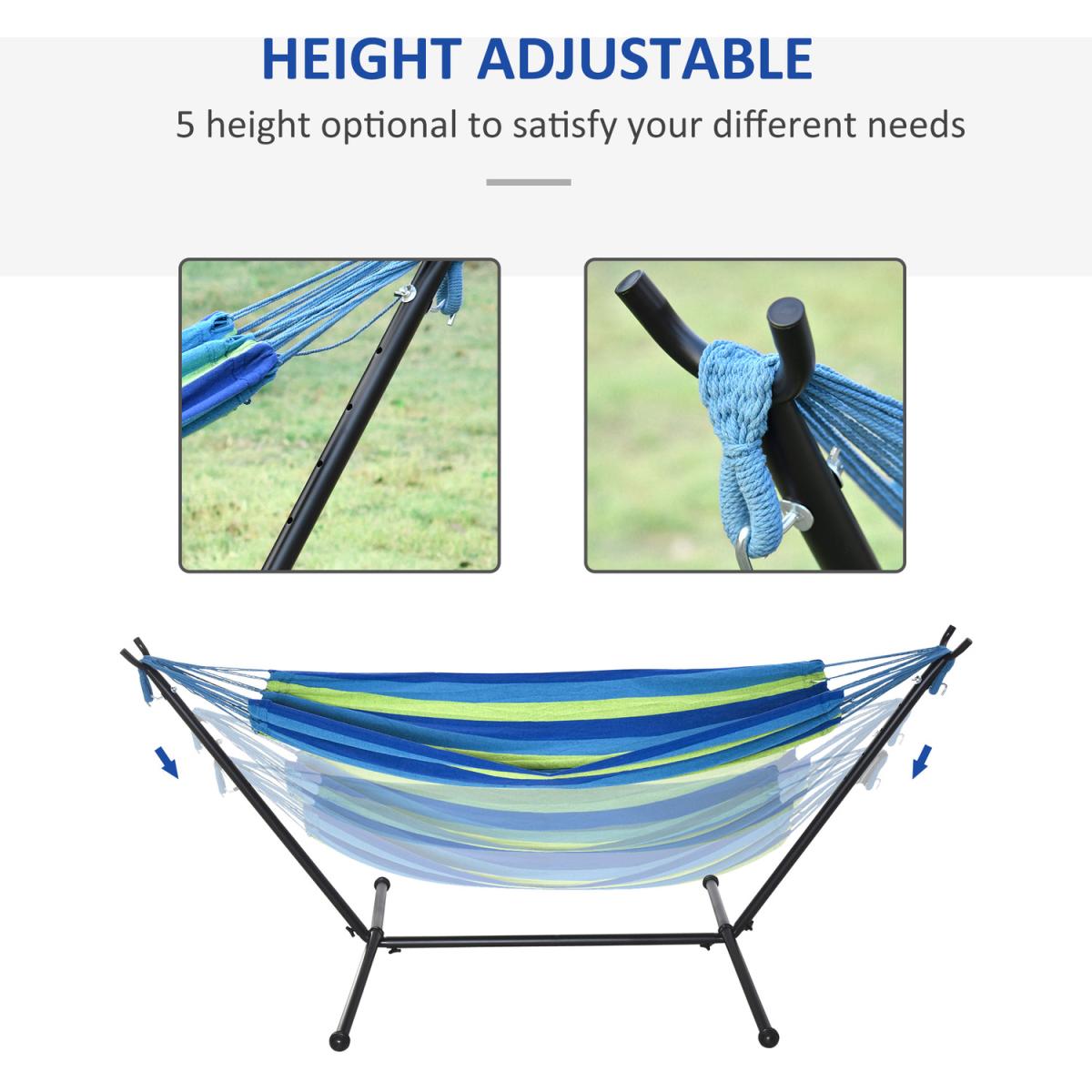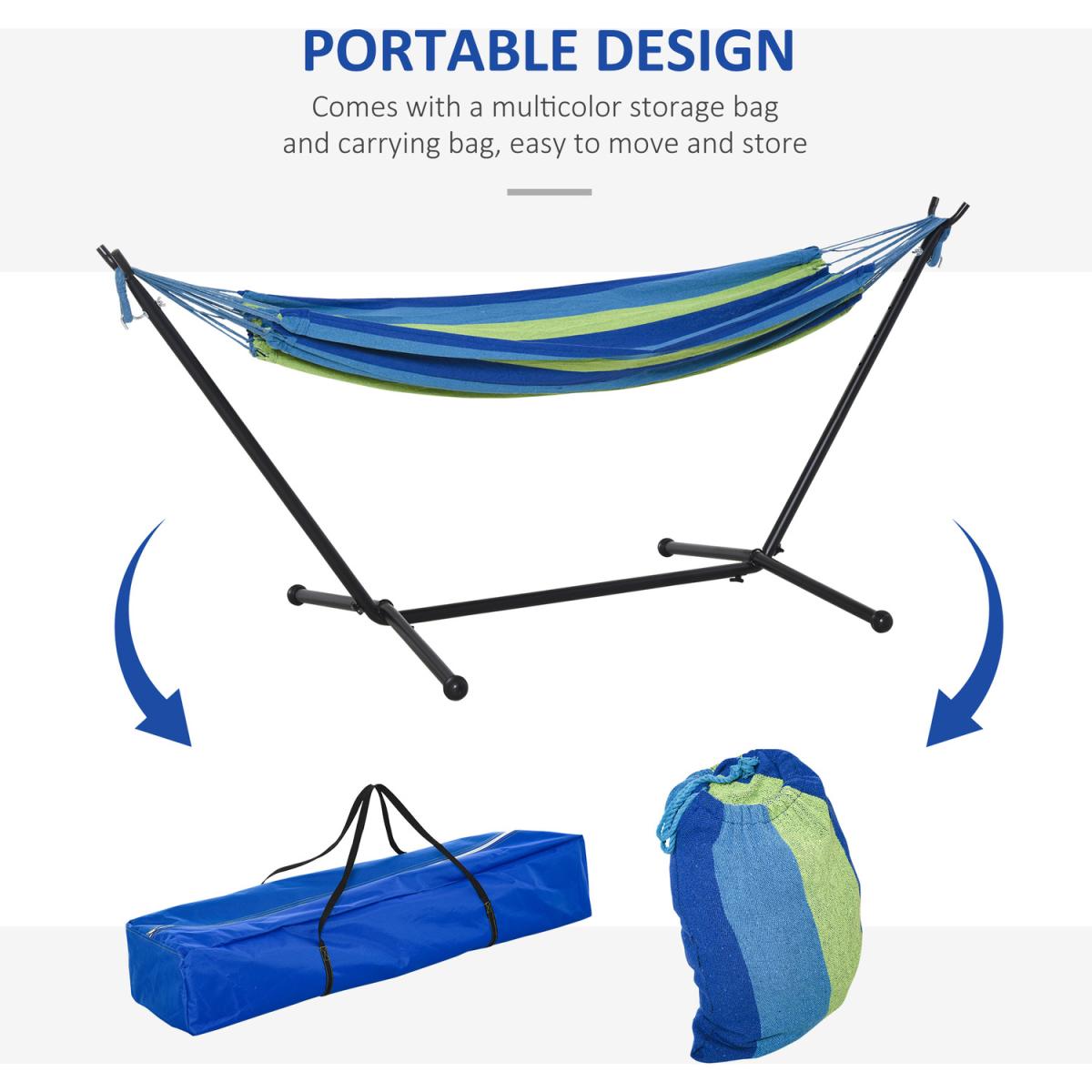 This Outsunny hammock bed with a modern shape and multicolour stripe design can be an ideal addition to your patio, yard or garden. No more searching for the perfect tree to hang your hammock, this practical hammock bed supported by a freestanding frame. Adjustable height and portable design bring more convenience for use. With this hammock, you can take comfortable naps on your porch, under a tree or by the pool for hours of relaxation.