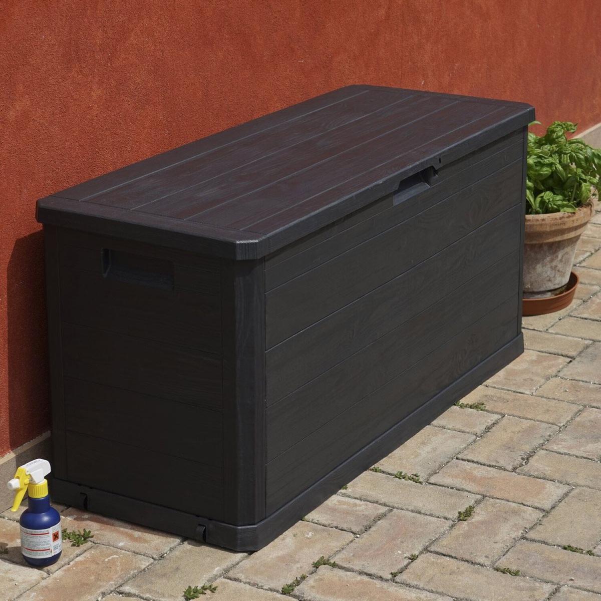 280 Litre plastic garden storage chest in Blackwood effect. Suitable for indoor or outdoor use. Made from sturdy weatherproof plastic. Features a hinged lid that can be locked with a padlock (not supplied) that allows you to keep your items secure at night.