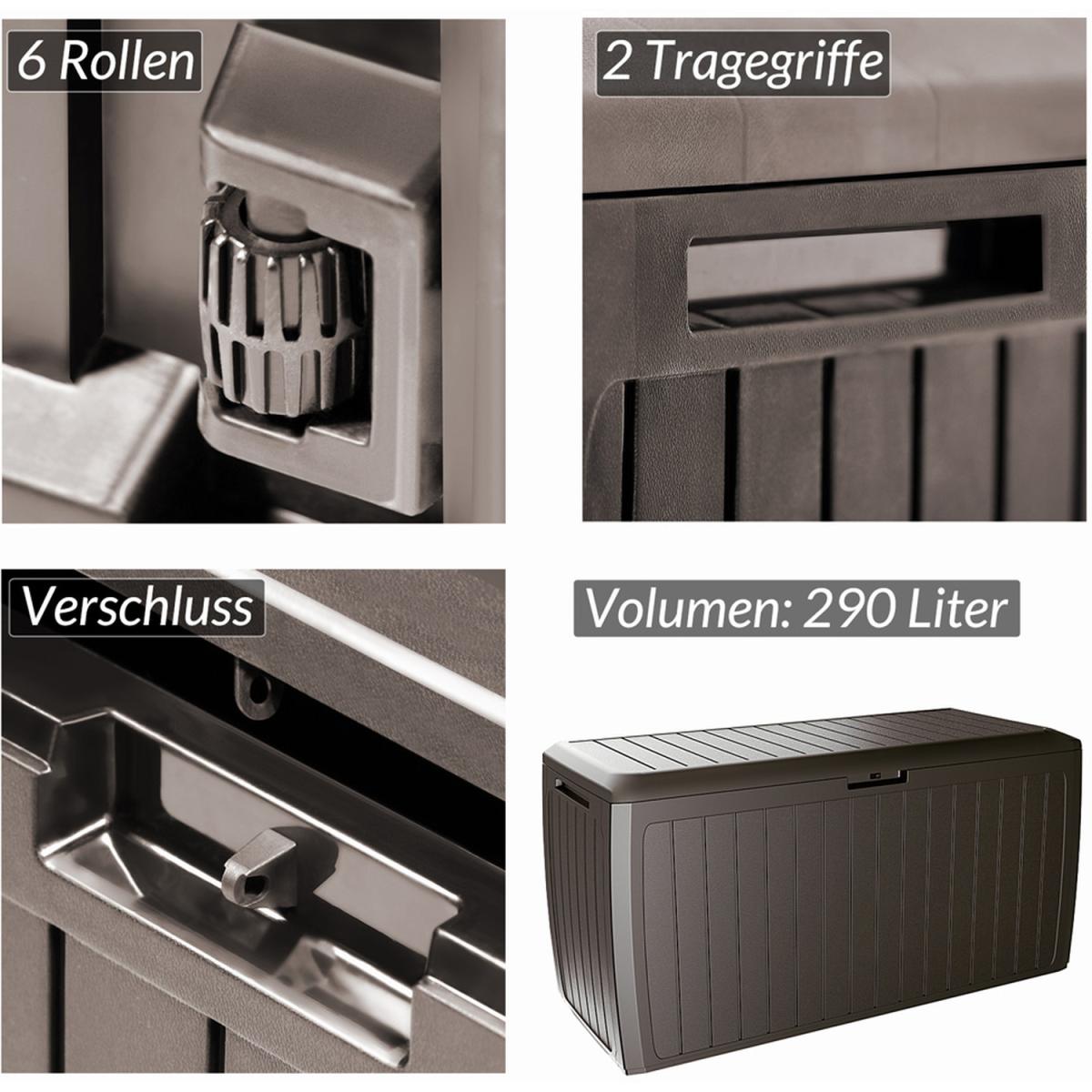 Ideal storage option for your garden cushions! This garden storage box is the ideal storage place for garden cushions, pillows and other garden accessories. Weather and UV-resistant storage box with a volume of 290 litres offers enough space for your garden items. It comes with 6 castors, a closing device at the lid and lateral carrying handles. Quickly assemble the chest by its smart click System.