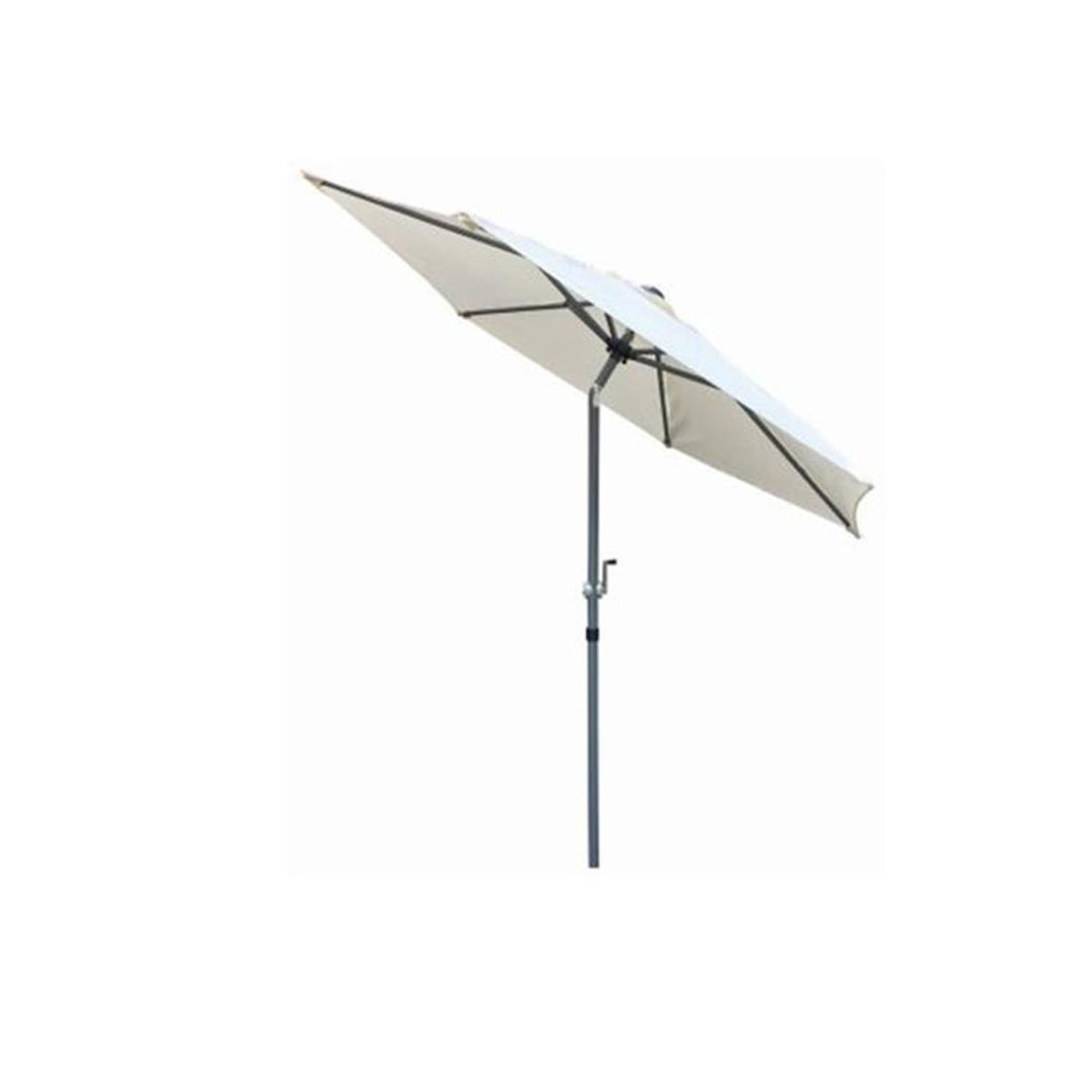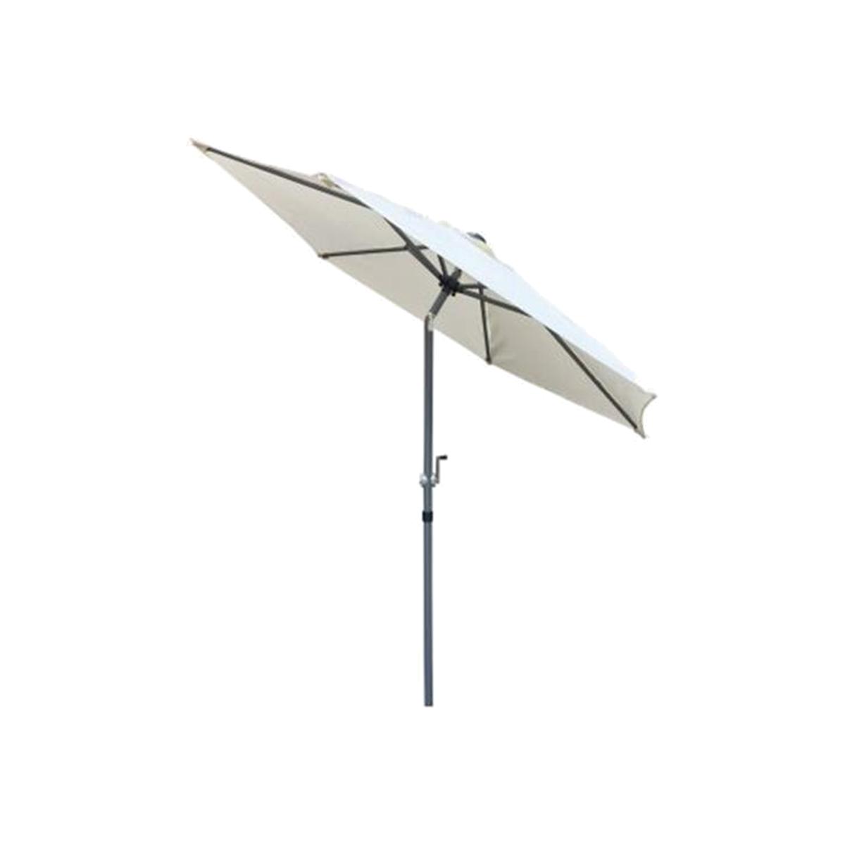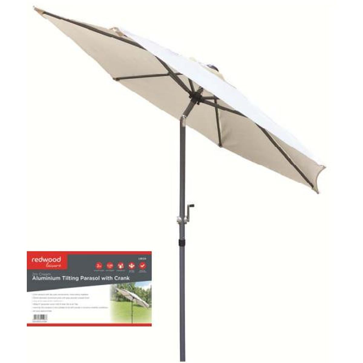 This outdoor parasol is perfect to create some shade and protect you from the sun's harmful UV rays. Easy to assemble, disassemble and store. Simply connect the two aluminium poles and ensure the locking clips are secured. Wind the plastic crank handle to open and close the umbrella, the tilt function can be activated by the press of a button, allowing you to achieve optimum shade no matter which way the sun is facing. Easy to maintain cream polyester canopy. Simply wipe clean with a damp sponge or cloth and allow to dry. We would recommend using the parasol with a sturdy base, (sold separately) and we would advise that the item is safely stored when not in use.