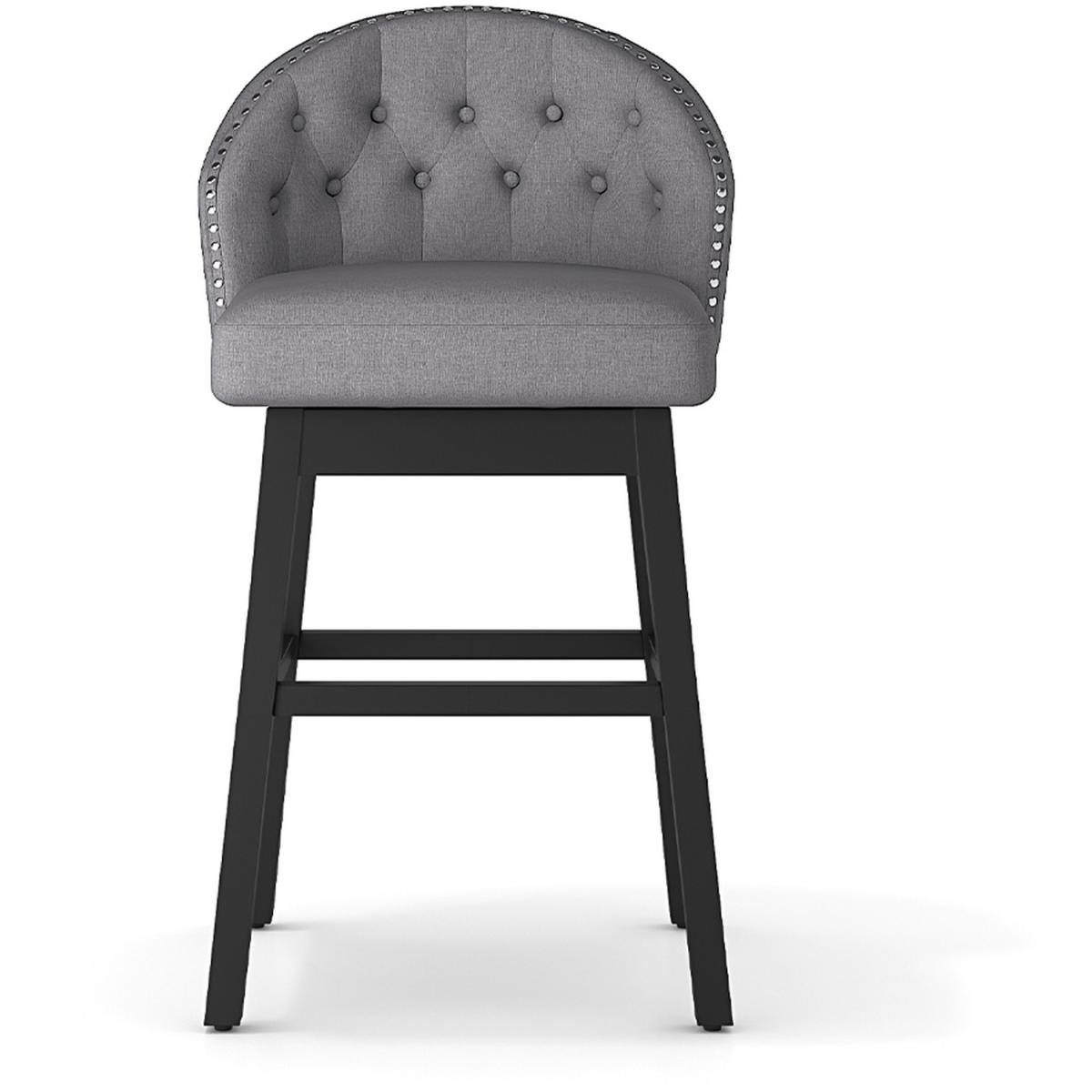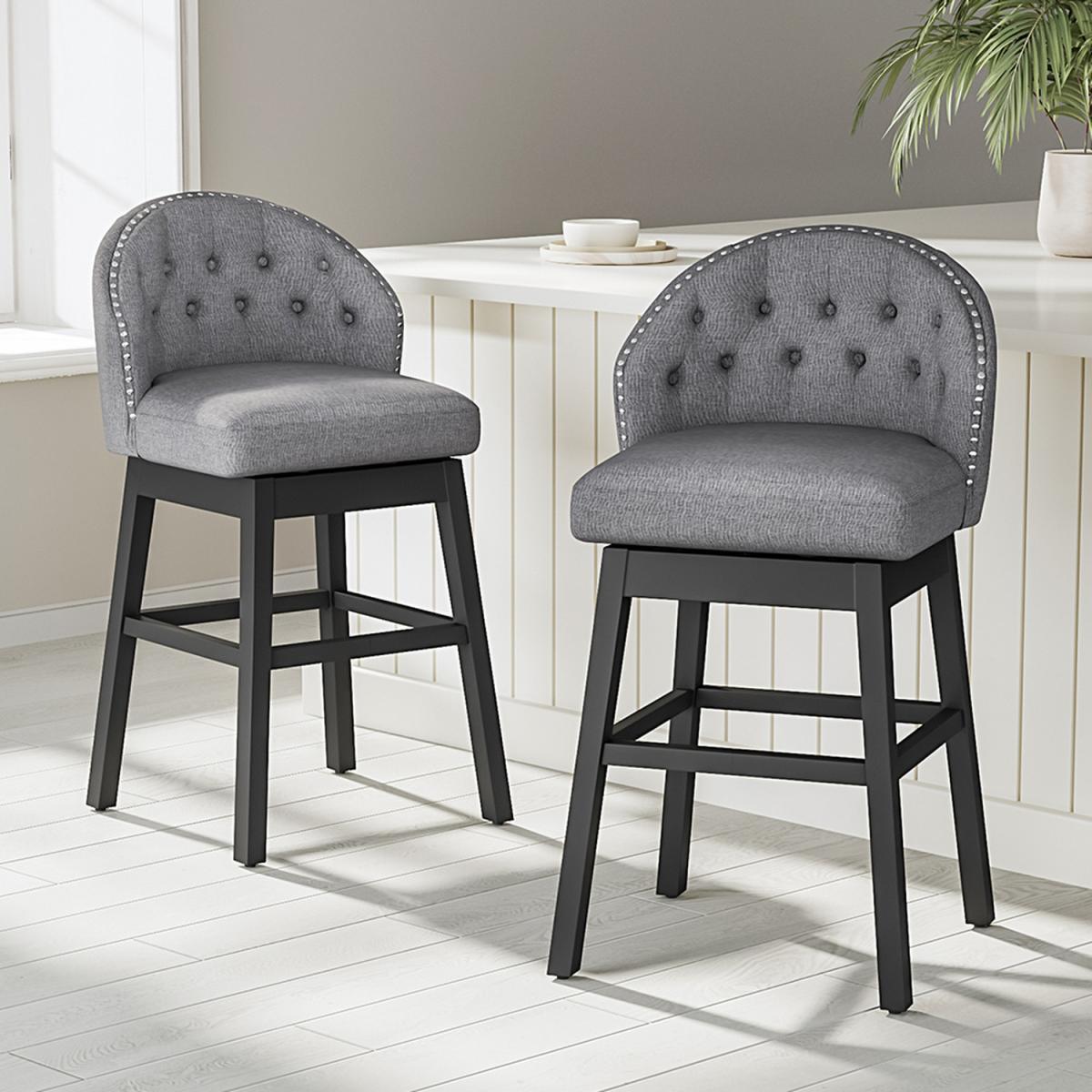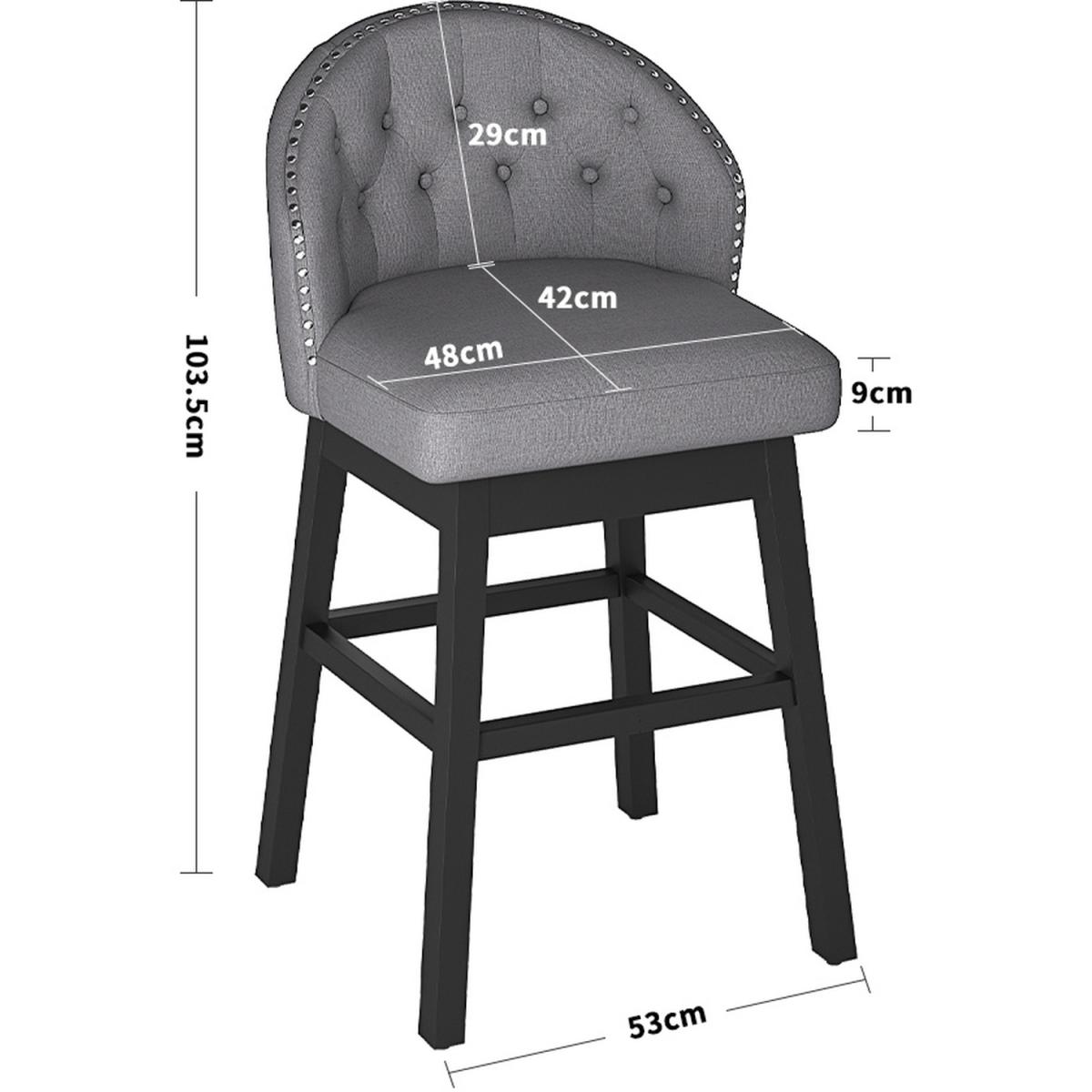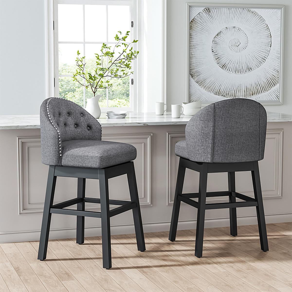 The bar stools is made of premium rubber wood and upholstered linen seats, luxurious deep buckle back, ergonomically upholstered seat that can rotate, allows you to relax your body. Compared with hard bar stools, our upholstered kitchen stools are built for utmost comfort, thickened elastic foam for a firm feeling, which helps to relieve muscle fatigue and will not make you feel tired after hours of sitting. Non-slip anti-scratch rubber ring under the base to protect your floor from scratching and reducing noises when swiveling. The elegantly designed nail head trimming, this eye-catching dining chair matches with any decor style. Flat package, but easy to assemble in minutes with the instruction provided. Suitable for commercial and domestic use, especially in bars, living rooms, kitchens, coffee shops, markets, coffee shops, counters, barber shops, offices, etc.