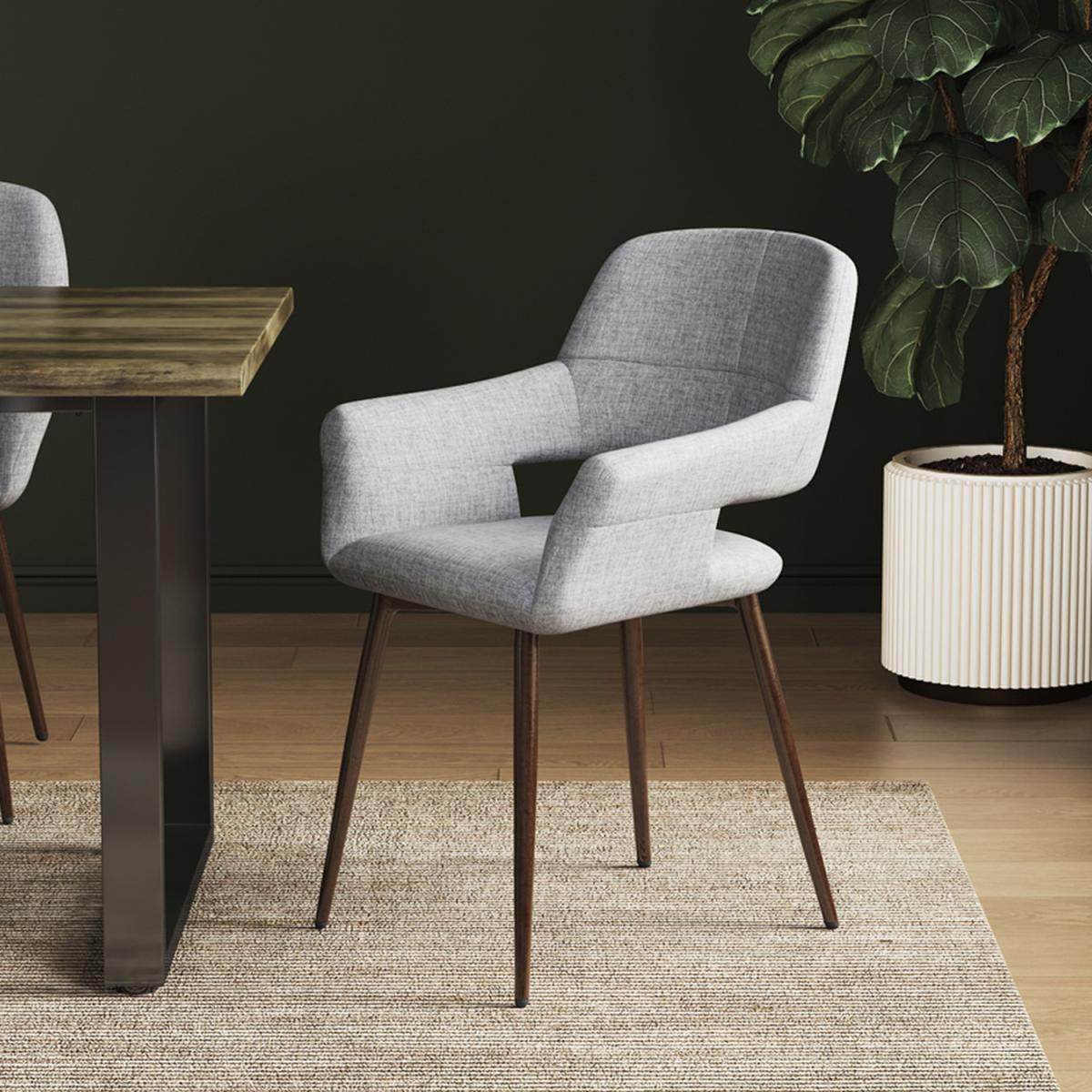 Using High quality natural touchable soft linen fabric, advance sense in appearance, classic light grey color, match any style of room easily. Filled with high density sponge, which is very stretchy. With a simple streamlined design, the chair body seamlessly transitions into the sloped armrests, fit your arms perfectly, giving your arms extra comfort. Metal legs guarantees durability, and strong load-bearing, stand maximum 150kg at most. With splayed slender chair legs crafted with powder coated metal and protective feet to prevent floor scratching. Flat package, easy to assemble with instruction included. Suitable for dining room, living room, kitchen, office, coffee shop, dressing lounge furniture.