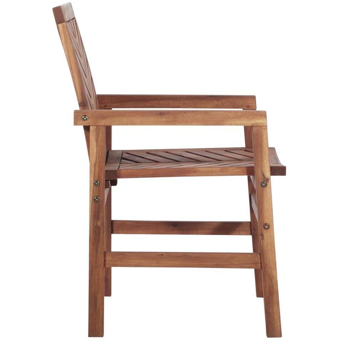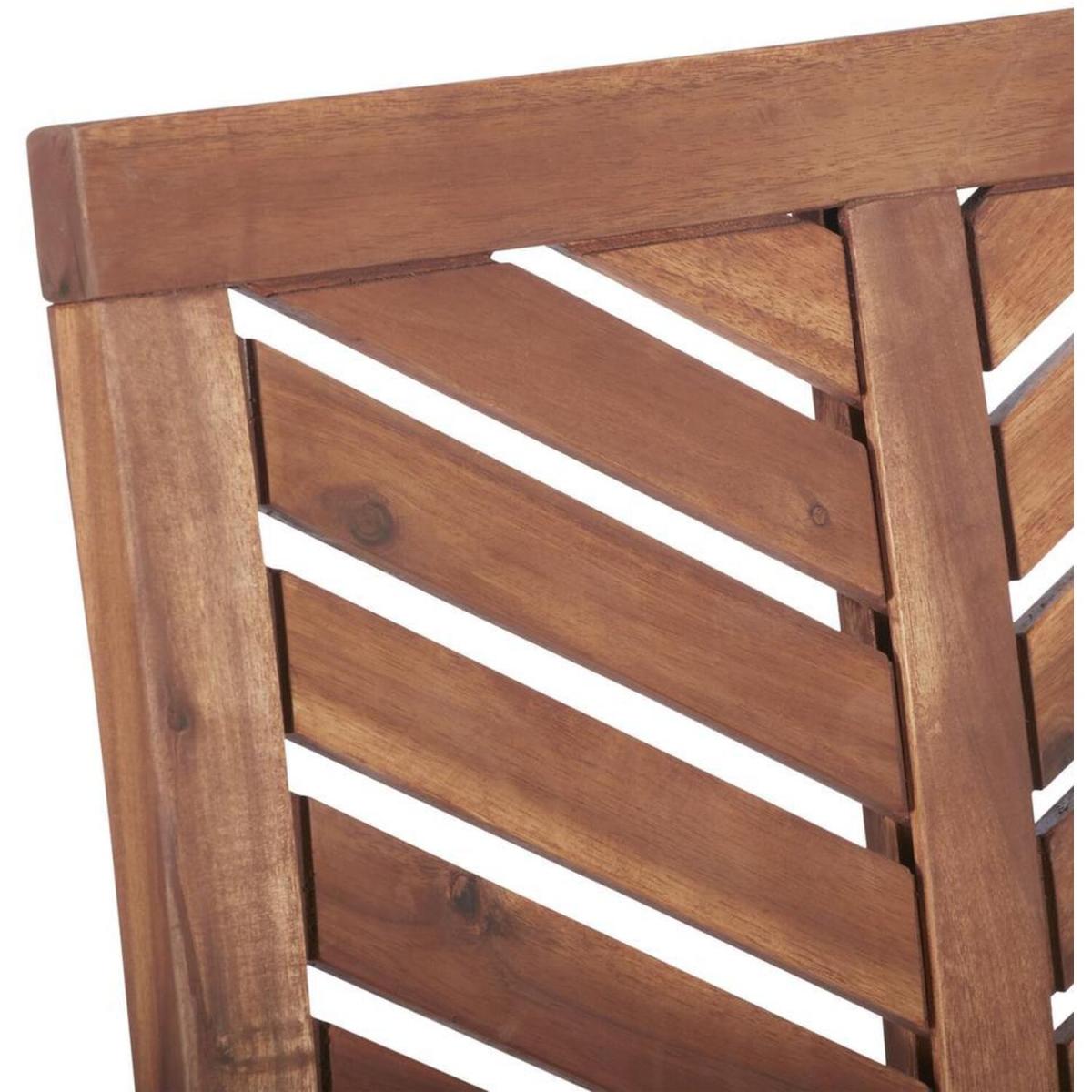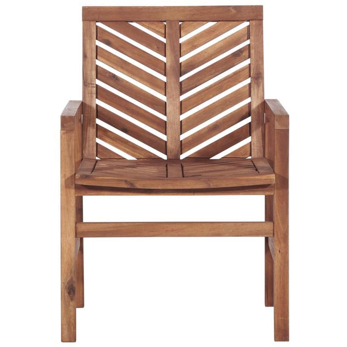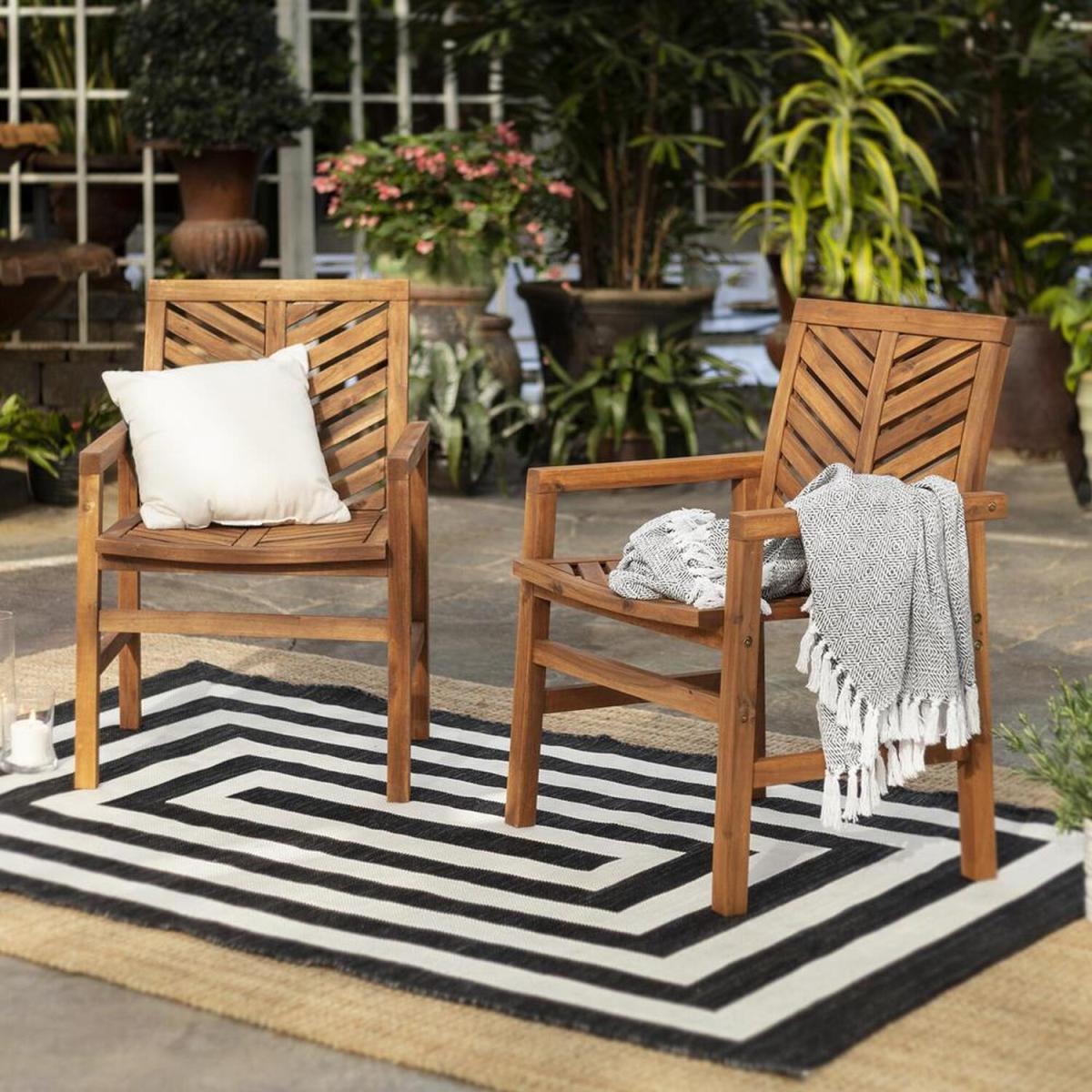 Provide outdoor seating space with these stylish patio chairs. Of a transitional and modern design style, these chairs feature a chevron inspired seat and back rest. Made of acacia hardwood in a stained finish to complement with the outdoors. Set in your backyard, or on your patio, deck, or porch to lounge on while you enjoy the sunset or chat with a friend. This set includes two chairs.