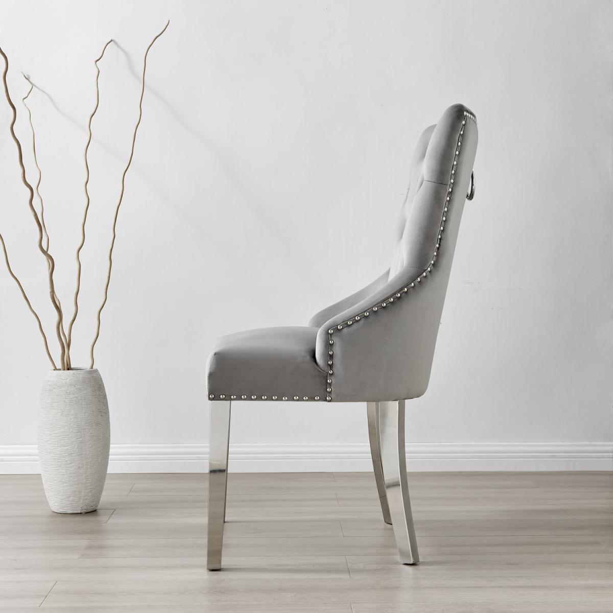 The Belgravia knocker chair is the ultimate dining chair opulence with its scoop back design that allows you and your guests to lean back and feel supported by the wrap-around arms. Stylish Chesterfield-inspired button tufting and diamond stitching add to the modern chic look. The design gives us straight lines and soft padded curves contemporary and comfortable. The thick filled seat cushion is supportive and comfortable and is complemented by the silk grey velvet fabric.