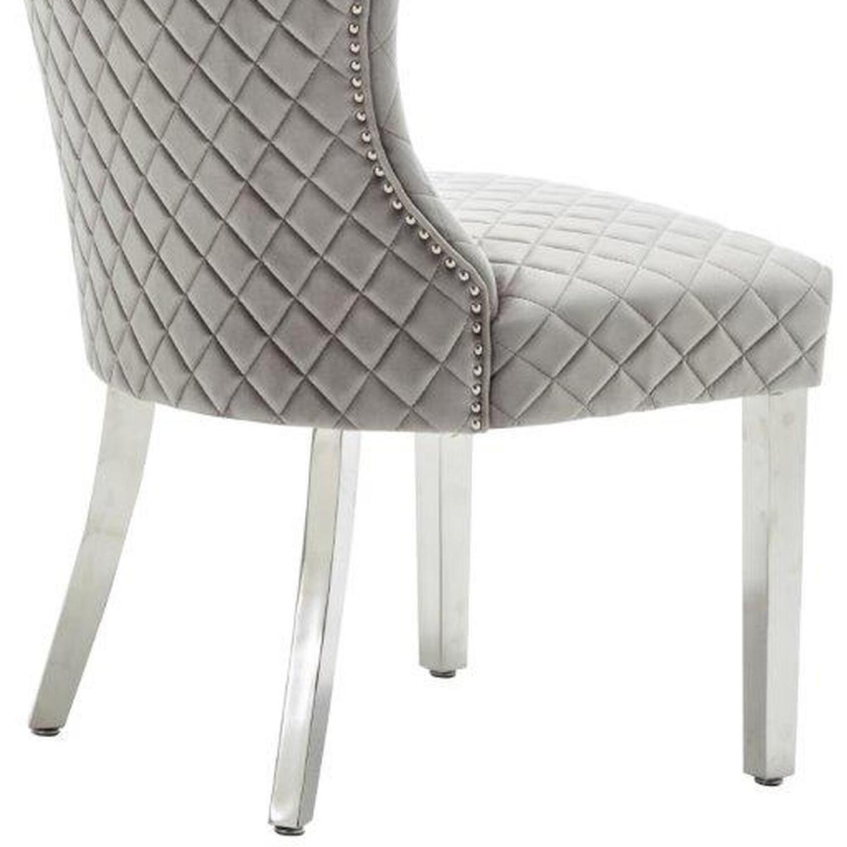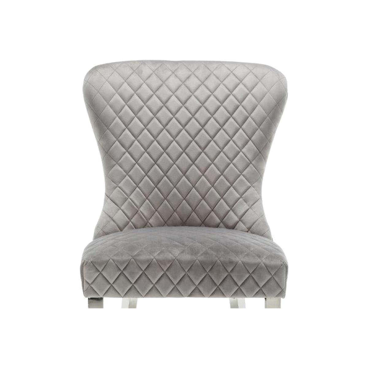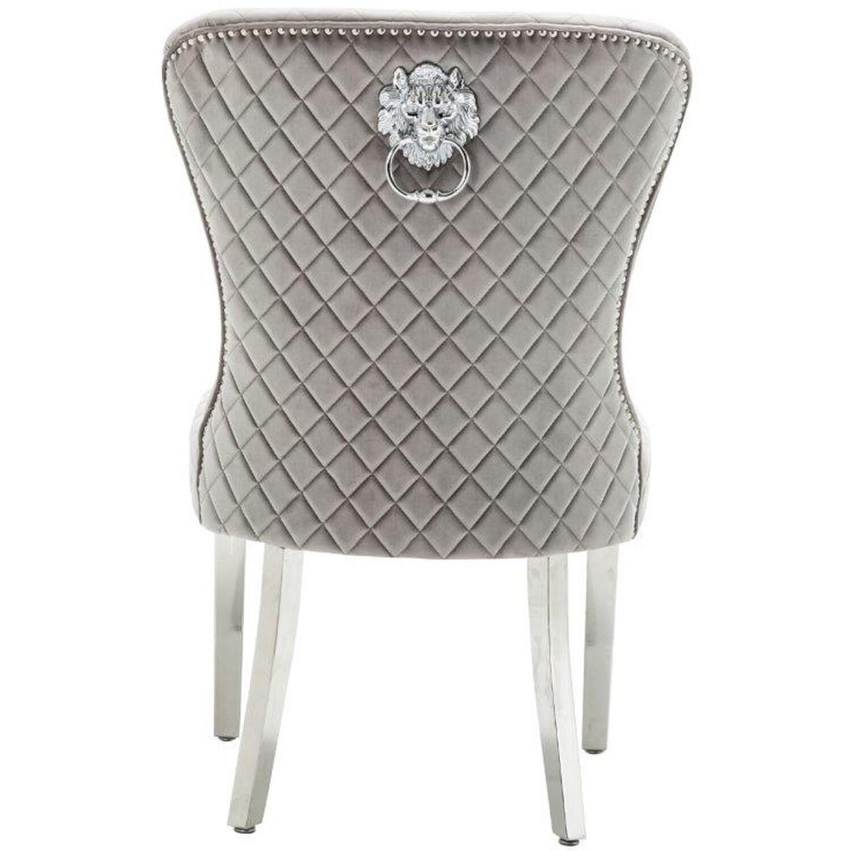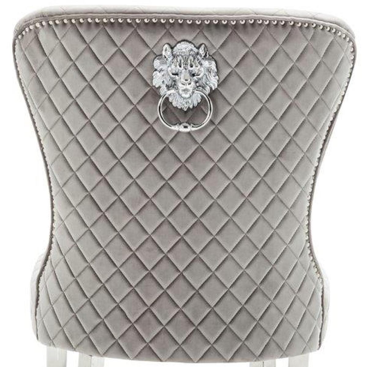 This chair is a statement of luxury with its stunning Lion Knocker back design and chrome polished steel legs. The padded seat and wide curved backrest are upholstered in a luxuriously soft, quilted velvet fabric which could only mean one thing - great comfortability. Polished chrome legs to deter unsightly knocks and scuffs - preventing is better than dealing with it Sumptuous deep upholstered back panel. Quilted back - stunning, eye-catching design! Adjustable foot for unlevelled floors - create the perfect fit for your flooring.