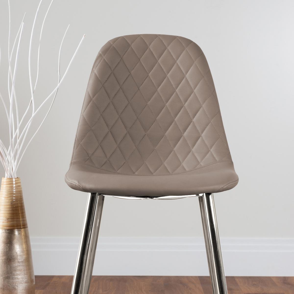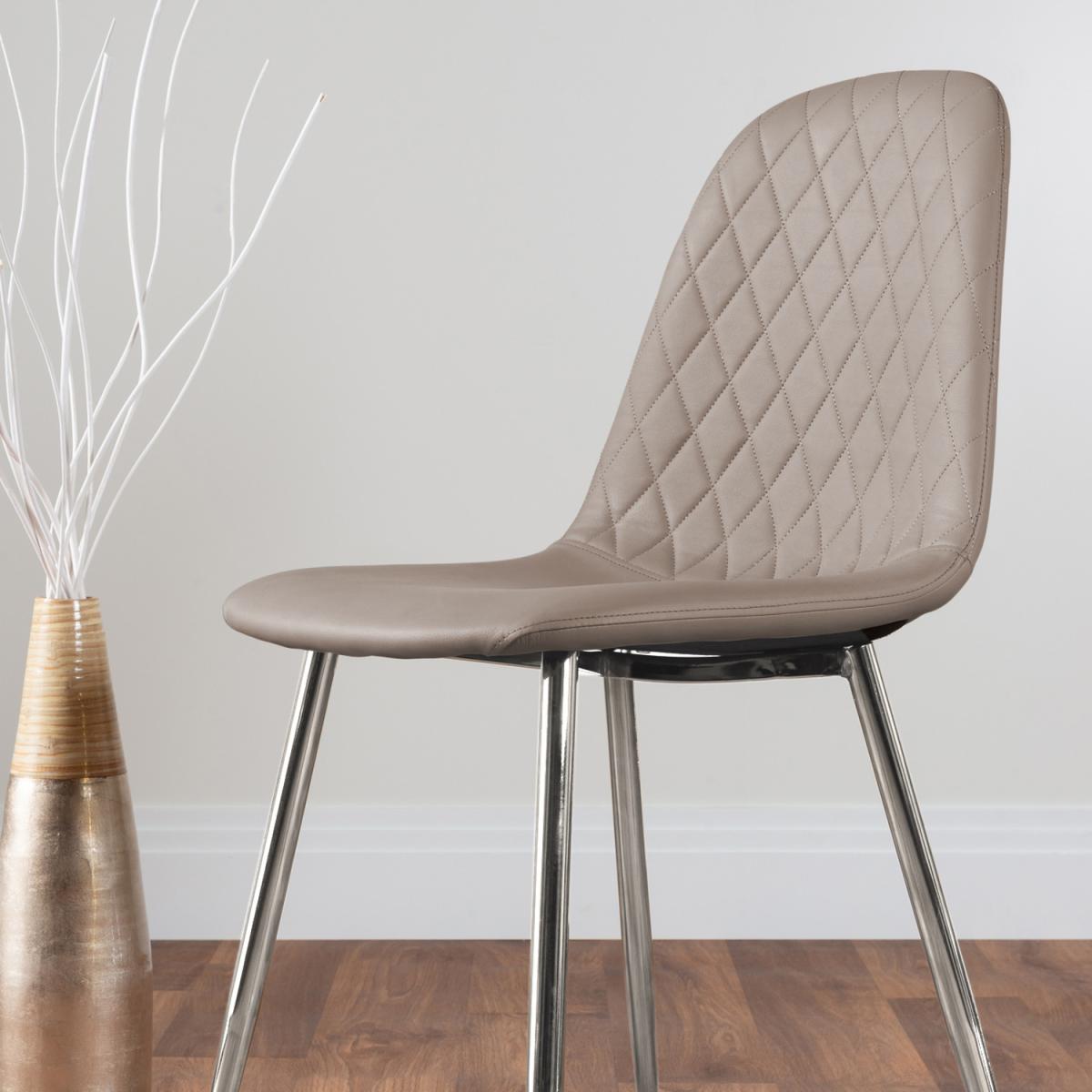 With a perfect balance of pattern and texture, the new Corona Chair is a statement piece ready for the modern dining space. The trendy chrome legs are all the rage and offer a perfect way to add an accent of lustre to your home. The Scandi-style faux leather seat with diamond pattern stitching is a unique take on a classic design offering comfort and durability for everyday use.