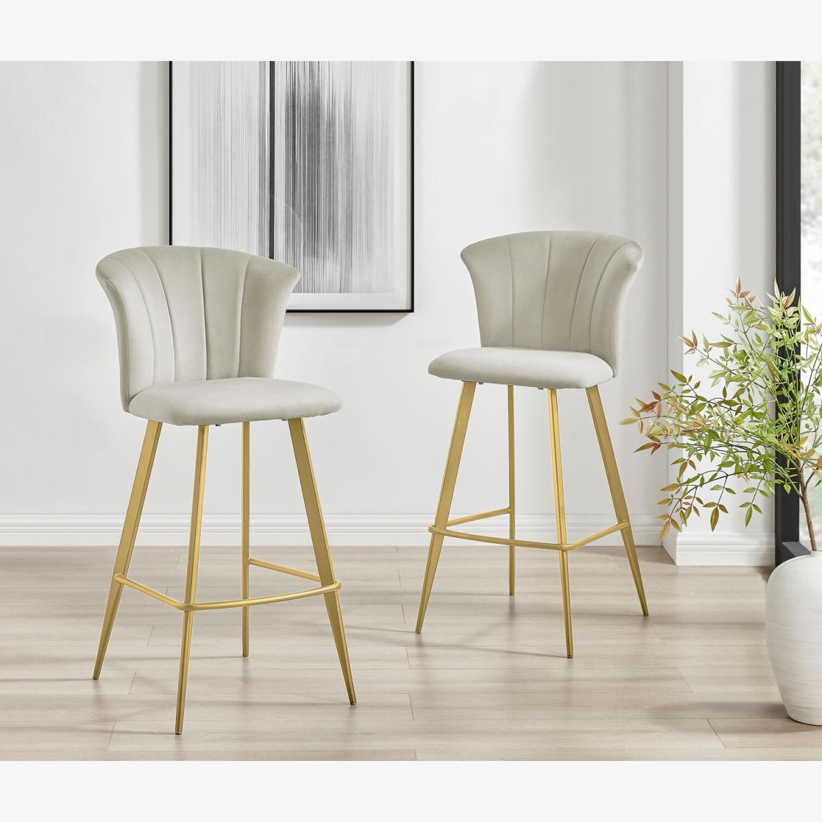 Our Juniper velvet-upholstered bar stool is elegant and stylish. The fluted backrest and vertical stitching give it a 1920s Art Deco vibe and the tapered gold metal legs with bar foot rest keep it super modern and bright. This would look great in a maximalist glam or industrial home setting, or even injecting a pop of colour into a more neutral home style. Sumptuous soft-touch velvet with a lovely thick padded seat and an ergonomic design will make sure you're comfortable while sitting in style. Available in a range of other fabric and leg colours!