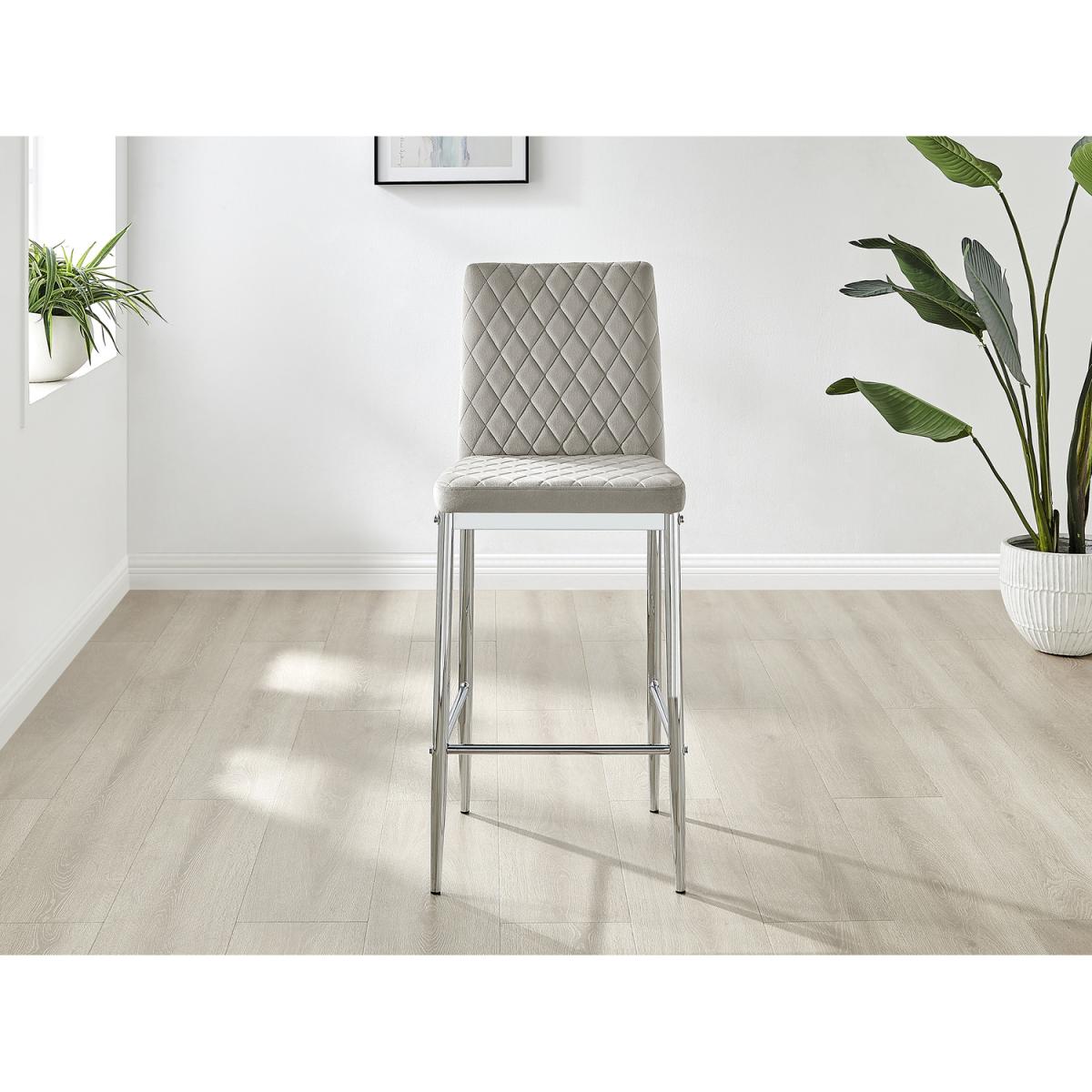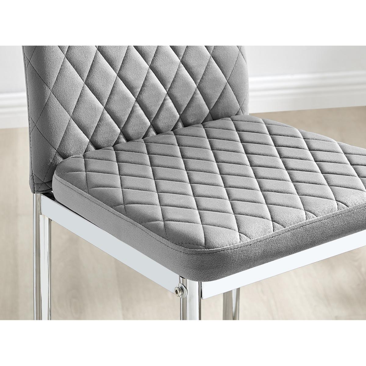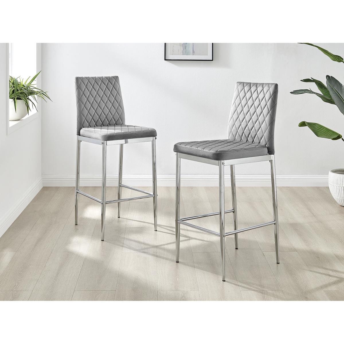 Upholstered in soft touch velvet and finished with diamond pattern stitching the Milan bar stools would seamlessly fit in with most dining spaces, whilst not compromising on either style or comfort. The stylish silver chrome metal leg and hatched velvet combination gives this chair a contemporary edge, whilst it's simple design allows for practical everyday usage. The chairs are made from high quality durable velvet that's easy to keep clean and are ergonomically designed for maximum comfort and support. They feature a deep foam seat cushion and plastic feet to protect the floor from any damage! At an unbeatable price you cannot go wrong with these chairs!