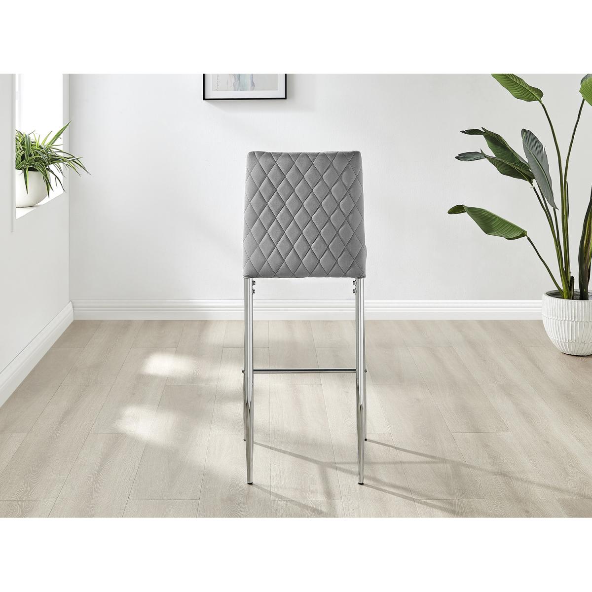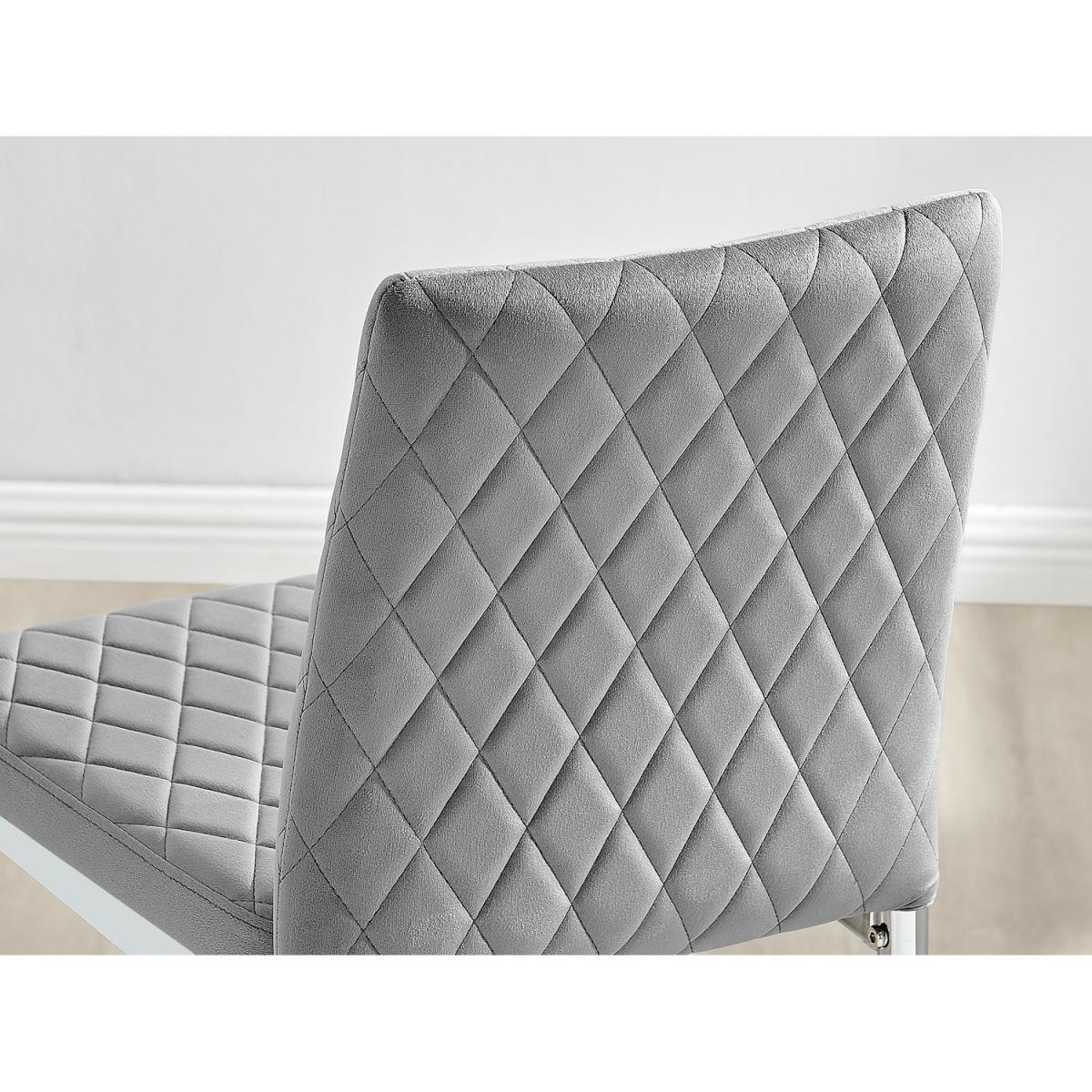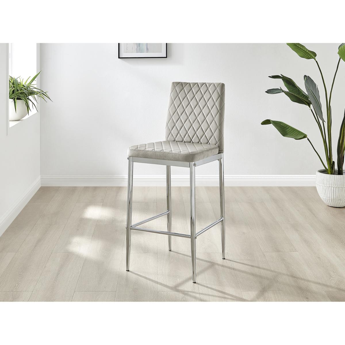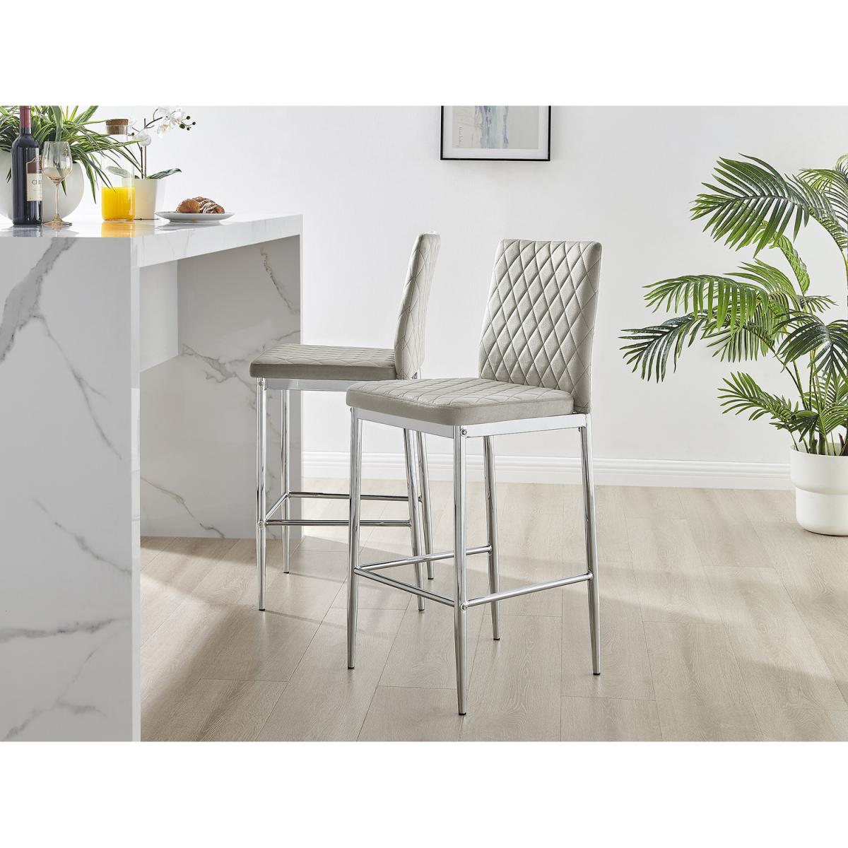 Upholstered in soft touch velvet and finished with diamond pattern stitching the Milan bar stools would seamlessly fit in with most dining spaces, whilst not compromising on either style or comfort. The stylish silver chrome metal leg and hatched velvet combination gives this chair a contemporary edge, whilst it's simple design allows for practical everyday usage. The chairs are made from high quality durable velvet that's easy to keep clean and are ergonomically designed for maximum comfort and support. They feature a deep foam seat cushion and plastic feet to protect the floor from any damage! At an unbeatable price you cannot go wrong with these chairs!