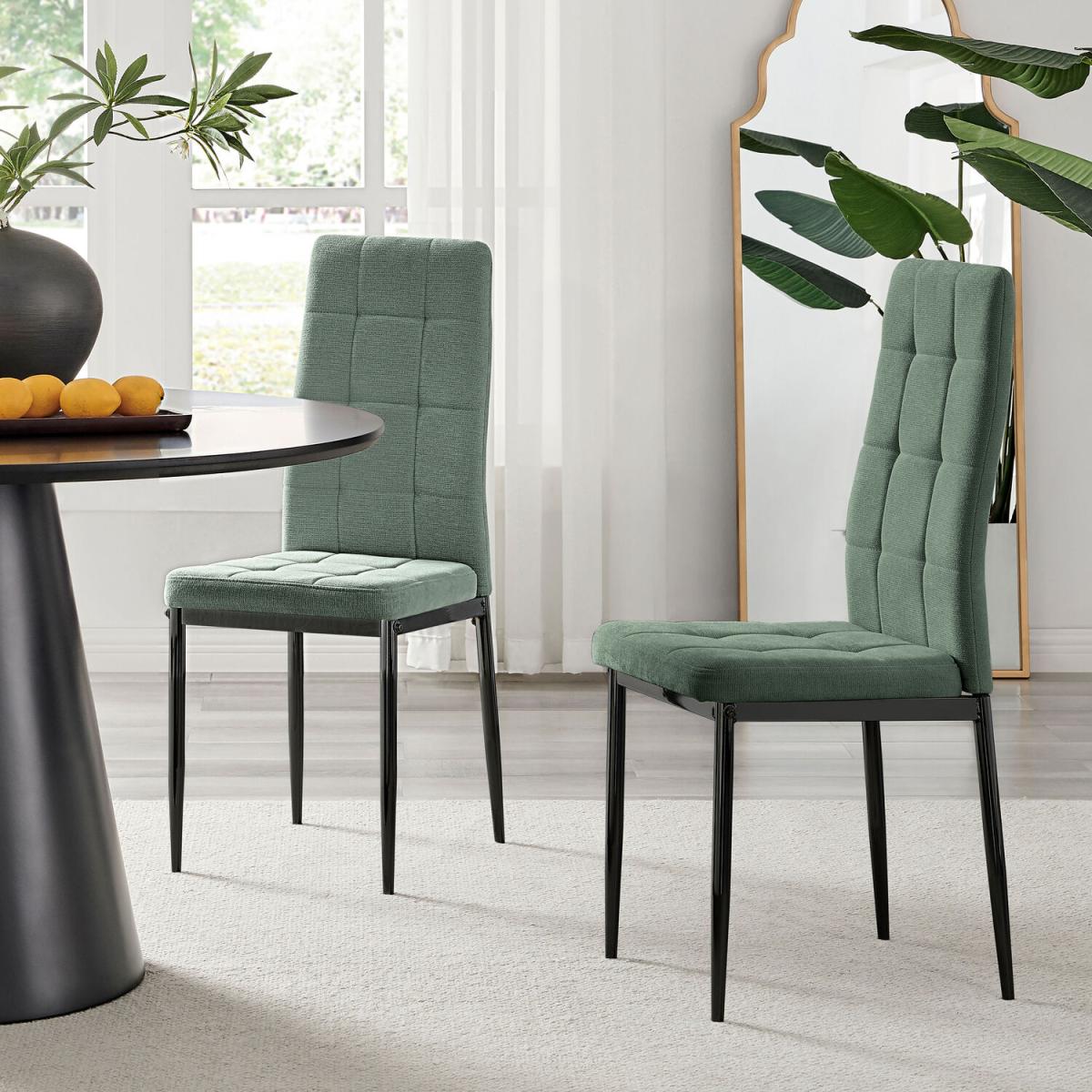 Our Paloma fabric dining chair is a great addition for any contemporary dining or kitchen space! A modern design featuring straight lines, a tall back and square stitching with button tufting details to the chair and seat. Upholstered in a lovely fabric with a textured weave, sat on sturdy black metal legs, and ergonomically designed for comfort and support. Available in a variety of colours, so shop the full Paloma range now!