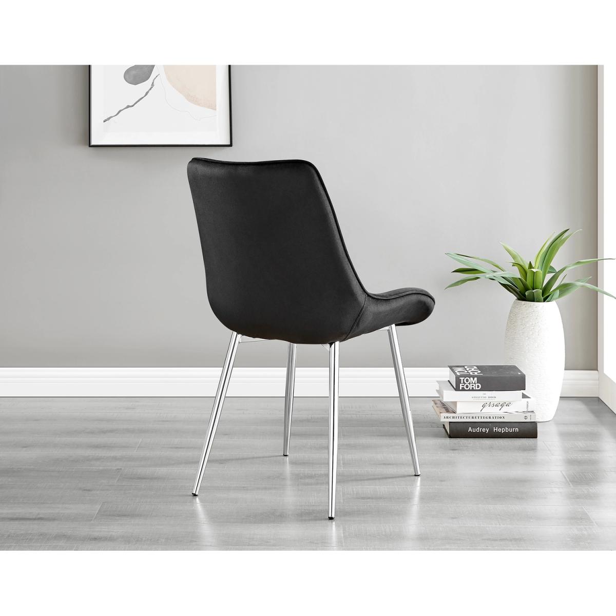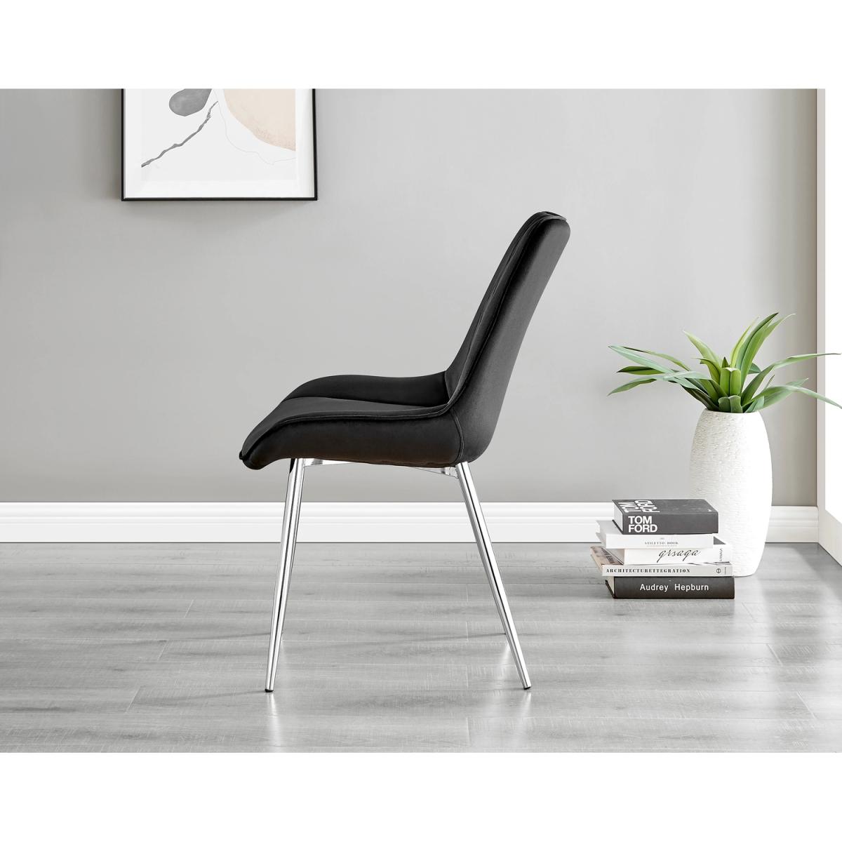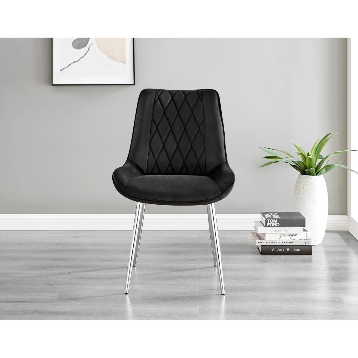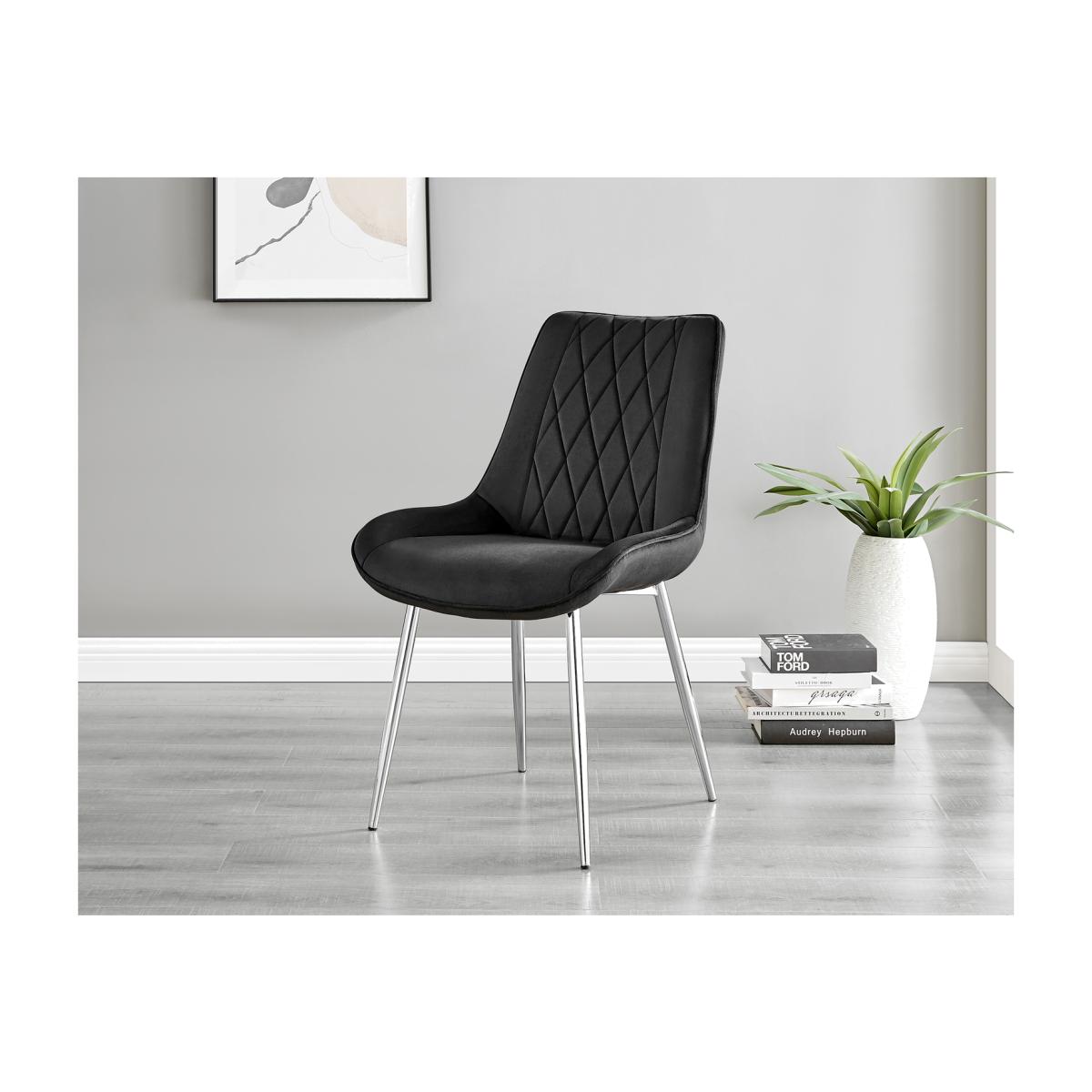 Modernise your dining area with our luxurious velvet upholstered Pesaro Dining Chairs. With a nod to the Mid-century modern design era, the Pesaro features gorgeous textured diamond stitching with an ergonomically designed curved seat pad blending seamlessly to the supporting medium high backrest. Sat atop elegant slightly tapered legs in black, chrome or gold effect. The Pesaro is a perfect match to any dining table or use as a luxe vanity seat in the bedroom, as an occasional chair for the living area or to add a bit of luxury to your home office.