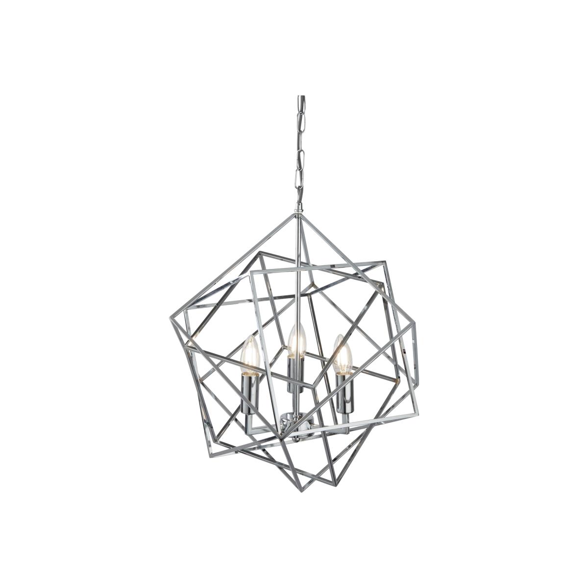 Dimensions H108 x W47.5 cm. Update your interiors with this quirky geometric globe chandelier. The design features several geometric style chrome overlapping frames. Inside this globe we find 3 candle holder lights that provide a soft glow. Features. Quirky style. Great centrepiece for any contemporary living space3 candle lights. Chrome finish. Adjustable at the point of installation Assembly required..