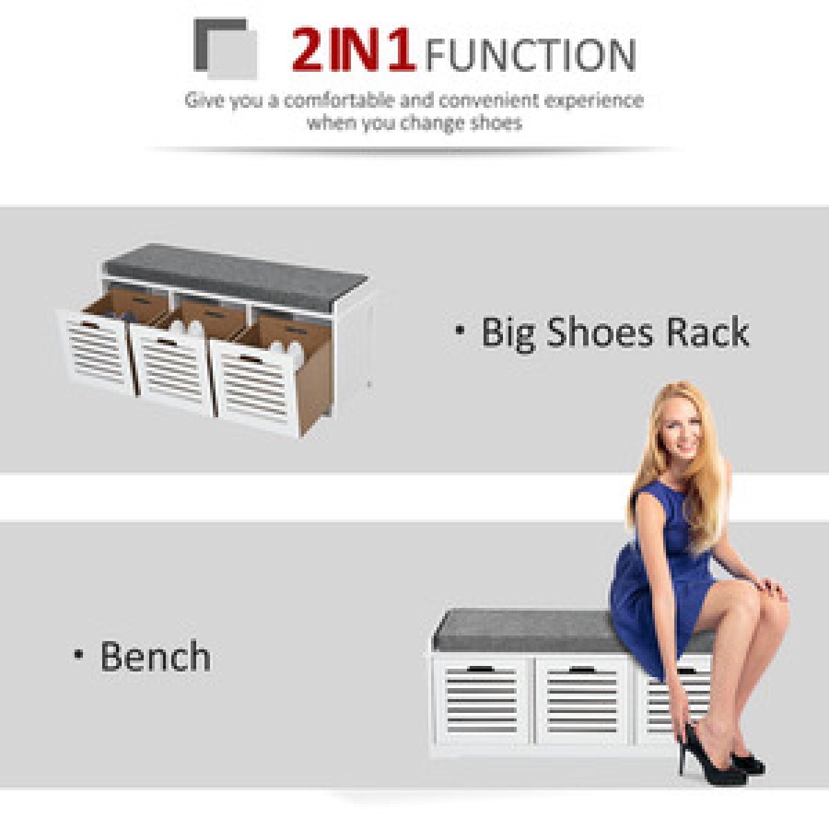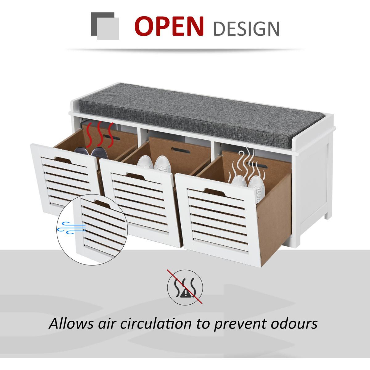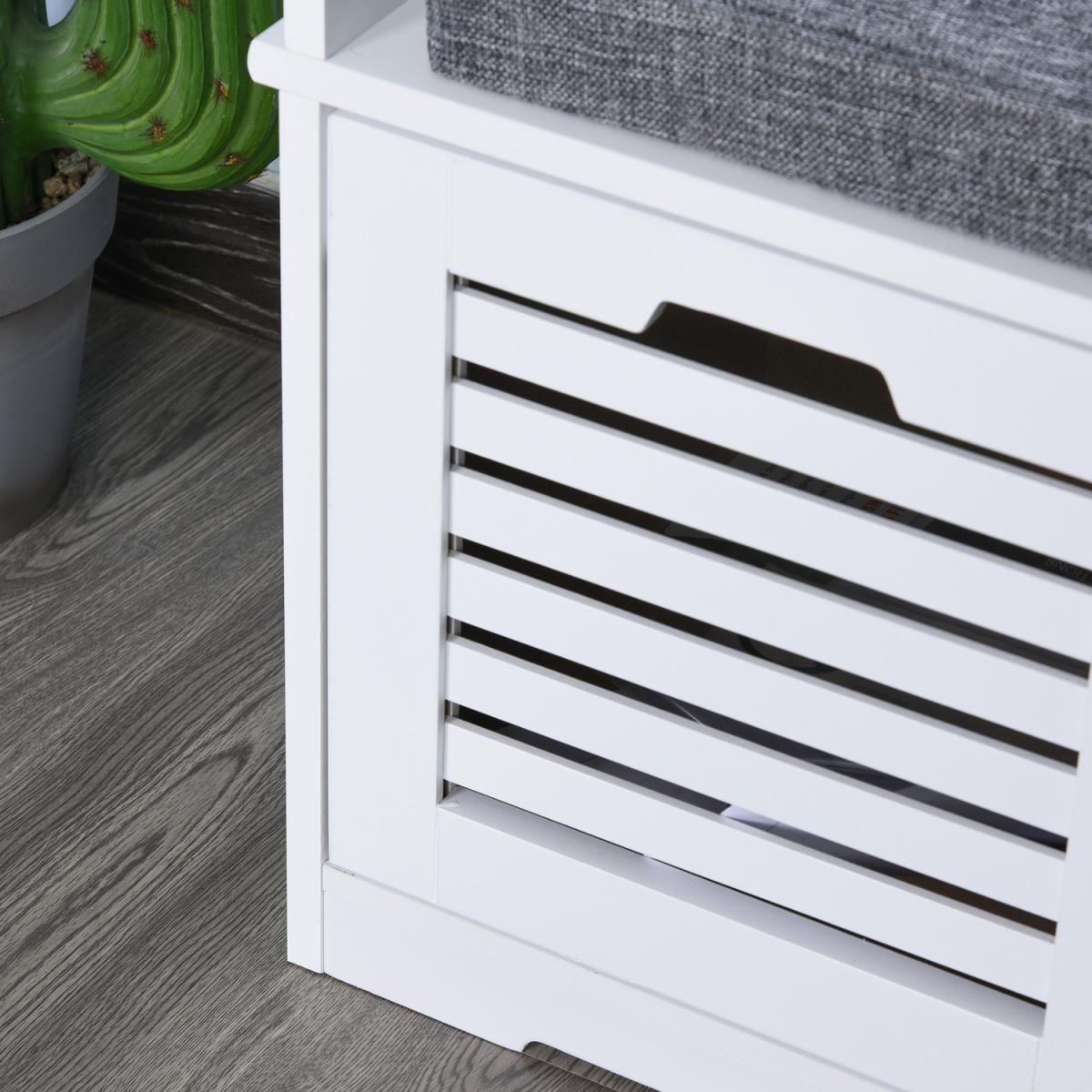 Give your shoes somewhere proud to stand with this storage unit from HOMCOM. Its design is made of three compartments for lots of holding space, with a flat cushioned top so you are able to sit on it. Made from MDF, the frame is tough and reliable for everyday use, finished in white for a fresh focal point in your home. Using a sponge for the cushion for comfort, it is wrapped in linen so it is smooth and easy to wipe clean. The slatted doors of the compartments allow fresh air to circulate through, with low corner feet elevating the unit to finish. An effortlessly easy space saver you'll love welcoming into the home.