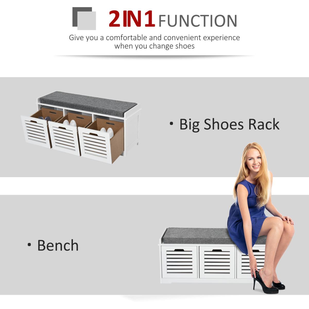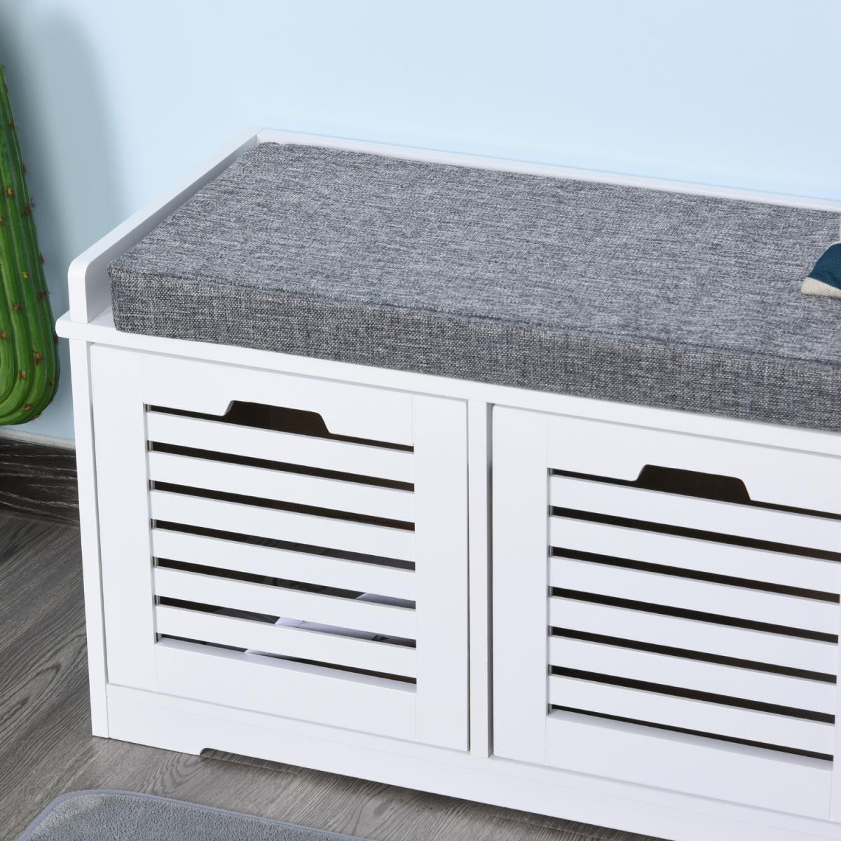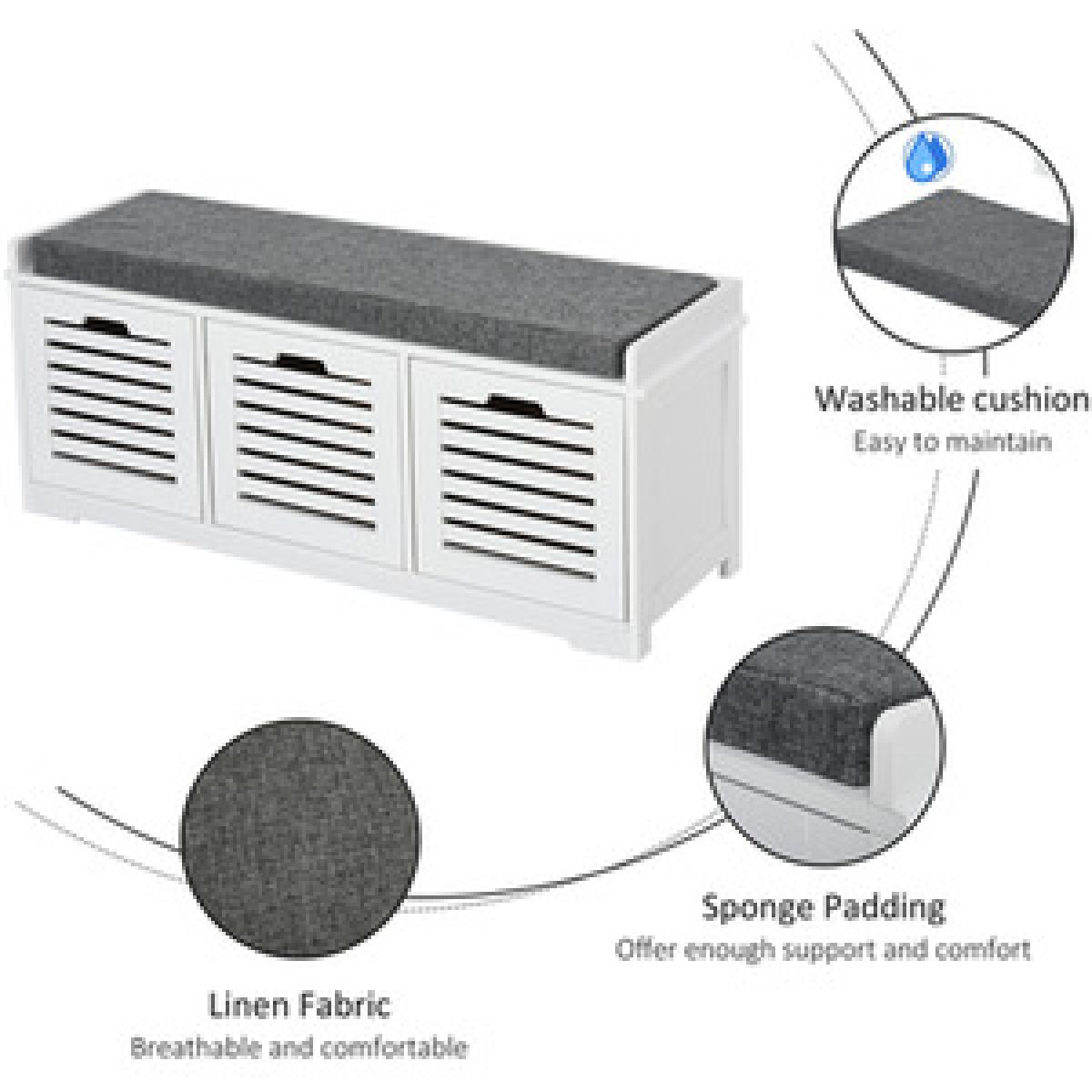 Give your shoes somewhere proud to stand with this storage unit from HOMCOM. Its design is made of three compartments for lots of holding space, with a flat cushioned top so you are able to sit on it. Made from MDF, the frame is tough and reliable for everyday use, finished in white for a fresh focal point in your home. Using a sponge for the cushion for comfort, it is wrapped in linen so it is smooth and easy to wipe clean. The slatted doors of the compartments allow fresh air to circulate through, with low corner feet elevating the unit to finish. An effortlessly easy space saver you'll love welcoming into the home.