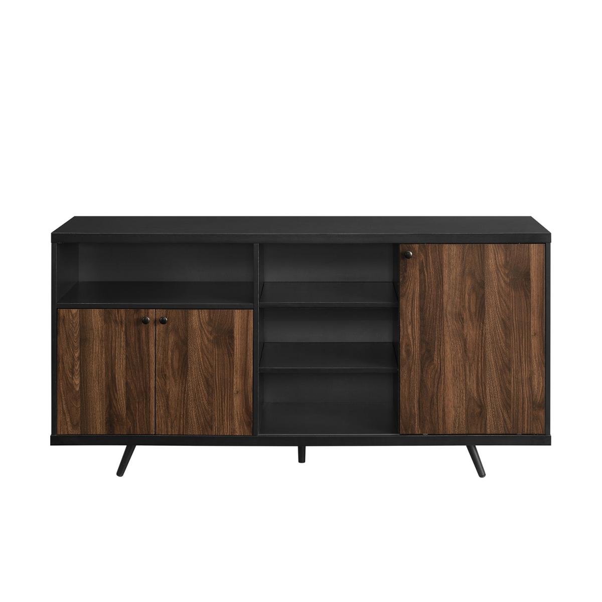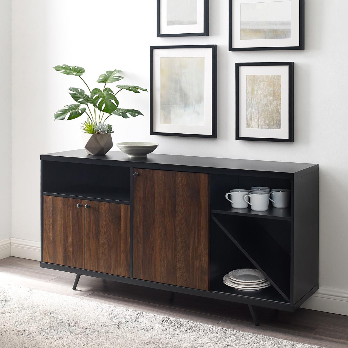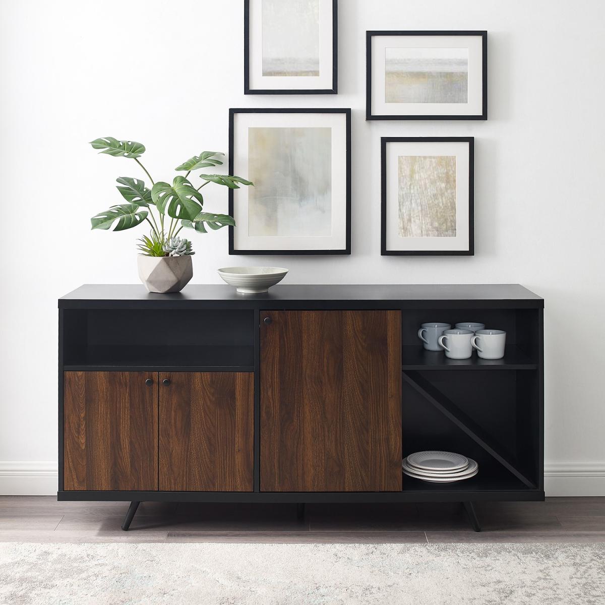 Dimensions H75 x W153 x D40 cm. Give your living or dining room a lift with this stylish and modern two-tone sideboard. Choose from designs in black and a rich walnut wood finish or white with a light oak finish. This console offers both open and closed storage for glassware crockery decorative peices and other knick-knacks. There is an open space in the top left corner of the unit and underneath are two doors concealing an adjustable shelf. On the right side is a contemporary sliding door cabinet concealing a few more shelves including a removable diagonal shelf which functions as a wine rack ideal for storing your wine bottles so that you could use this versatile piece as a spacious bar cabinet if you host frequently. Features. Warp resistant MDF Durable laminate powder coated steel5 adjustable metal feet Cord management2 fixed shelves3 adjustable shelves1 angled removable shelf. Ships ready-to-assemble with step-by-step instructions..