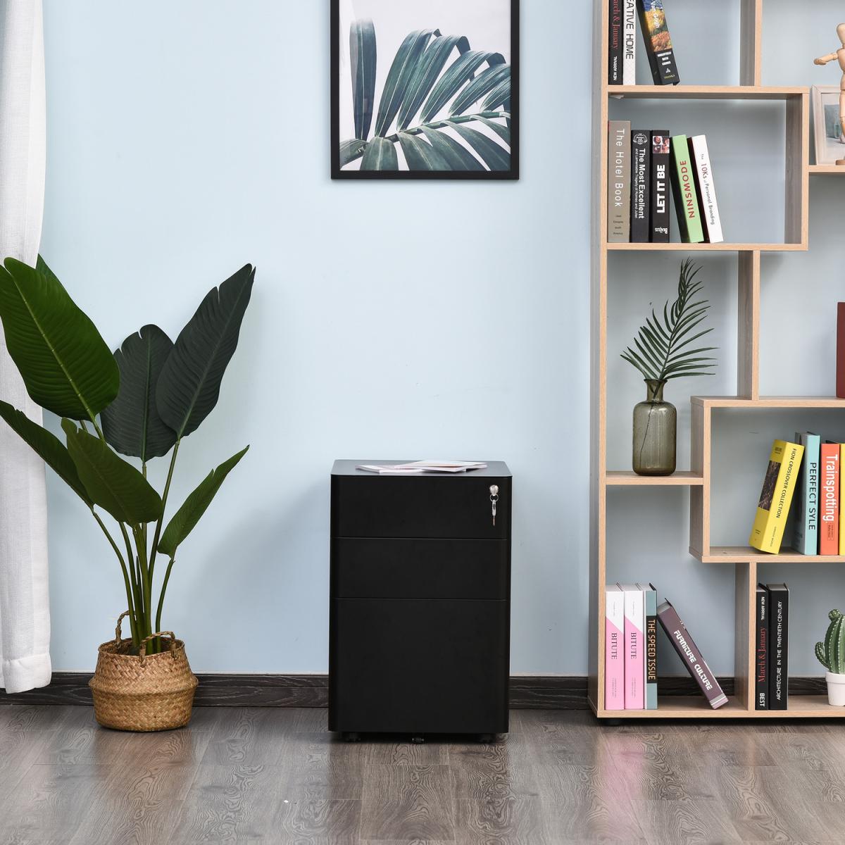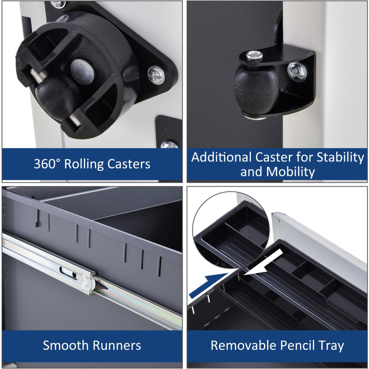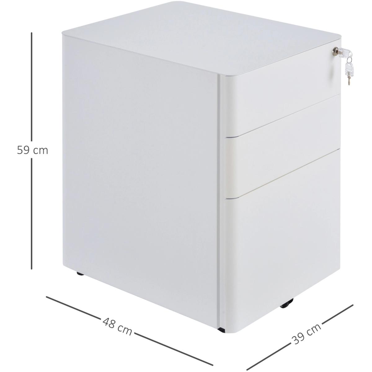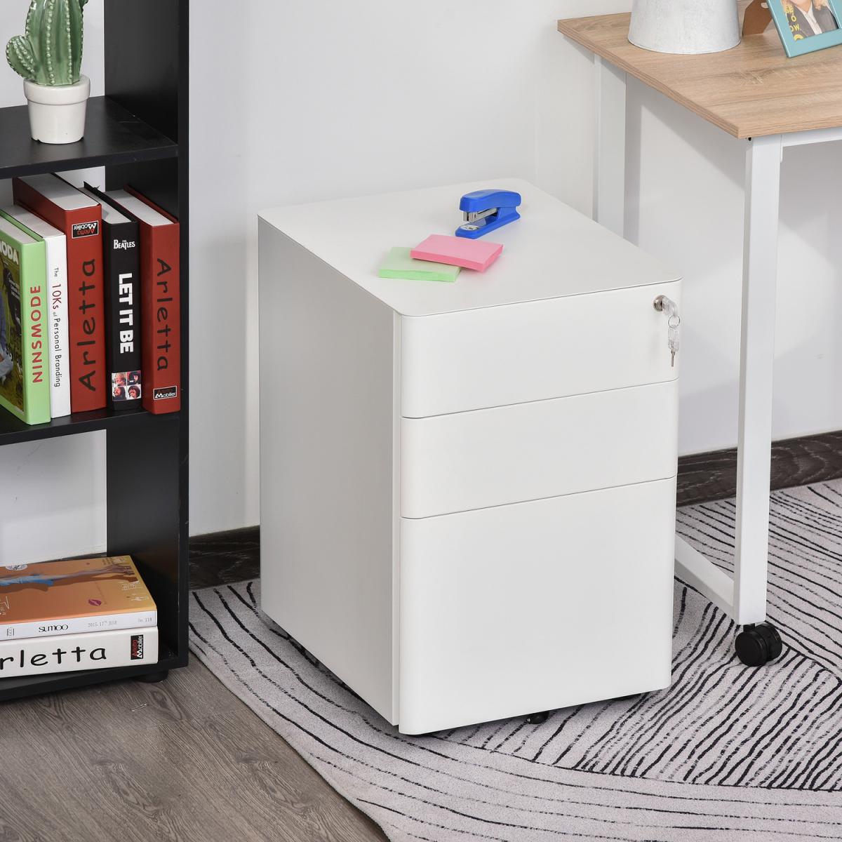 Keep your important paperwork organised and with this white metal filing cabinet from Vinsetto. Spacious in size, it features two small drawers and a large bottom drawer - perfect for all your paperwork and other office supplies. On the bottom, four omni-direction wheels are placed for you to move the unit around easily, and it is finished with a lock to keep everything safely secure when you're away.