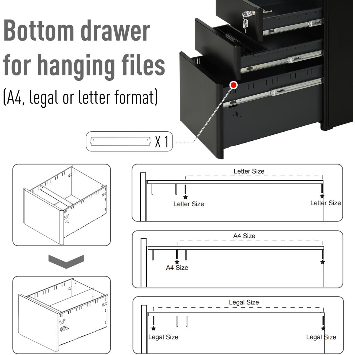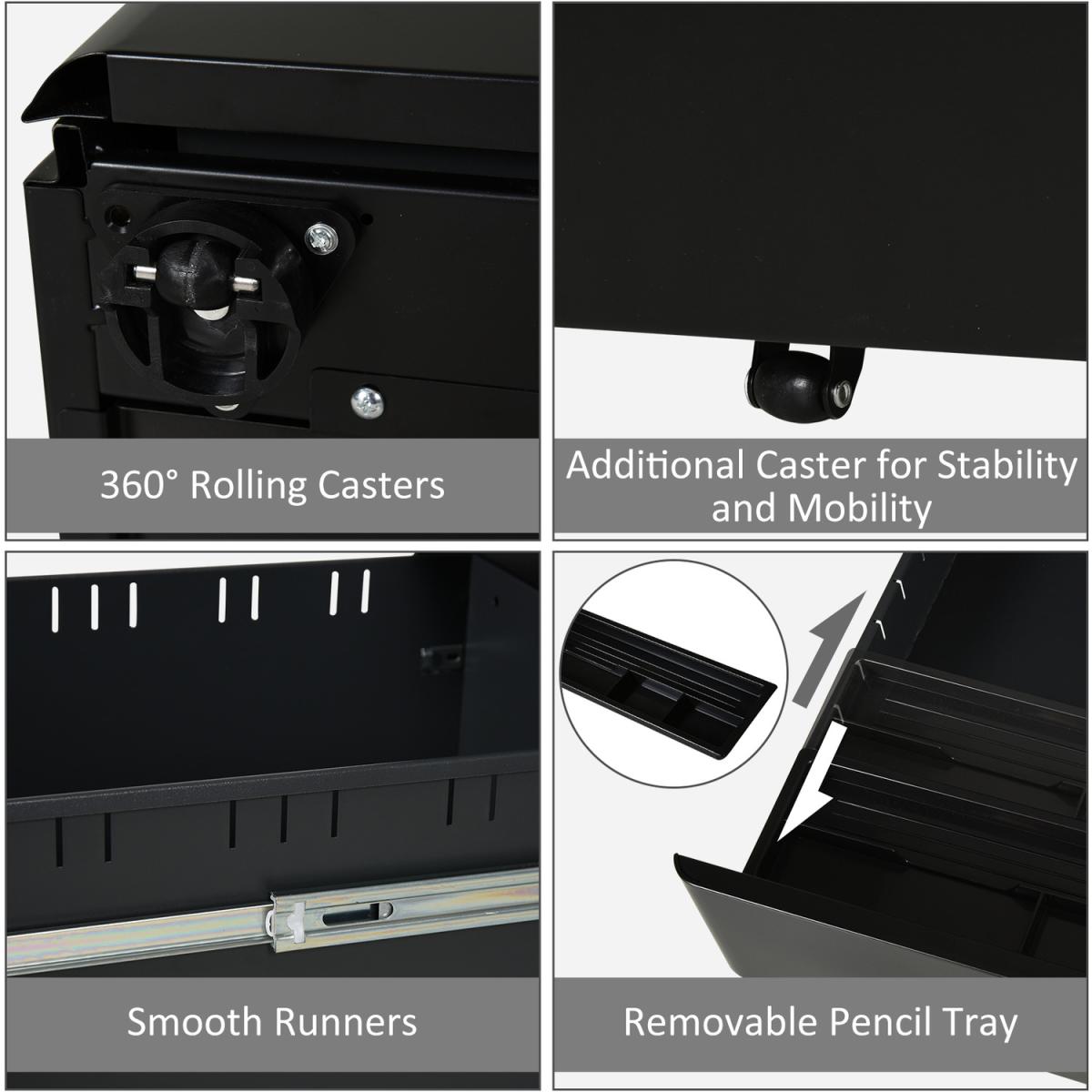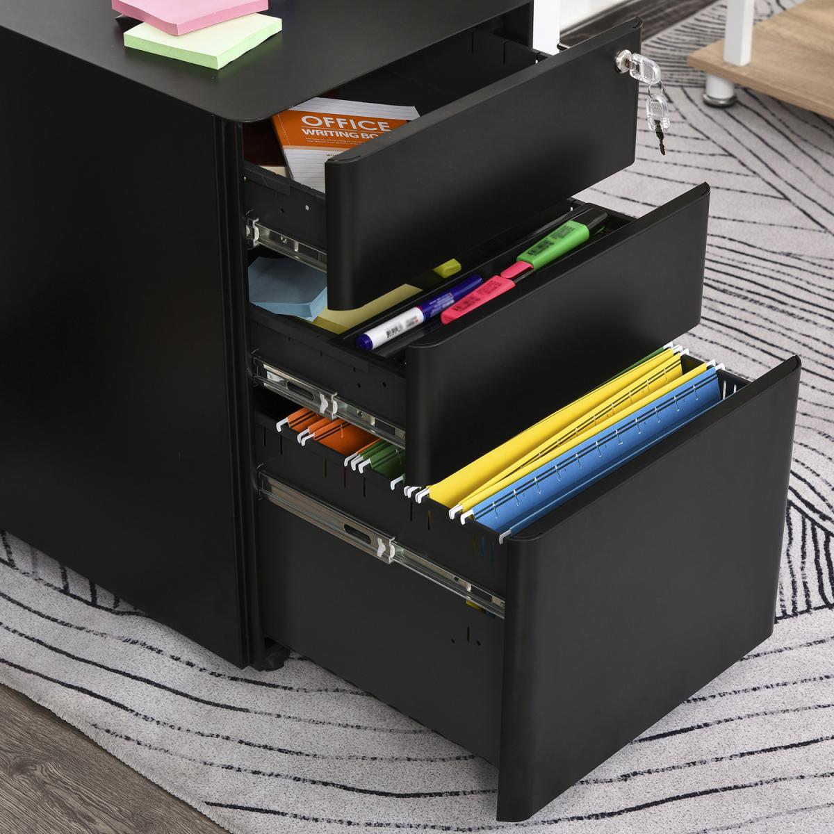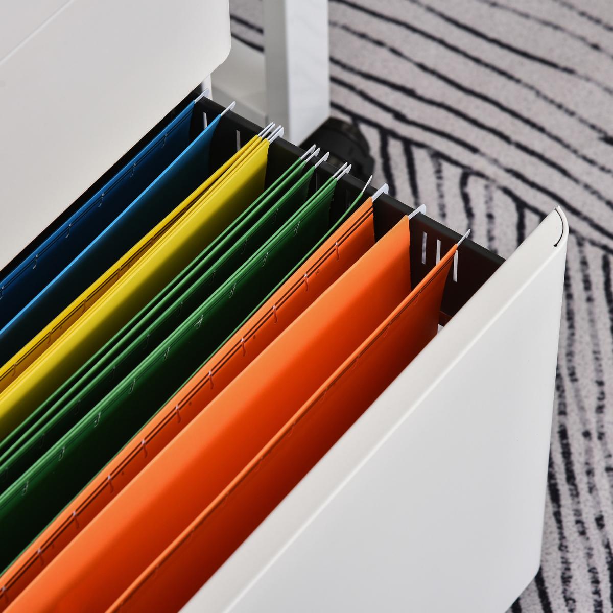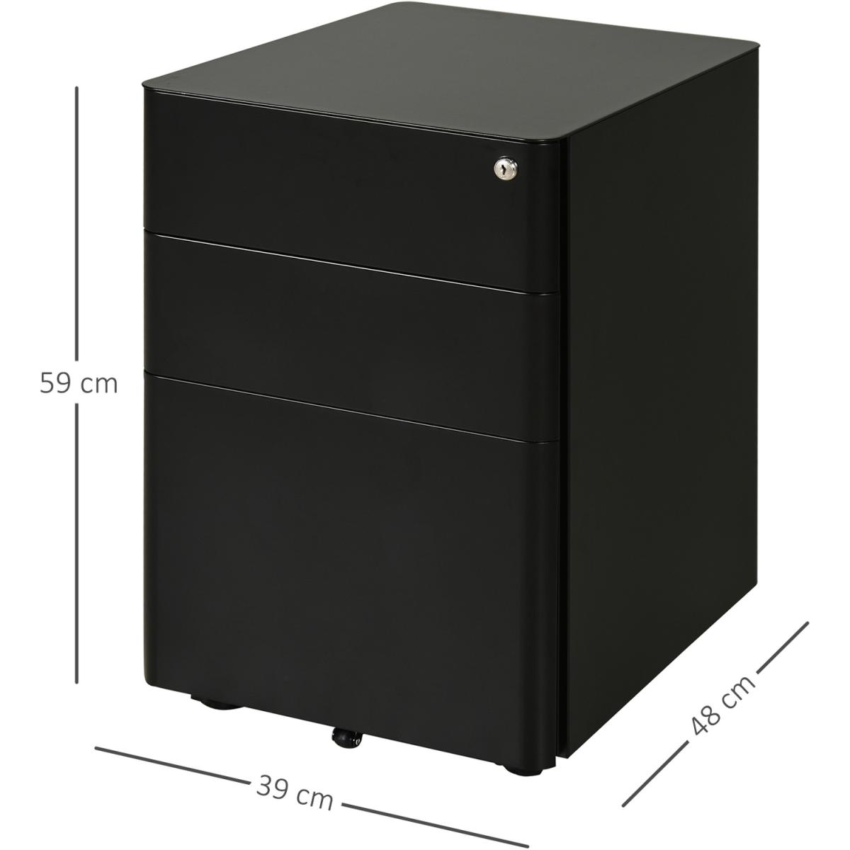 Keep your important paperwork organised and with this white metal filing cabinet from Vinsetto. Spacious in size, it features two small drawers and a large bottom drawer - perfect for all your paperwork and other office supplies. On the bottom, four omni-direction wheels are placed for you to move the unit around easily, and it is finished with a lock to keep everything safely secure when you're away.