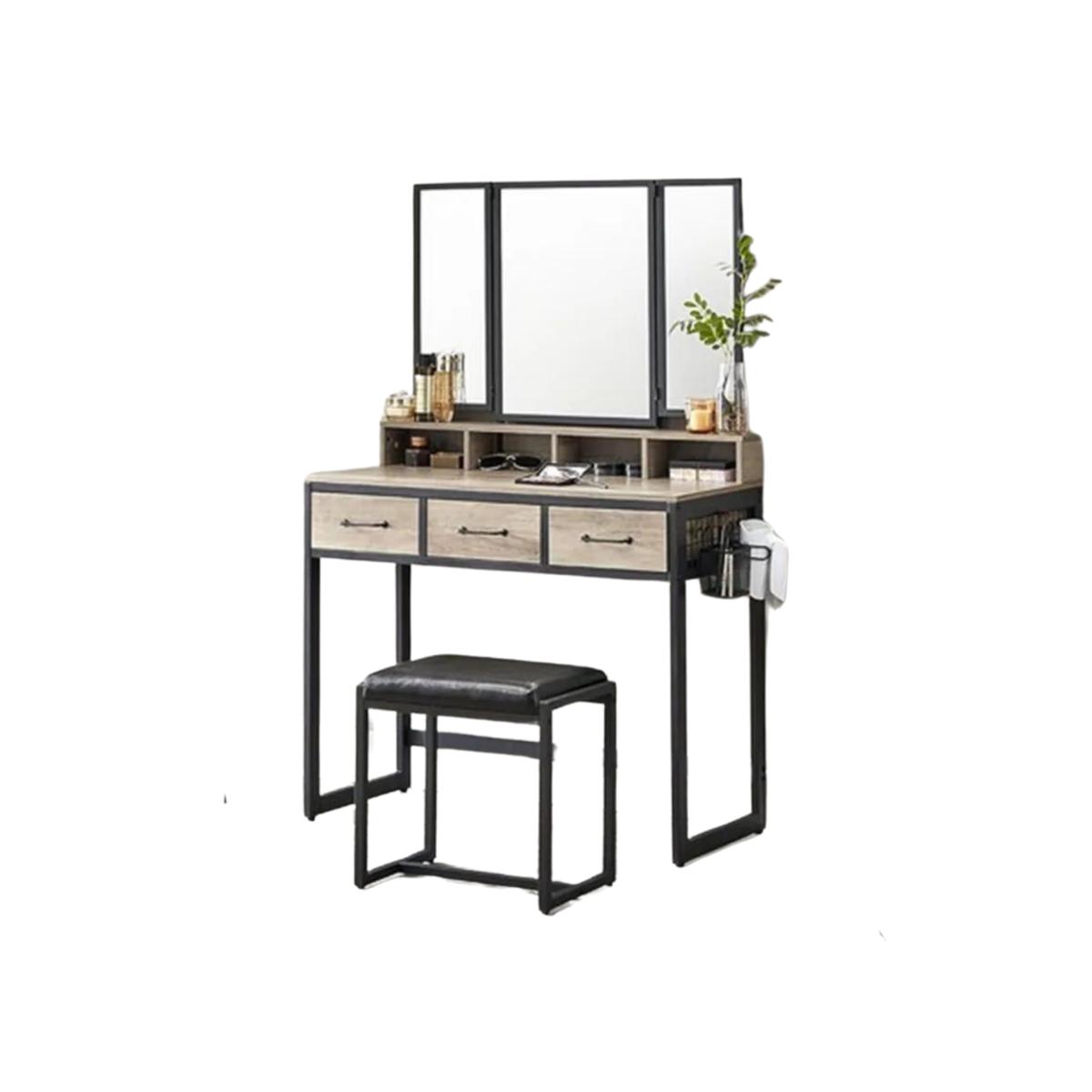This vanity table offers a variety of storage options, including 1 raised shelf for perfumes, 4 open compartments for lipsticks, 3 drawers for palettes and hair straighteners, and a large tabletop. Its dimensions are 90 x 40 x 141 cm (L x W x H), and the accompanying stool measures 42 x 28.6 x 42.5 cm (L x W x H). The clear and convenient tri-fold mirror enhances your makeup routine. The two side panels can be folded to allow you to check your makeup from different angles and achieve the perfect hairstyle with ease. Utilize the hooks behind the mirror to neatly organize your earrings, bracelets, and necklaces. Additionally, the vanity includes a designated container for a hair dryer and a brush holder. Prioritize safety with the included anti-tip kit, securing the dressing table with a mirror to the wall and creating a more secure environment. Weighing 25.7kg, this vanity boasts a static load capacity on the stool of 150kg, ensuring both durability and stability for your daily use.