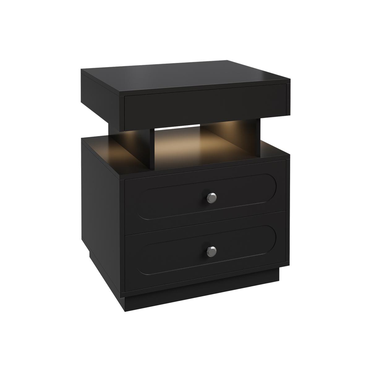 Brighten up your bedroom with this modern bedside cabinet featuring RGB lighting. Made from high quality E1 grade MDF, it has a smooth easy to clean surface for long lasting durability. Its compact design fits neatly into most spaces while providing generous storage. The layout includes three drawers and a central open shelf to keep essentials organised. A self-adhesive RGB light strip offers adjustable colours to create a warm inviting atmosphere. With its minimalist look, this piece combines style and practicality, making it perfect for storing books, decor, and everyday items.