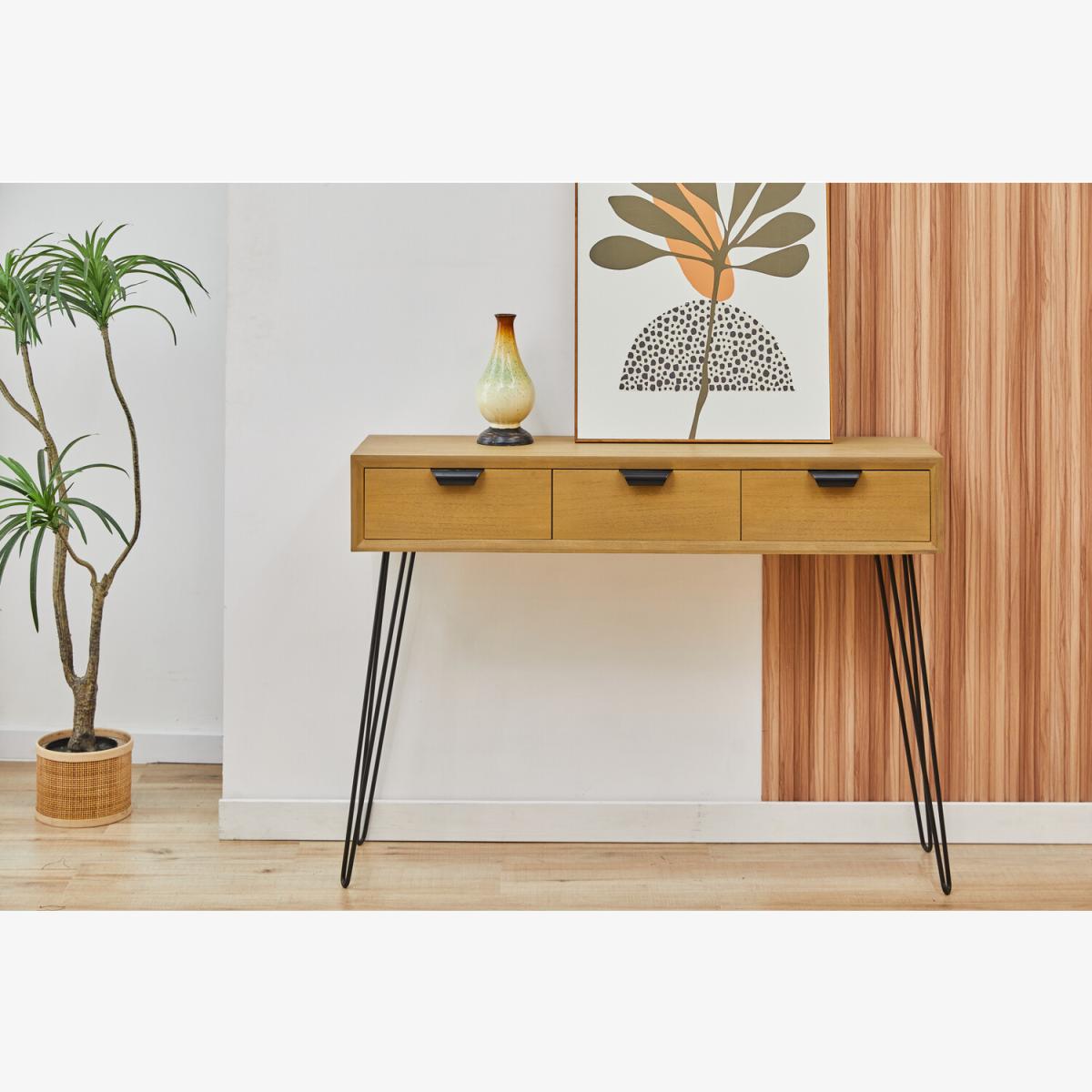 A simple yet stylish design, this 3-Drawer Oak Effect Desk provides the perfect place to work, study, game, or use as a decorative storage space. This beautiful oak-effect desk features three drawers for storing your files, gadgets, or accessories. The deep wood effect colour brings a traditional touch to your home whilst the contrasting black legs make this ideal for modern spaces in your living room, office, or bedroom.