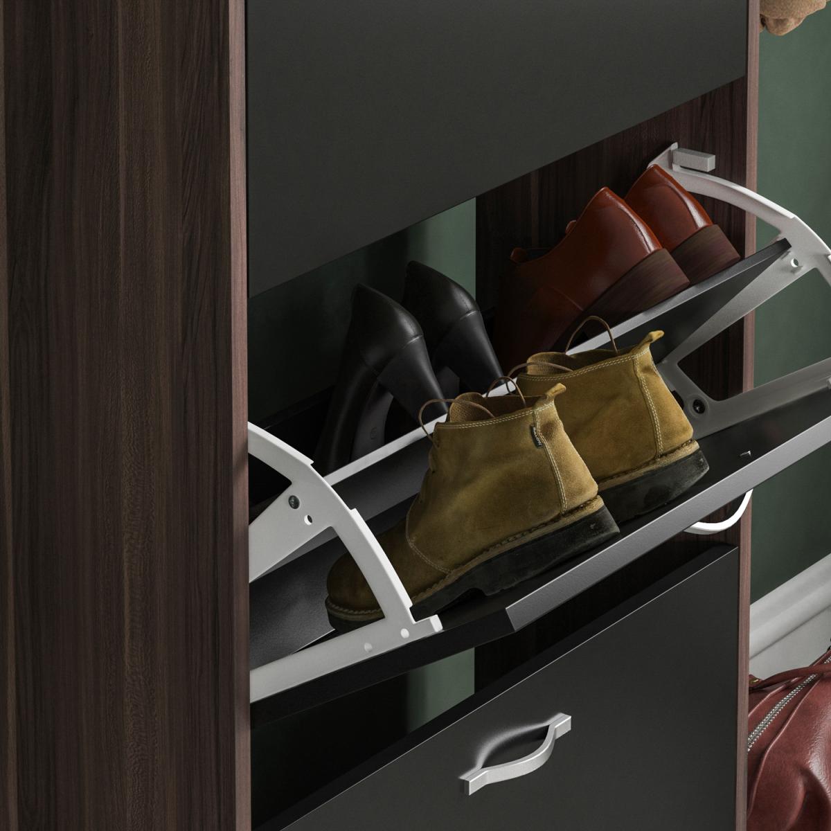 I’m a big fan of this slim three-drawer shoe unit for its neat, concealed storage and clean lines. The walnut frame teamed with black fronts adds warmth without feeling heavy, so it works equally well in a modern hallway, a minimalist bedroom or a Scandi-inspired mudroom. For styling, keep the top uncluttered with just a small tray for keys and maybe a potted plant or a low-profile mirror above to open up the space. If you need extra storage, slot slim baskets or magazine files on one side for umbrellas or shoe care products. The unit’s narrow depth makes it perfect for tight corridors, yet each flip-down drawer easily holds three pairs of shoes.