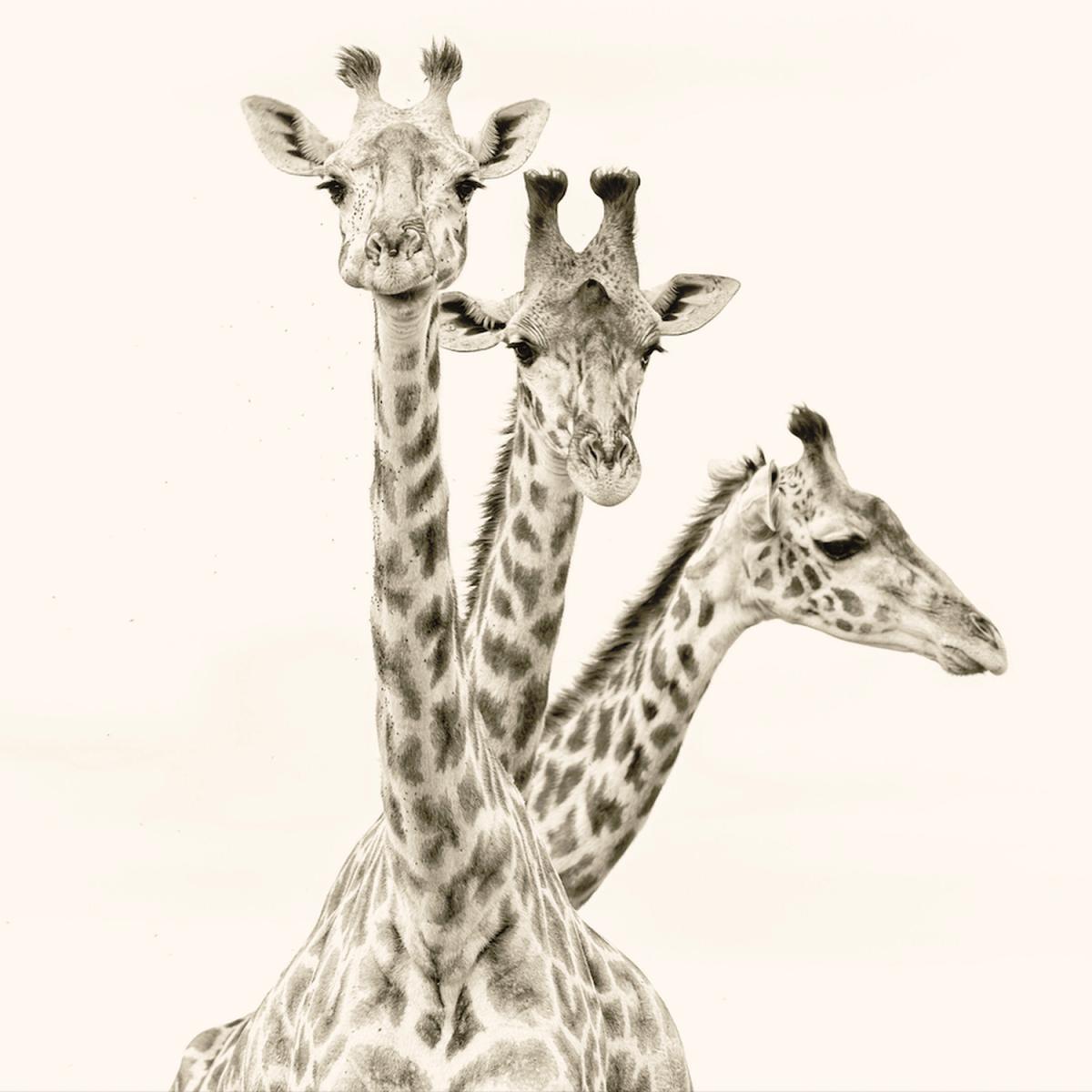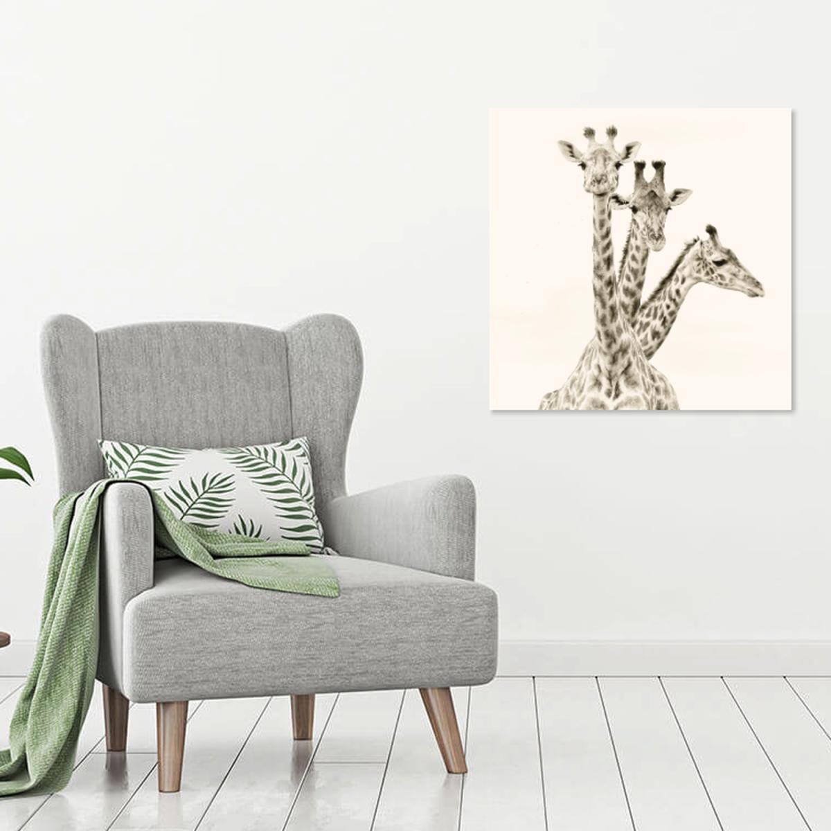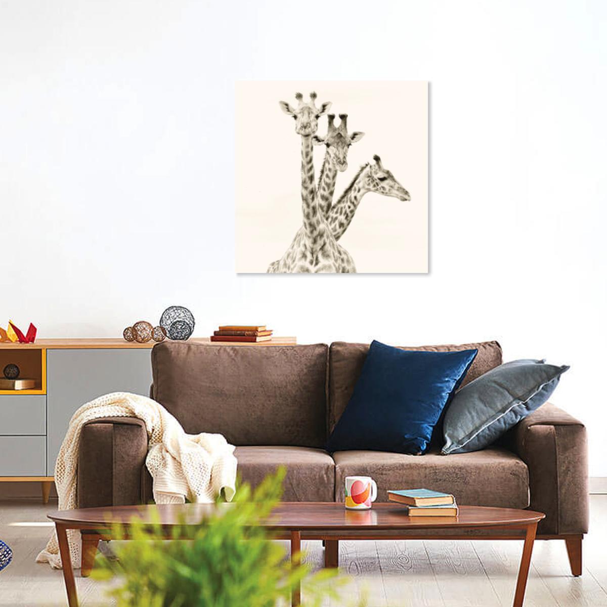 Three giraffes together on this unique canvas print. Fun, unique and interesting canvas wall art. Looks great in almost any room, and the giraffes also add a bit of fun to a room.
