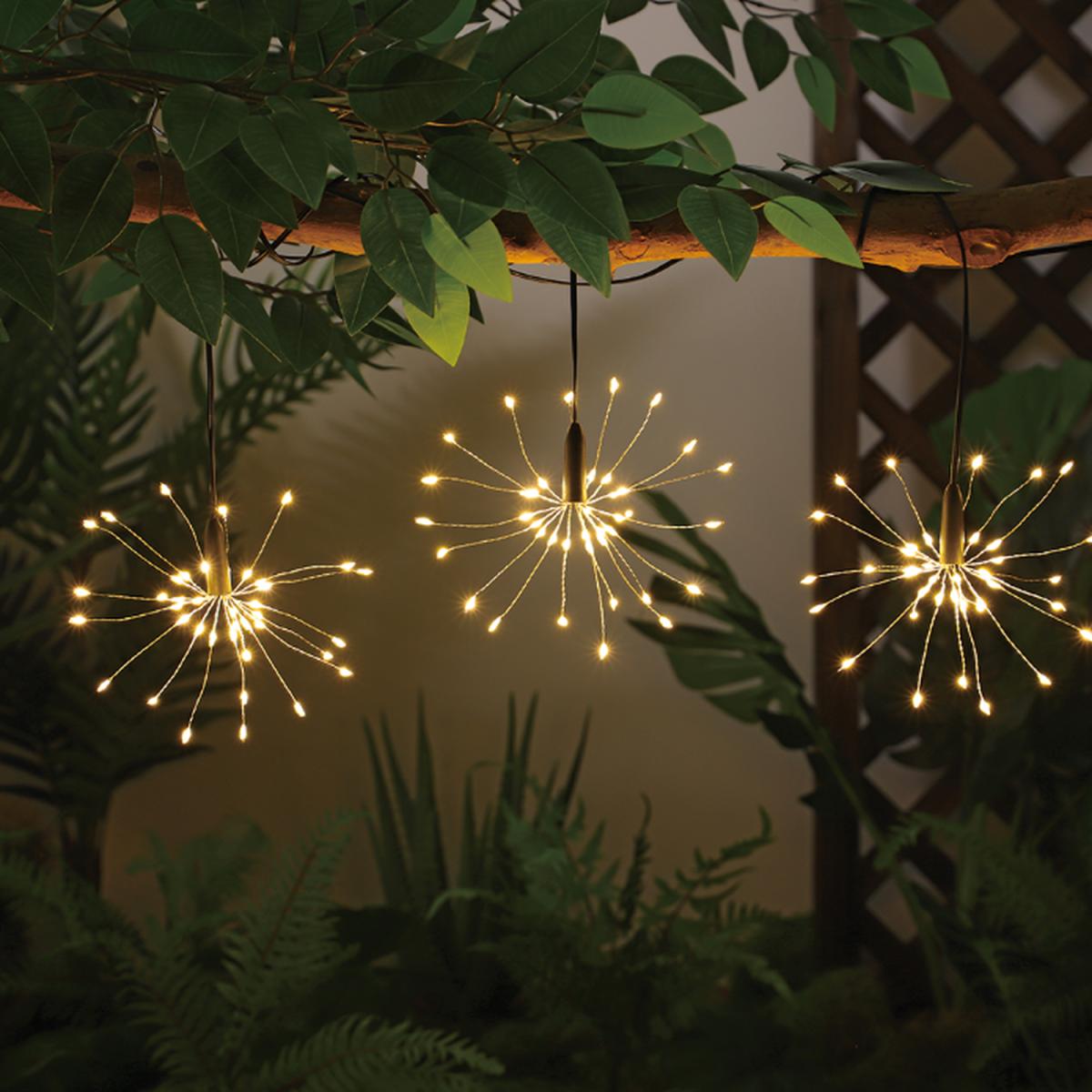 Illuminate your outdoor space with these best-selling twinkling solar burst lights that will look stunning hung from trees, pergolas and other outdoor features. As night falls, your garden will come alight with these quirky pendant lights, which are guaranteed to impress any visitors with their magical glow. These are Warm Led White Lights that automatically turn on at dusk. They come as a pair of 3 and can be placed anywhere outside your home.