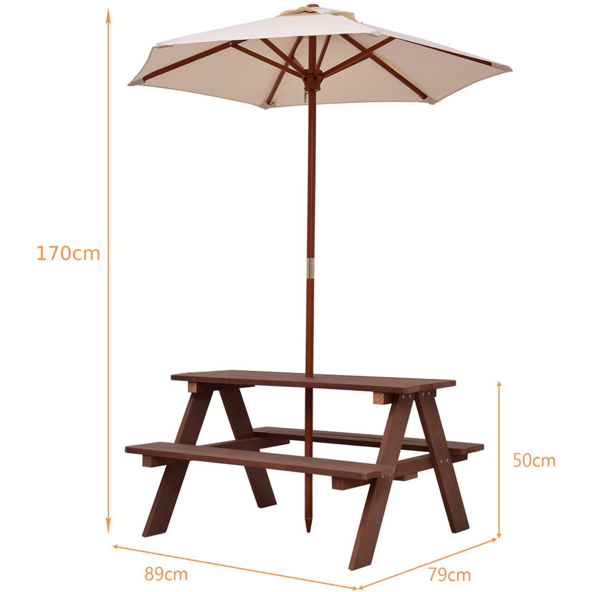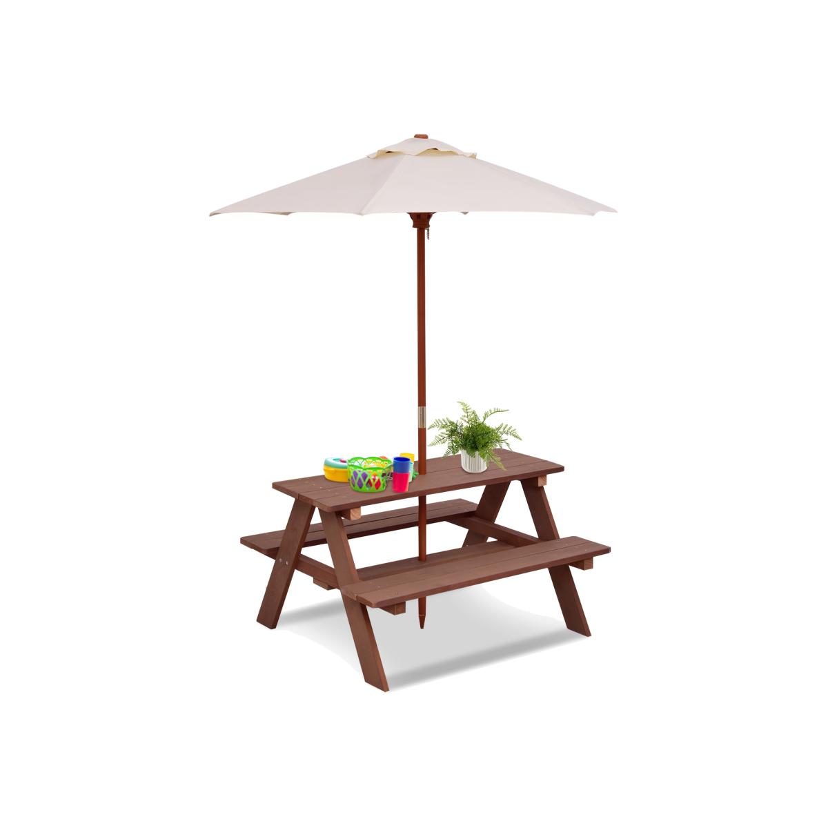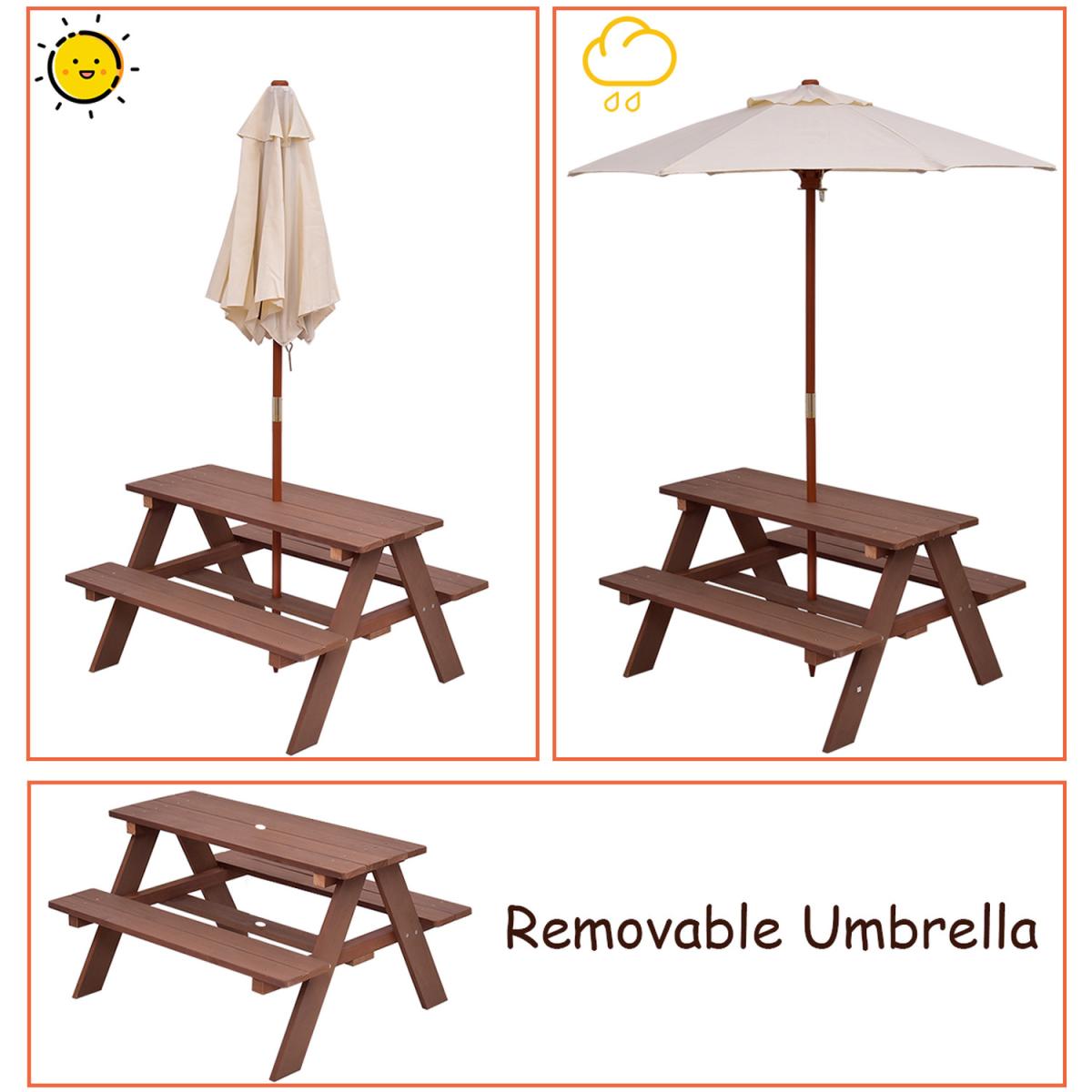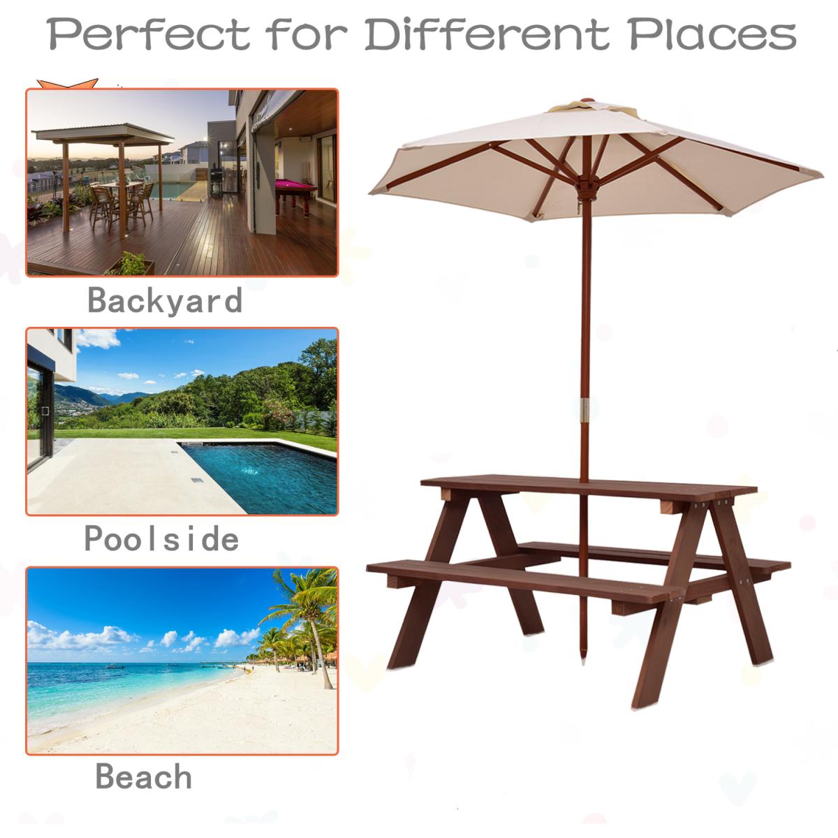 This 4-seat kids picnic table will be your kid's good companion during indoor and outdoor activities. Equipped with a removable and foldable umbrella, the picnic table is suitable to be used on multiple occasions. It is supported by thickened and upgraded frame for super stability and better durability. And the high-quality fabric canopy is resistant to water and sunlight, providing a comfortable environment for your kid. What's more, kids can use it as a learning table or a craft table without an umbrella. What an ideal portable table!