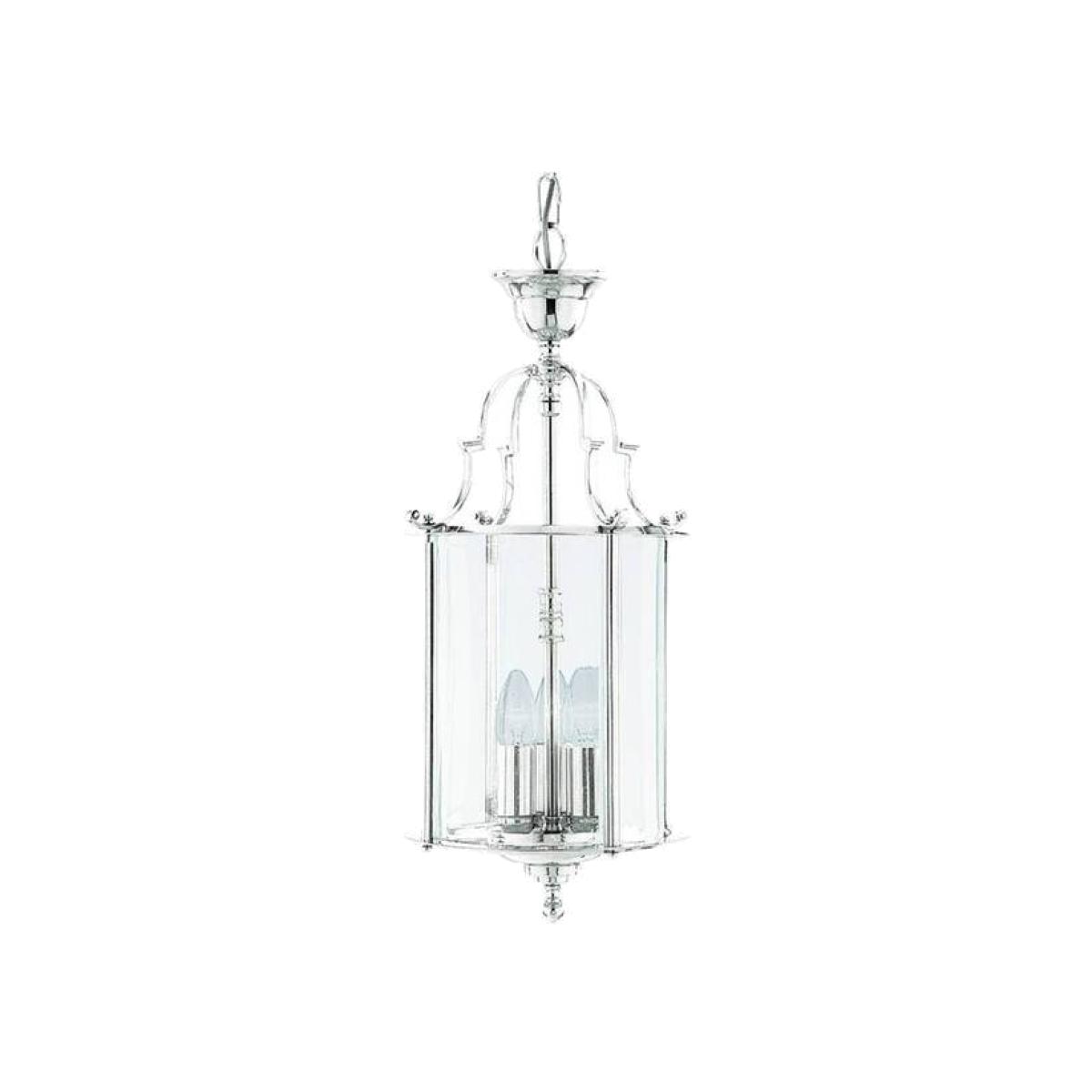 This lantern is available in both chrome and polished brass finishes. The fitting has a detailed design, with the extra twist in the top arms. The three lamps are surrounded with bevelled glass, which allows the light to shine through perfectly, spreading light throughout the entire room. This lantern fitting is a very effective light fitting, while adding to the classic style decor of the room.