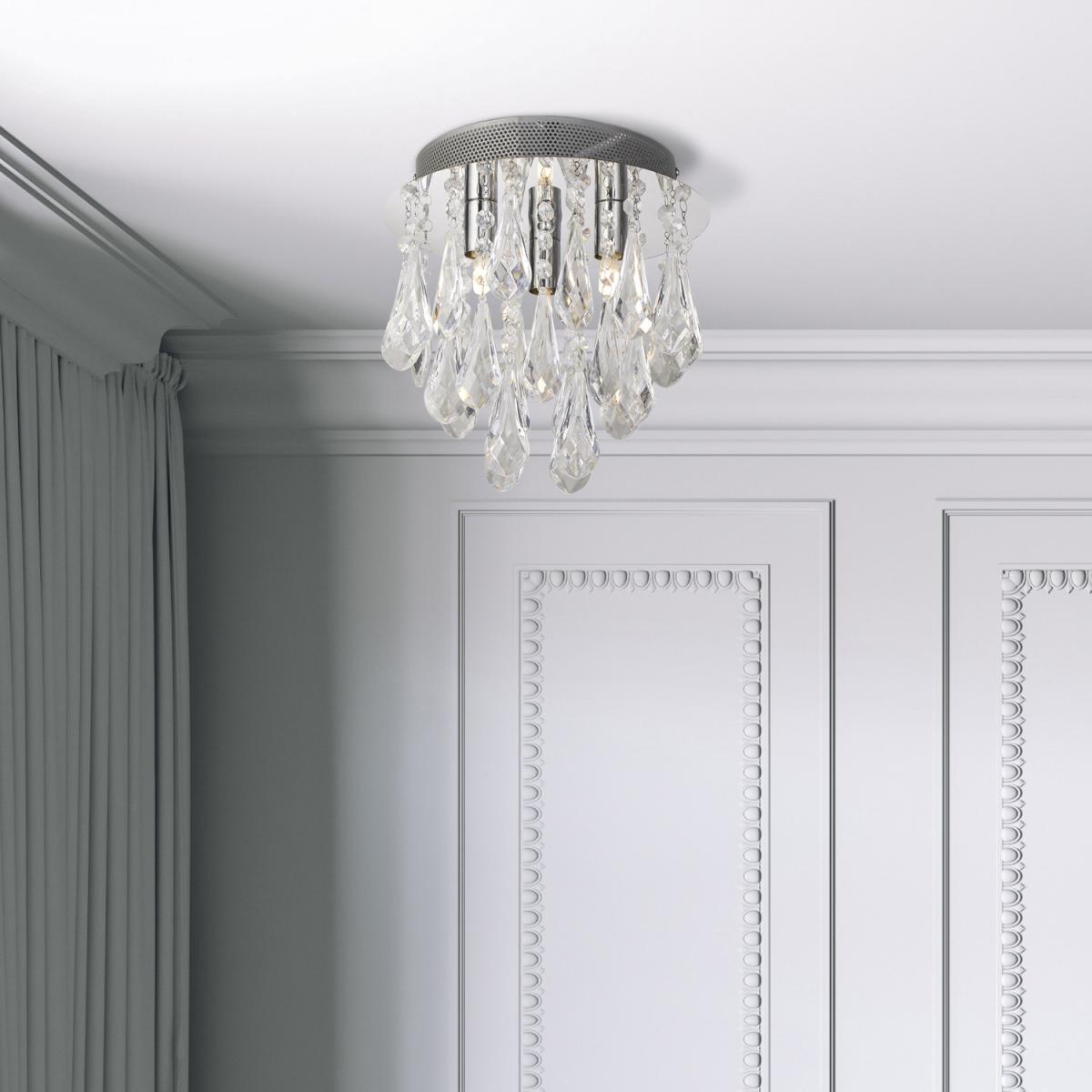 I love this small ceiling light for its sleek, modern chrome finish paired with elegant crystal drops, making it a versatile choice for many interiors. It works particularly well in contemporary or transitional spaces, adding a touch of sophistication without overwhelming the room. Practical styling tips include placing it in smaller dining areas, bedrooms, or hallways where a statement piece can elevate the overall look. To maximise its impact, pair it with minimalist furniture and neutral colour schemes, allowing the crystals and chrome to stand out. Its compact size and reflective surfaces make it ideal for adding subtle glamour and light to any room without dominating the space.