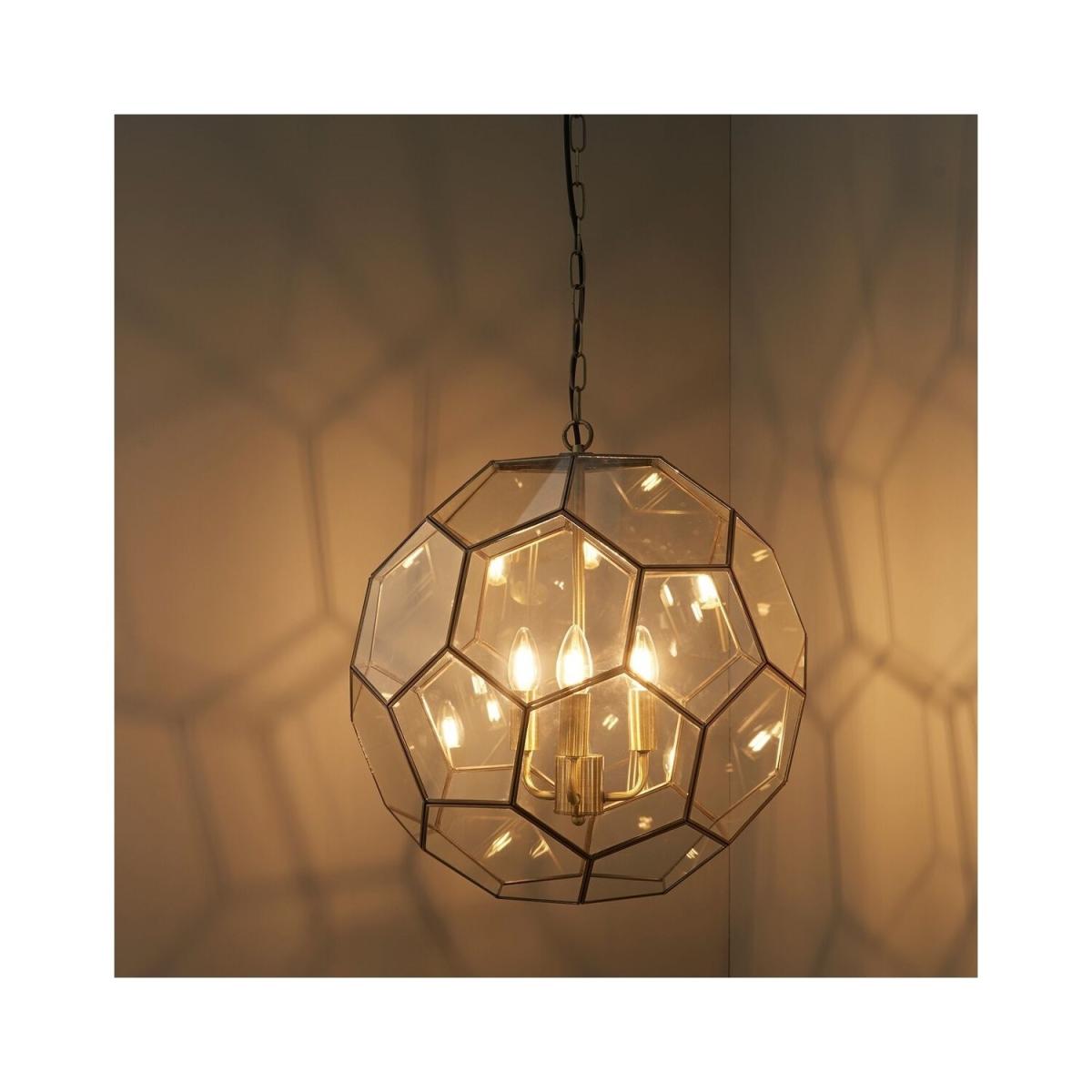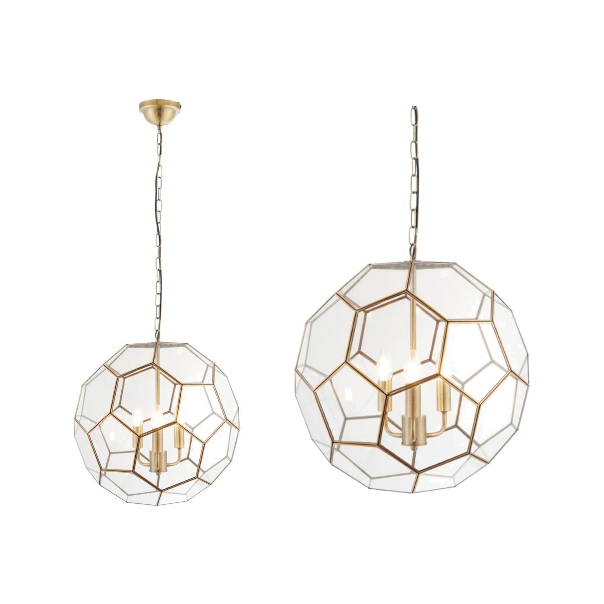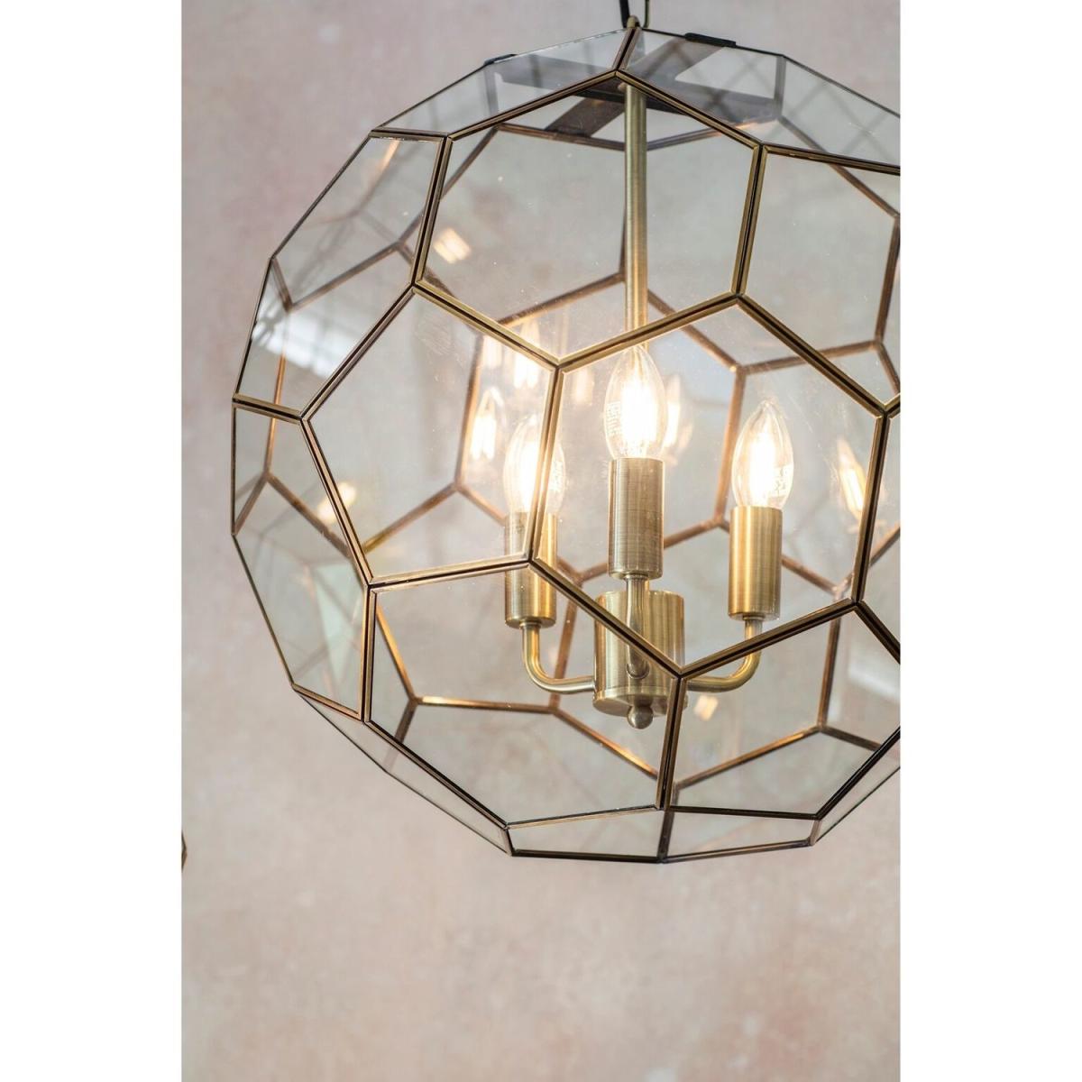 Dimensions W47 x H60 x D47 cm. The Miele 3-light chandelier is a combination of hexagonal glass panels surrounded by antique brass edging. A stunning light design will be cast on surrounding walls and ceilings when lit. Features. Constructed from steel and glass Brass plate and clear glass finishLE D compatibleDimmable. Also available in a 1-light design Assembly required..